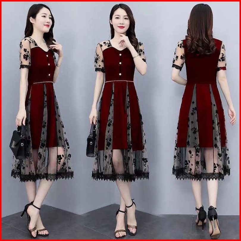 Readydress Brokat Maroon Korea Terbaru Dress Pesta Mewah Elegan Premium