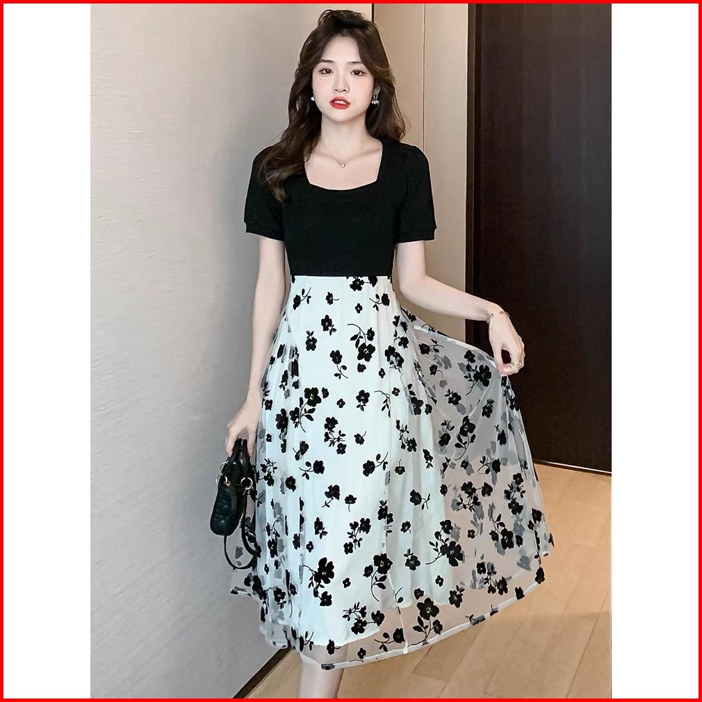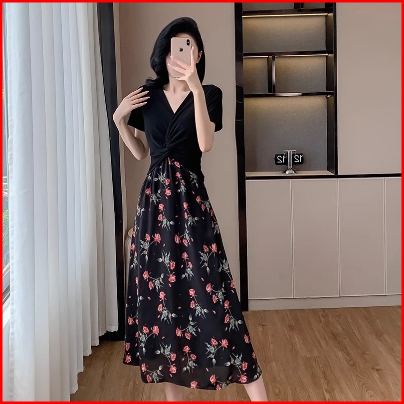 Emita Bloom Baju Pantai Wanita Floral Dress Hitam Panjang Party Elegan Midi Dress Jumbo Korean Style Aesthetic Bigsize D