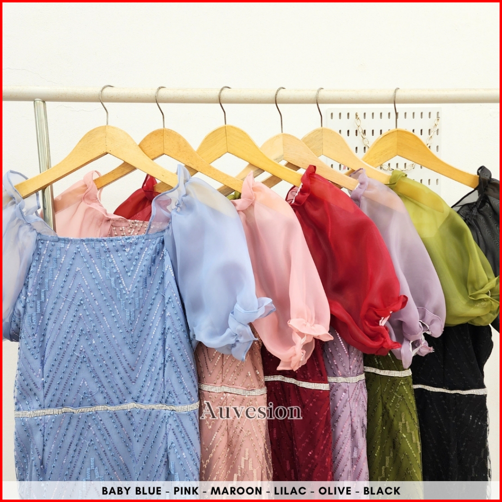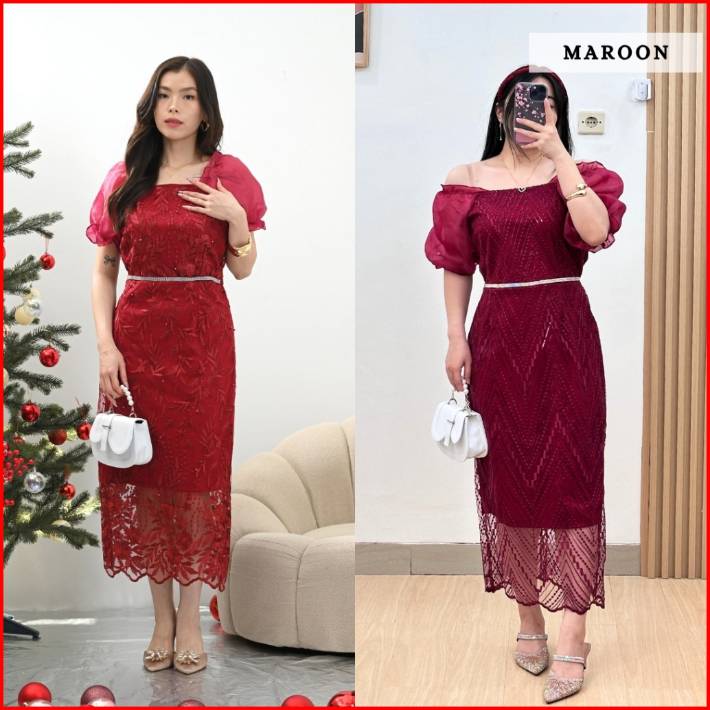 Auvesion Meral Square Neck Slit Brukat Midi Dress Brukat 6030 Dress Natal Gaun Wanita Elegan