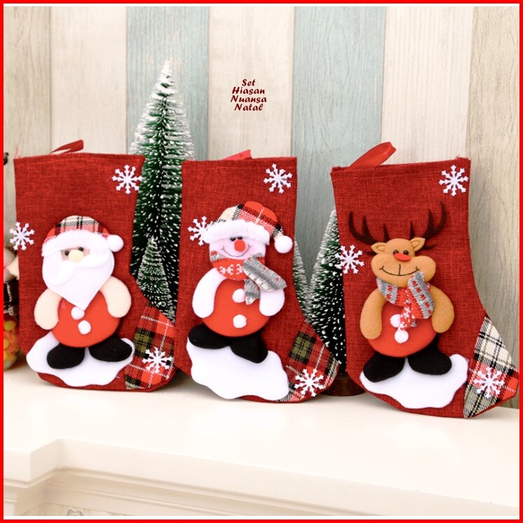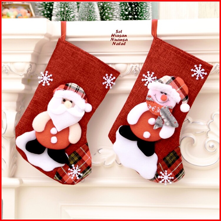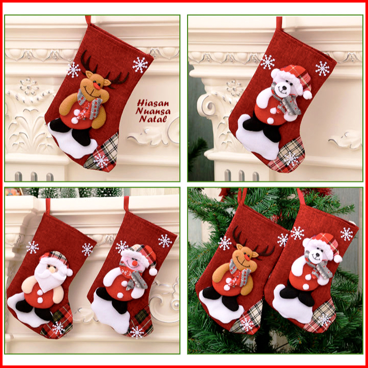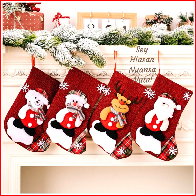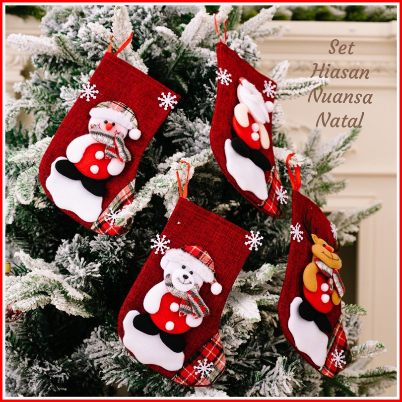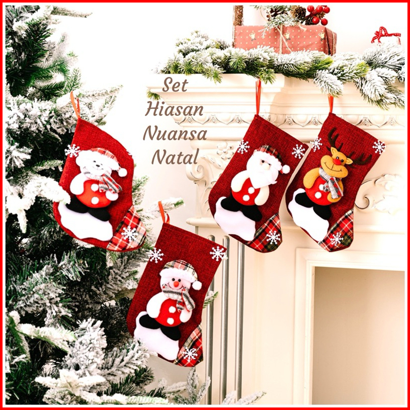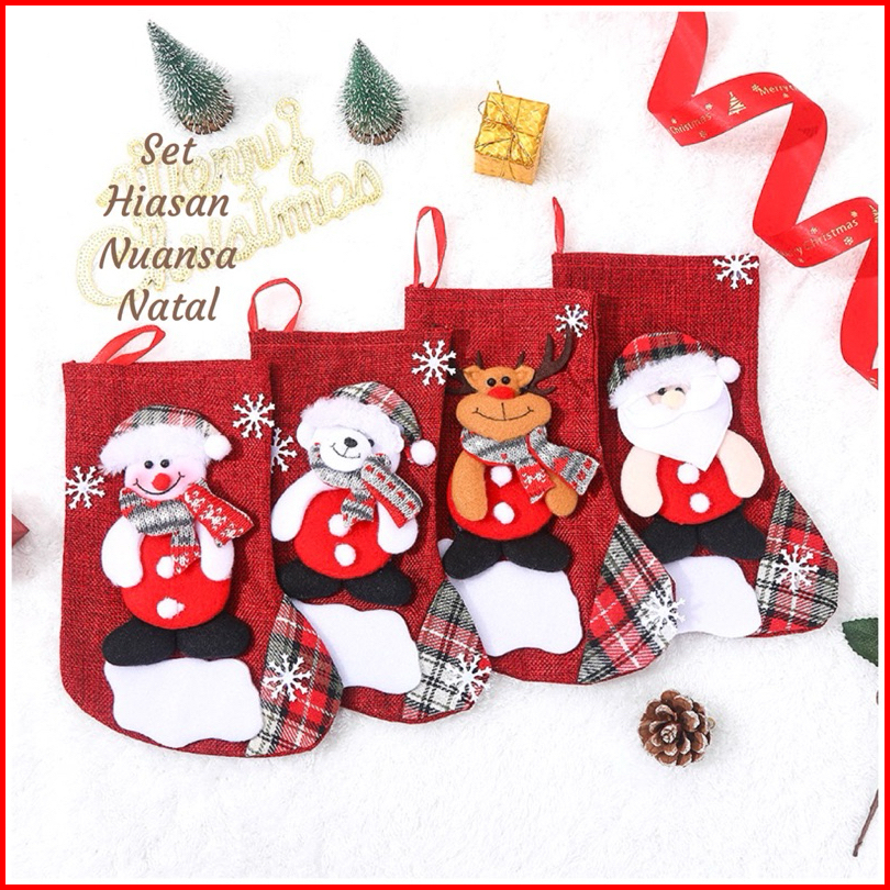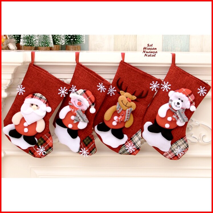 Isi 4 Motif Hiasan Natal Set Kaos Kaki Full Red Kaos Kaki Santa Ukuran Besar Christmas Decoration Gantungan Pohon Natal