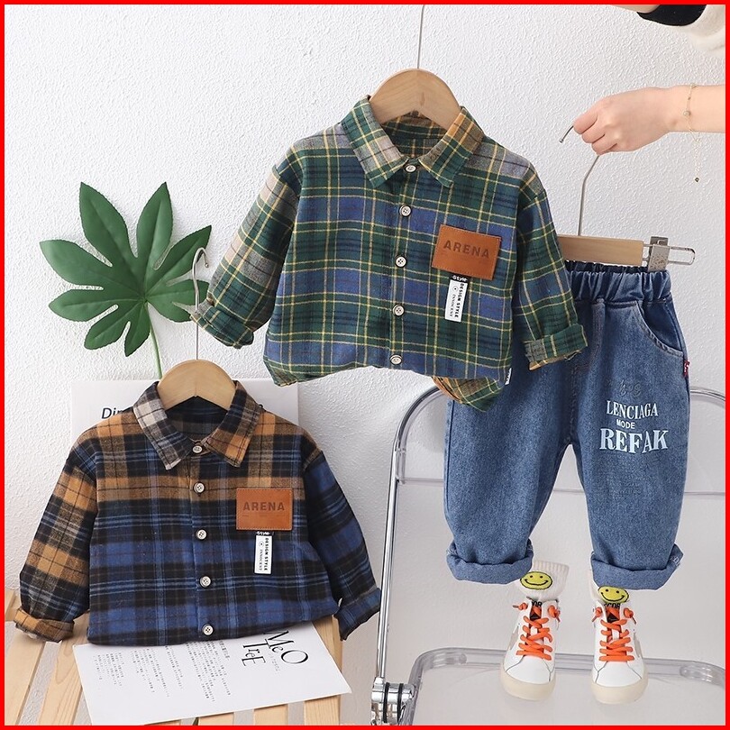 Setelan Kemeja Anak Laki Laki Import Setelan Kemeja Motif Kotak Kotak Biru Anak Balita Impor Stelan 2pcs Kemeja Motif Ta