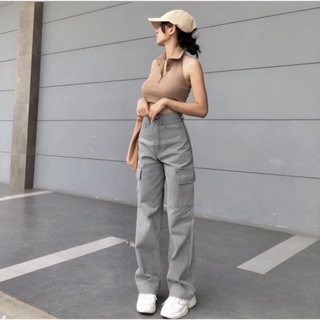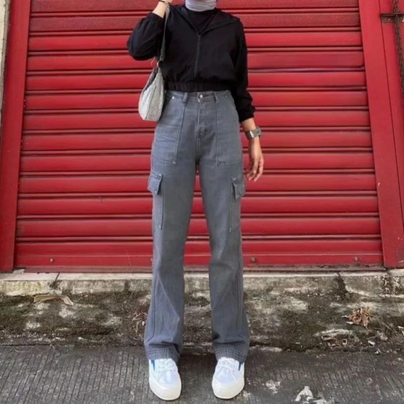 (Gratis Ongkir) Celana Jeans Wanita - Highwaist Cargo Jeans Wanita - Celana Jeans Kargo Kantong Samping Premium
