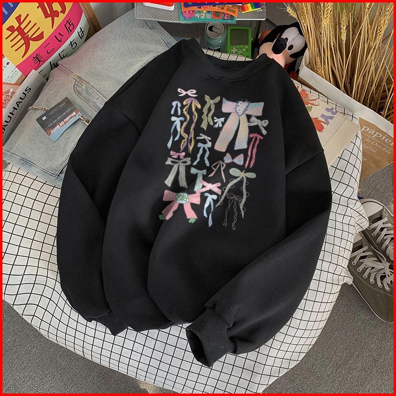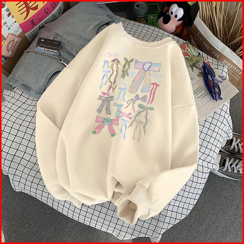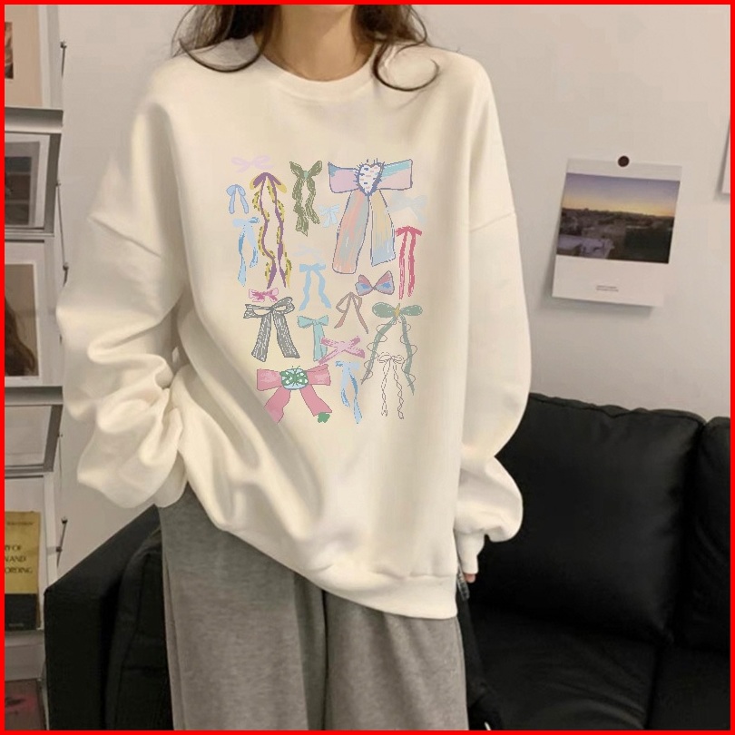 Forteid Sweater Lengan Panjang Oversized Street Style Korean Style Switer Wanita Oversize Kaoscetakan Busur Merah Mudako