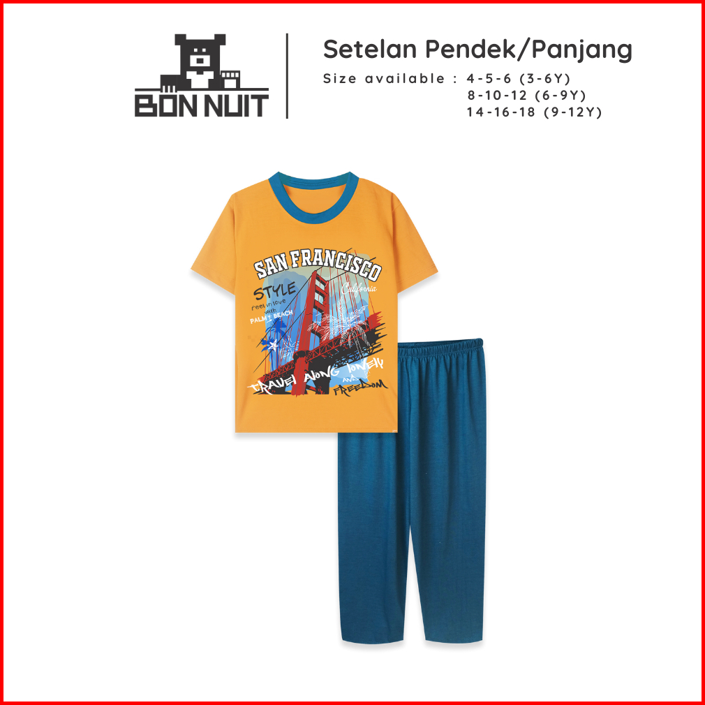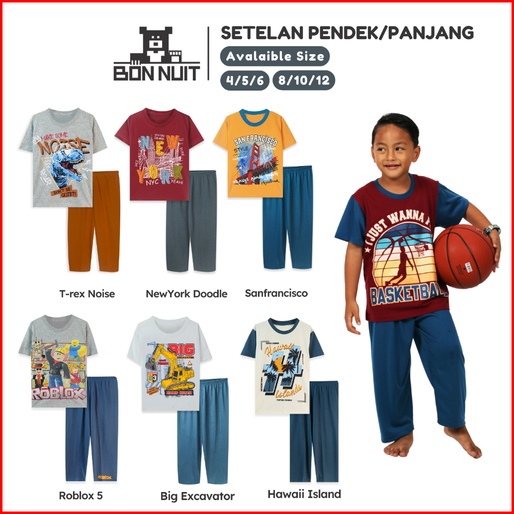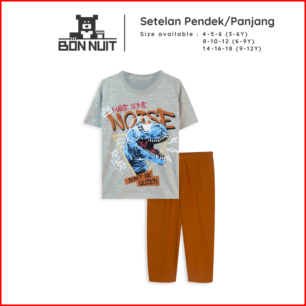 Bonnuit - Setelan Tanggung Piyama Pendek Celana Panjang Anak Laki Laki T-rex Noise Series Usia 9-12 Tahun