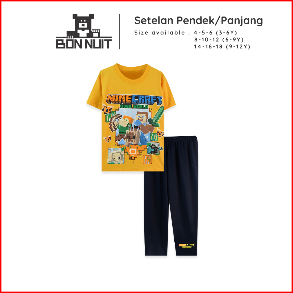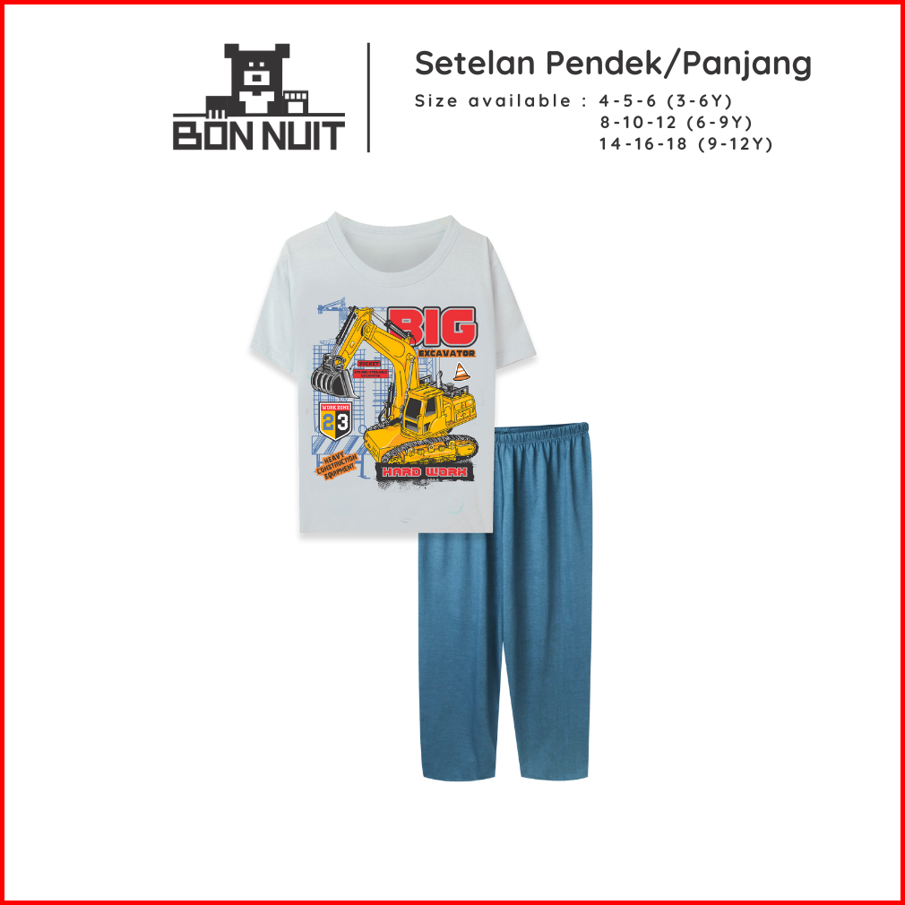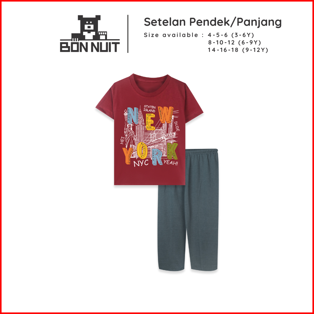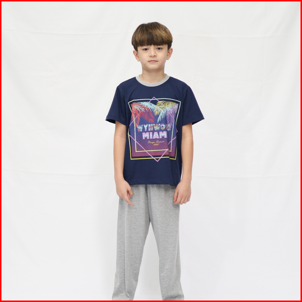 Bonnuit - Setelan Tanggung Piyama Pendek Celana Panjang Anak Laki Laki T-rex Noise Series Usia 9-12 Tahun