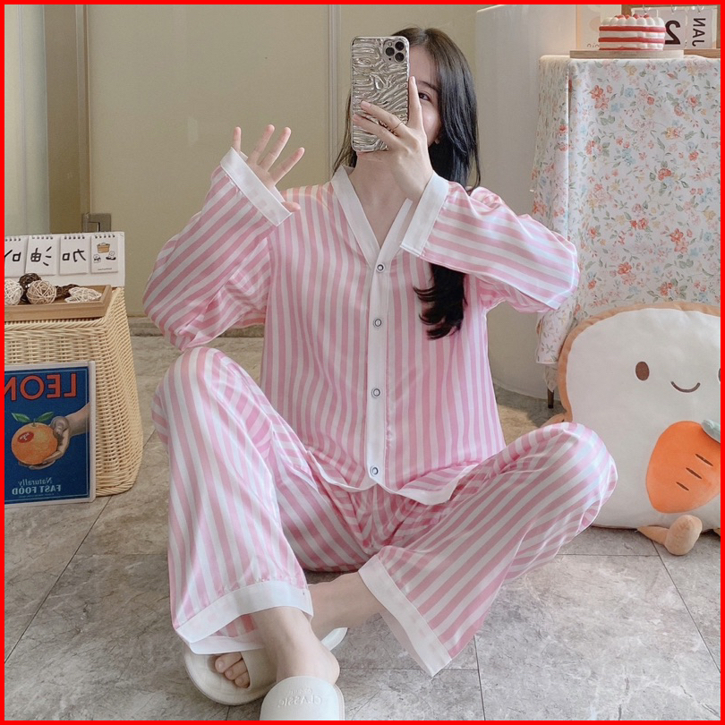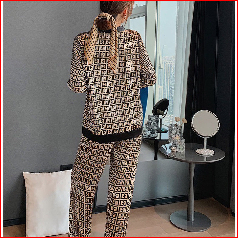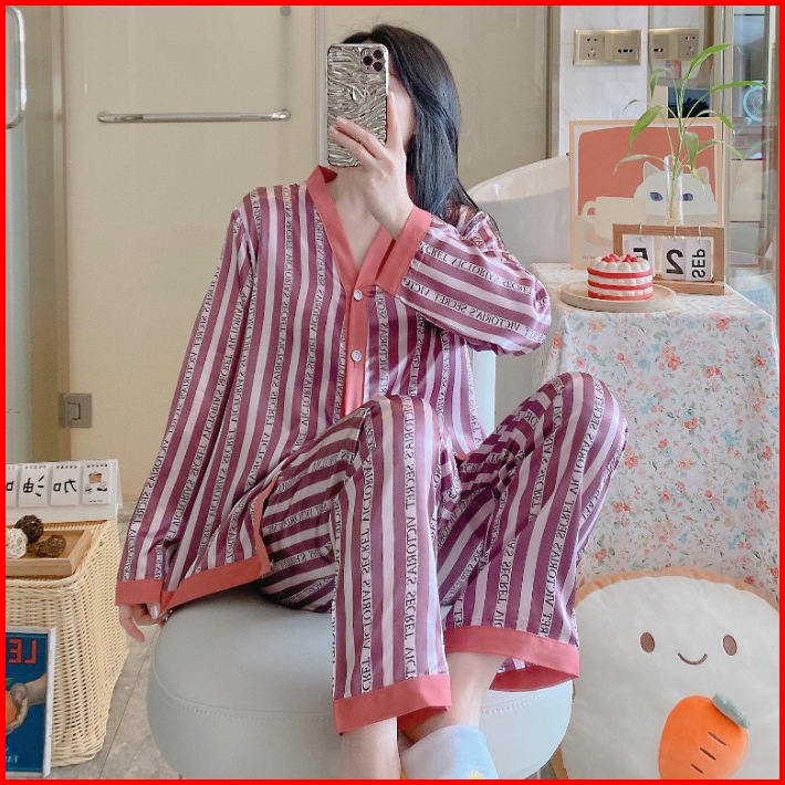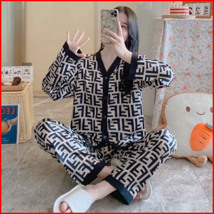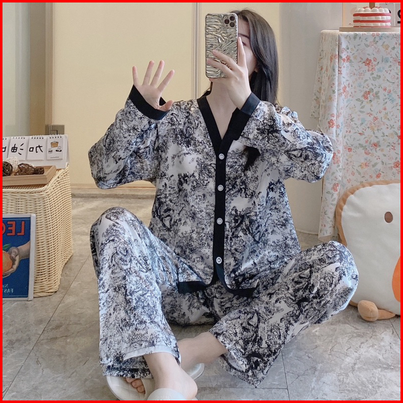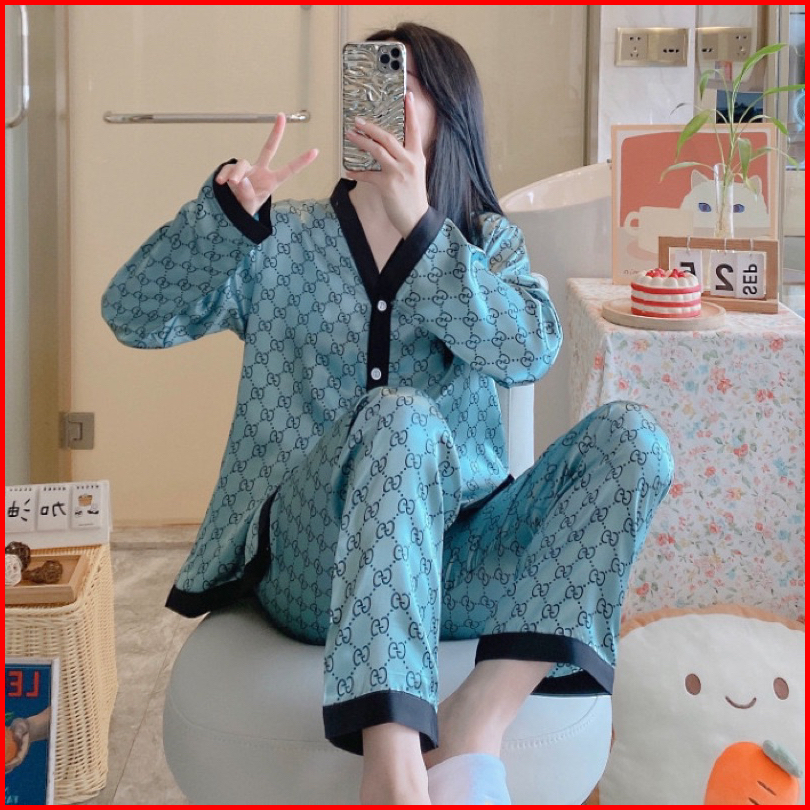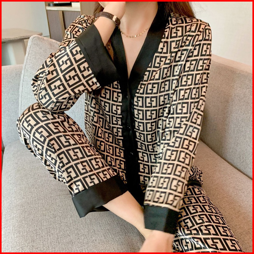 06 Sleepwear Luxury Sleepwear Kelas Atas Piyama Satin Lengan Panjang Celana Panjang Motif Kancing Hidup Bahan Satin High