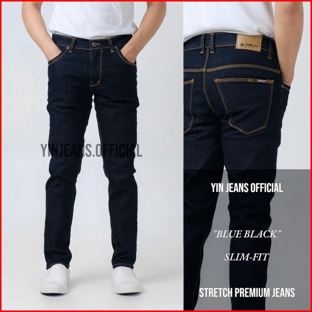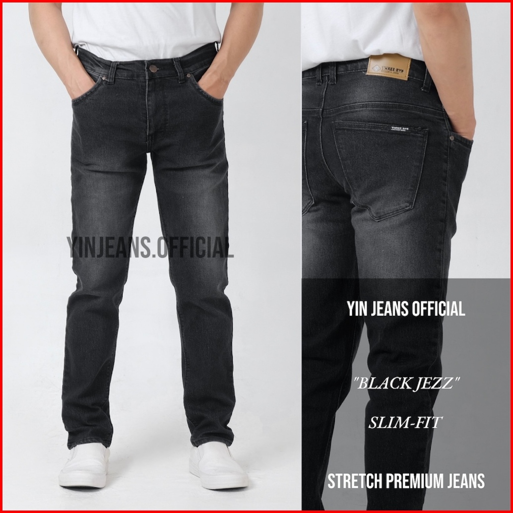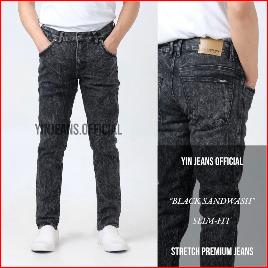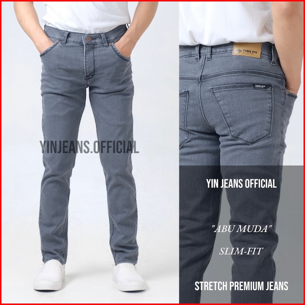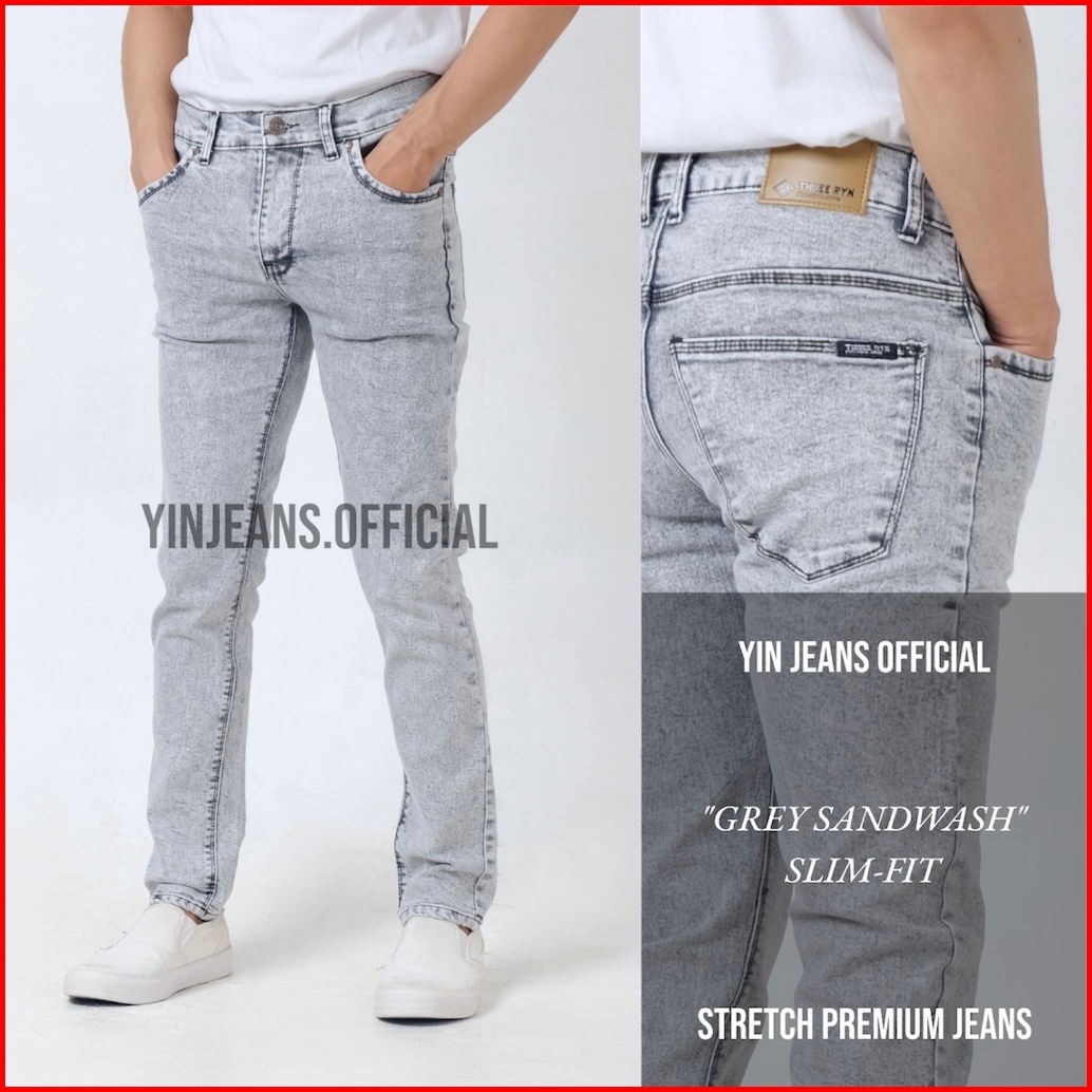 Celana Jeans Pria Panjang Bahan Stretch Tebal Melar Cowok Denim Slim Fit Laki Putih Grey Sandwash Abu Bintik Cerah