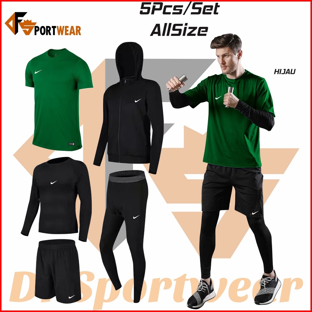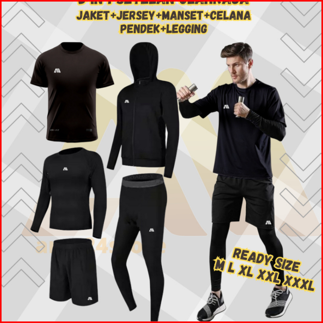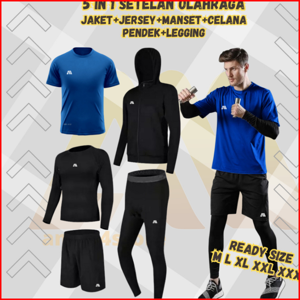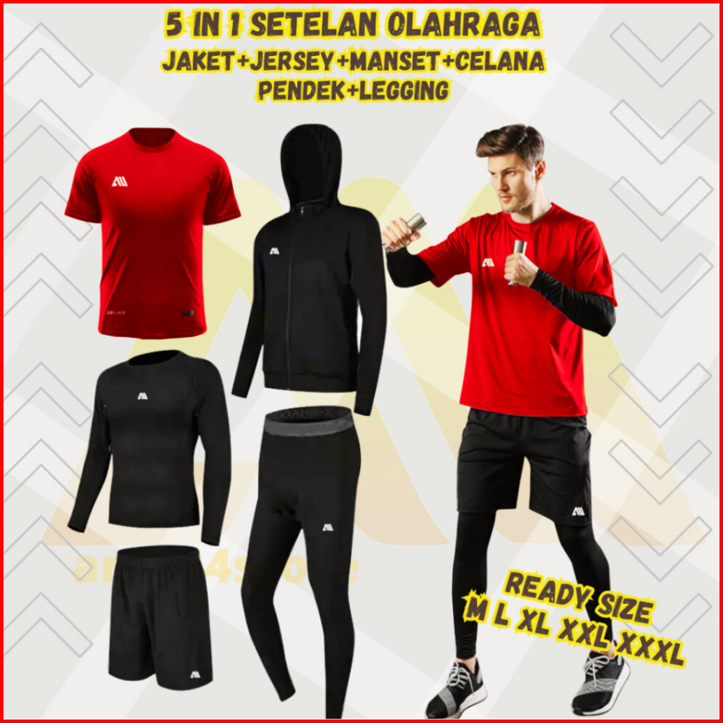 Stelan Olahraga Pria 5in1 Jaket Hodie Kaos Manset Jersey Celana Dryfit Manset Legging