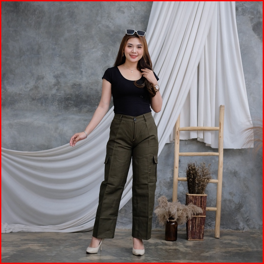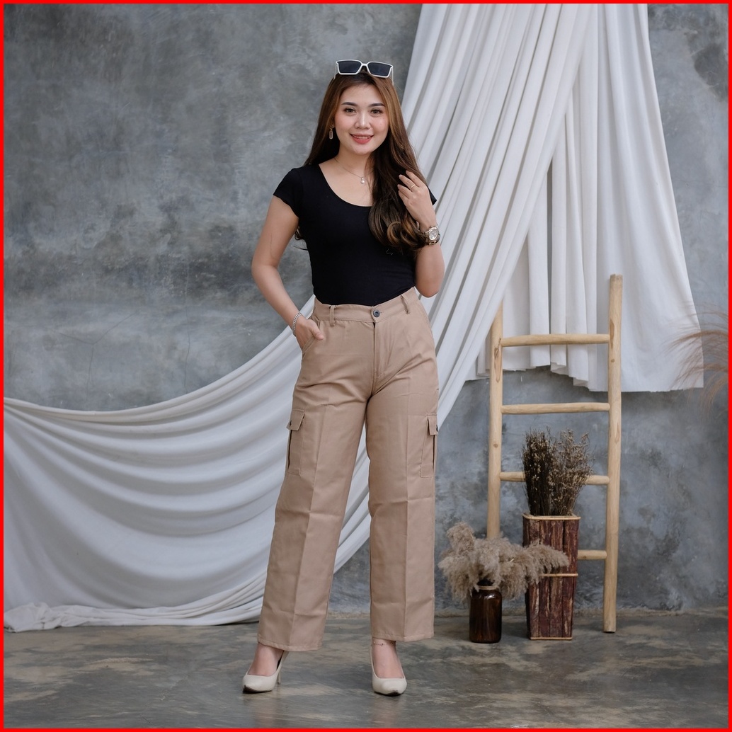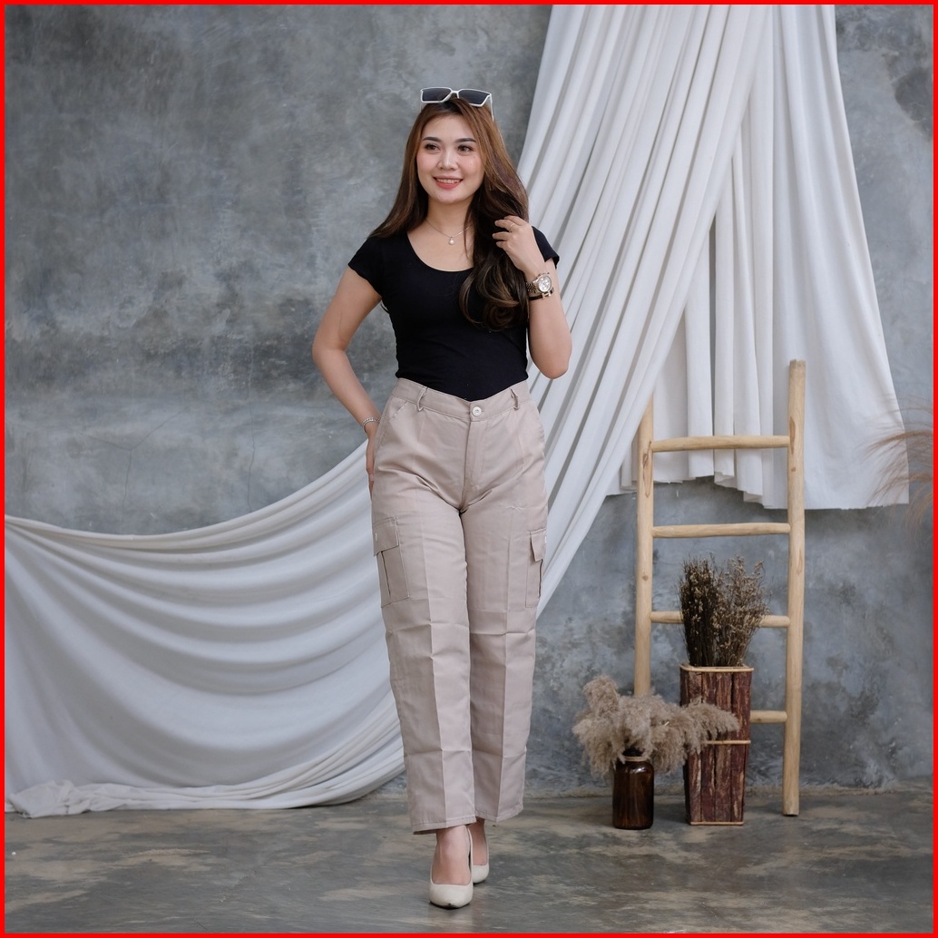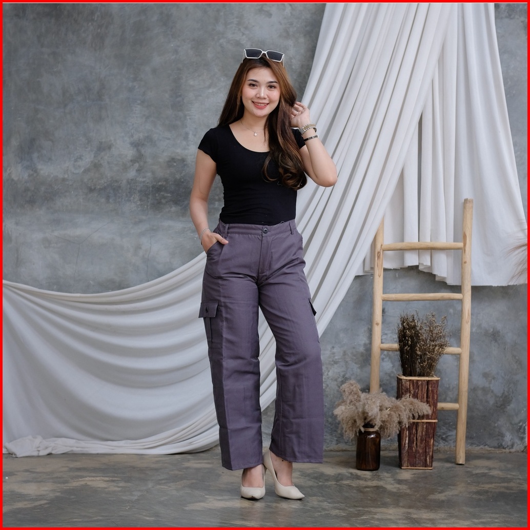 Celana Premium Cargo Pants Wanita Highwaist Kasual Kekinian Korean Style Celana Panjang Kulot Catton Drill