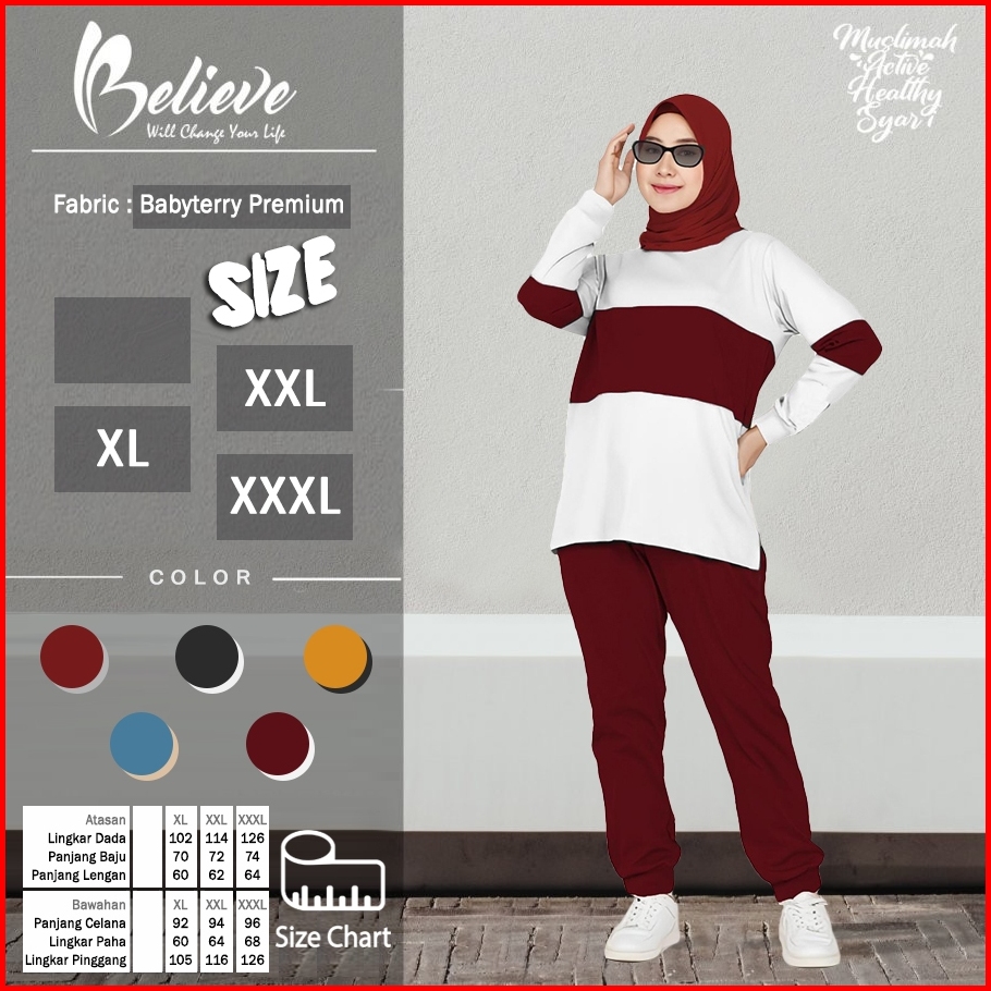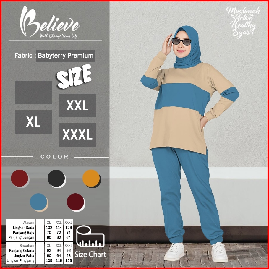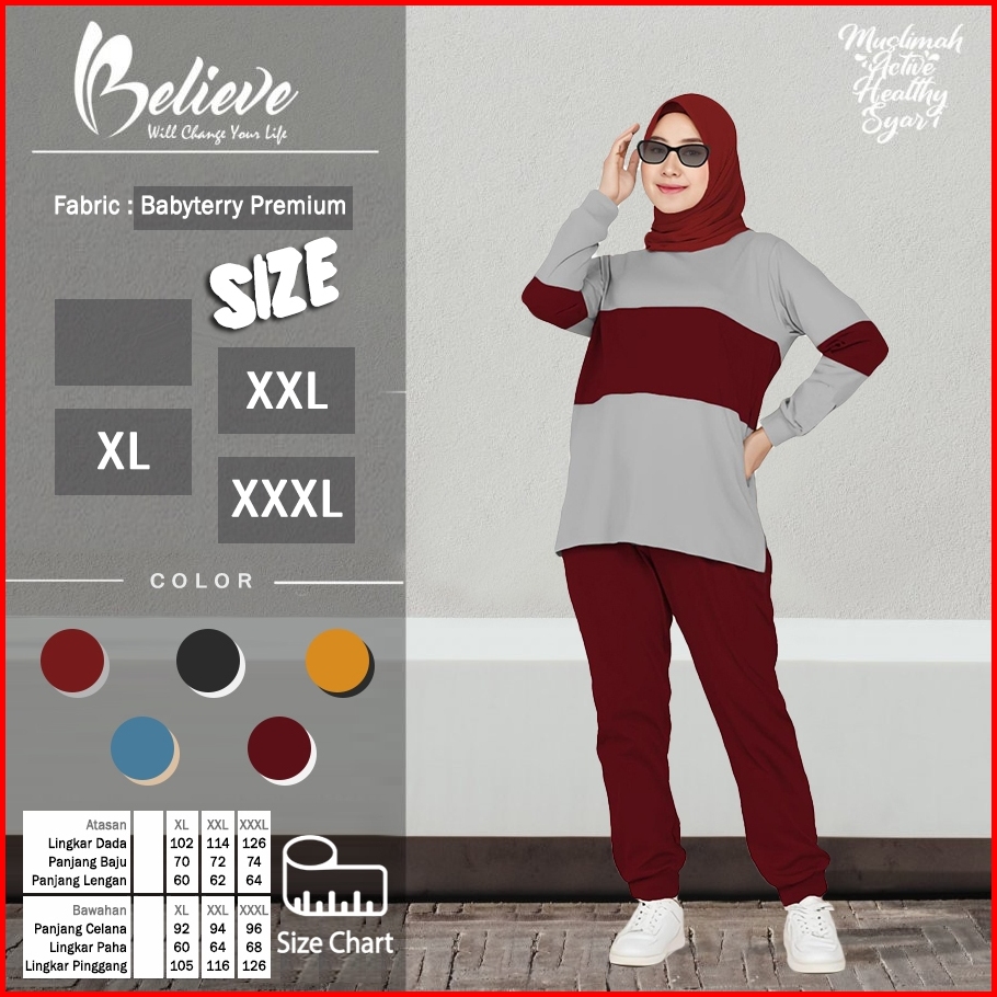 Cmb Set - Babyterry Setelan Kaos Olahraga Muslimah Kombinasi Warna Training Senam Wanita Lengan Panjang Jumbo Big Size X
