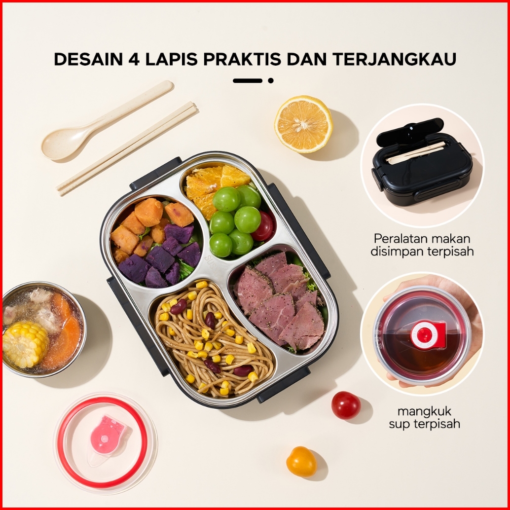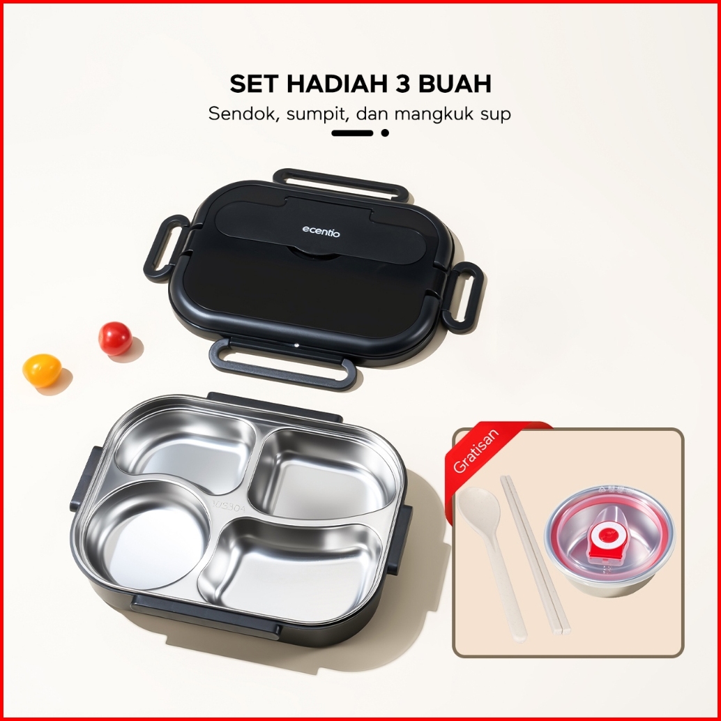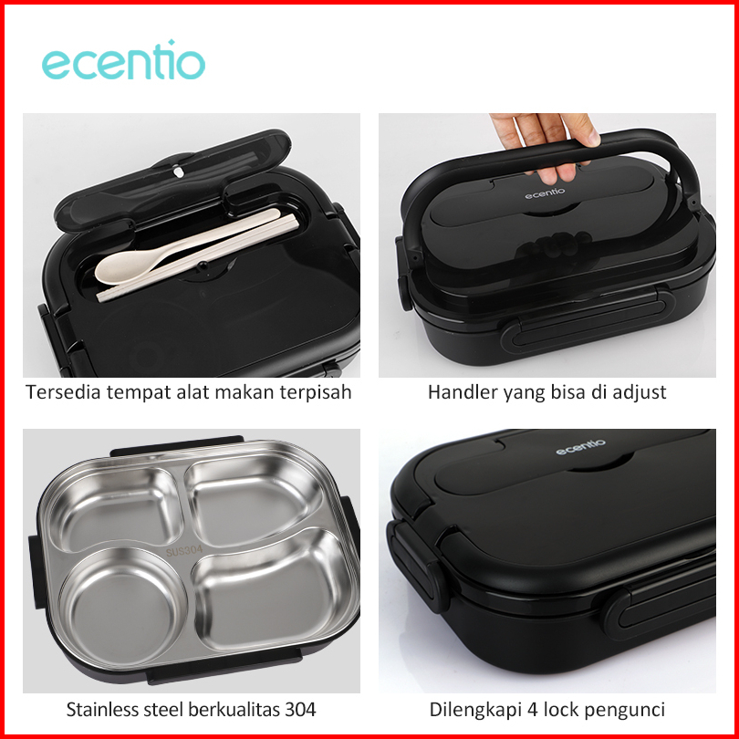 Set Stainless 304 Ecentio Anti Tumpah Kotak Makan Set 304 Stainless Steel 4 Sekat Tempat Makan Tahan Suhu 1l 1.2l 1.5l F