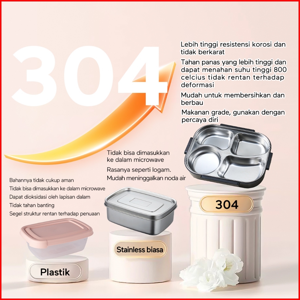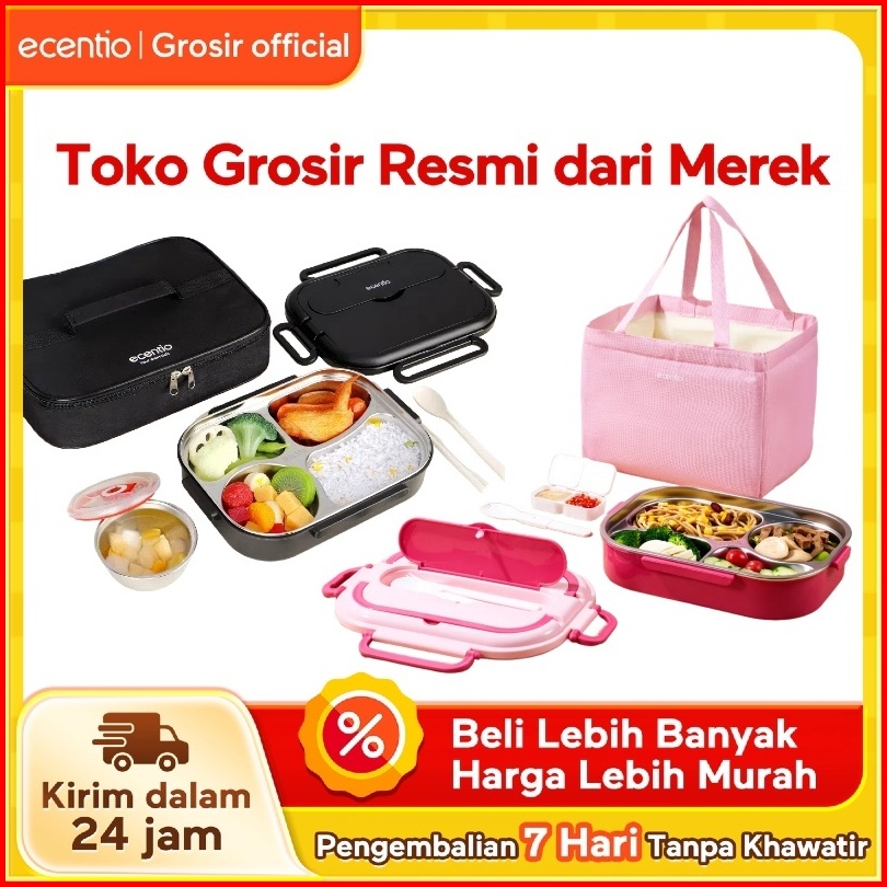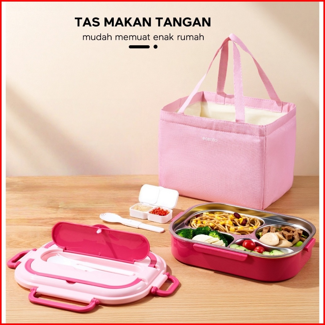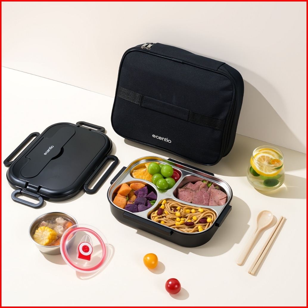 Set Stainless 304 Ecentio Anti Tumpah Kotak Makan Set 304 Stainless Steel 4 Sekat Tempat Makan Tahan Suhu 1l 1.2l 1.5l F