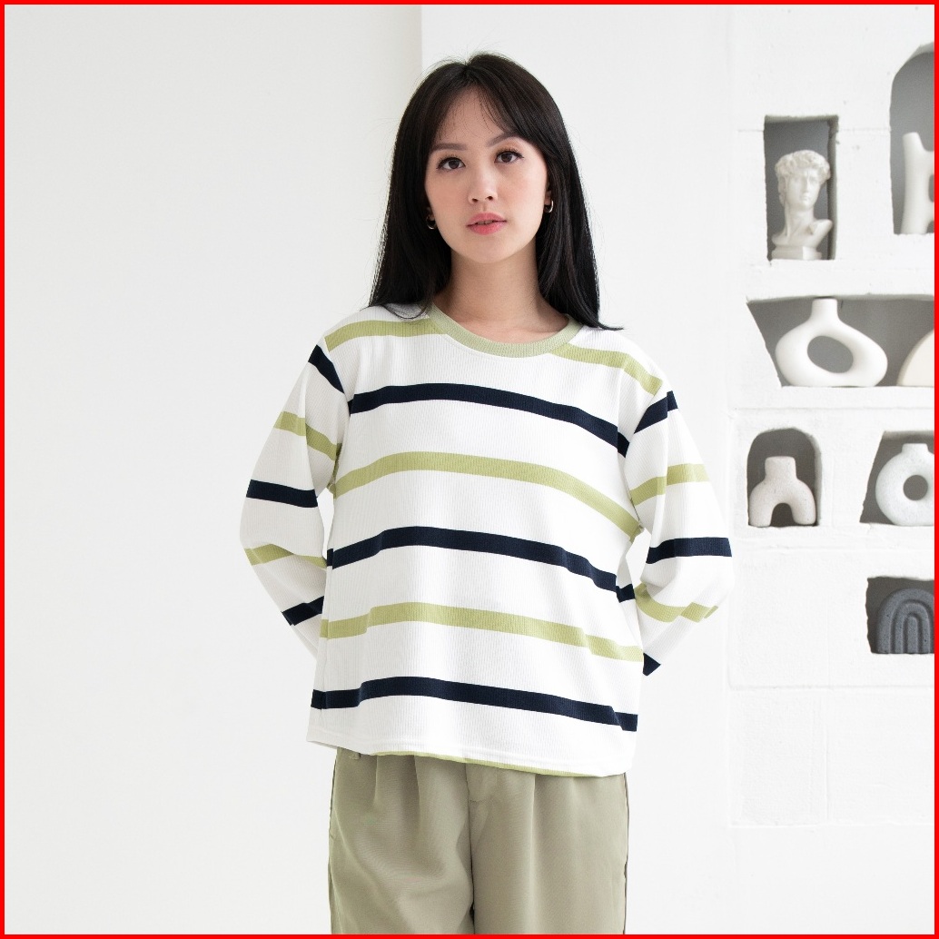 Queentin Kaos Wanita Casual 0671 Stretch Caramel Knit Motif Salur Lengan Panjang