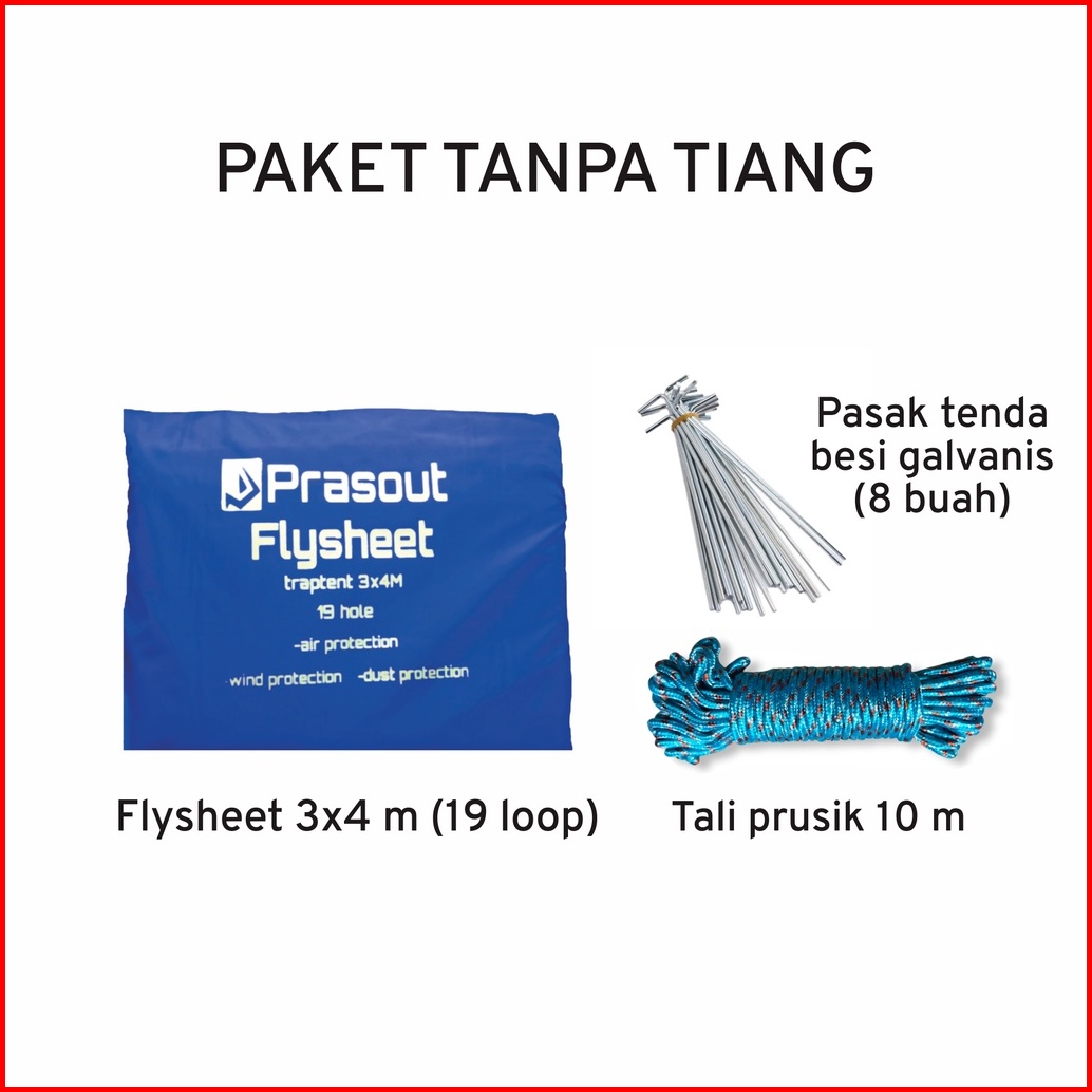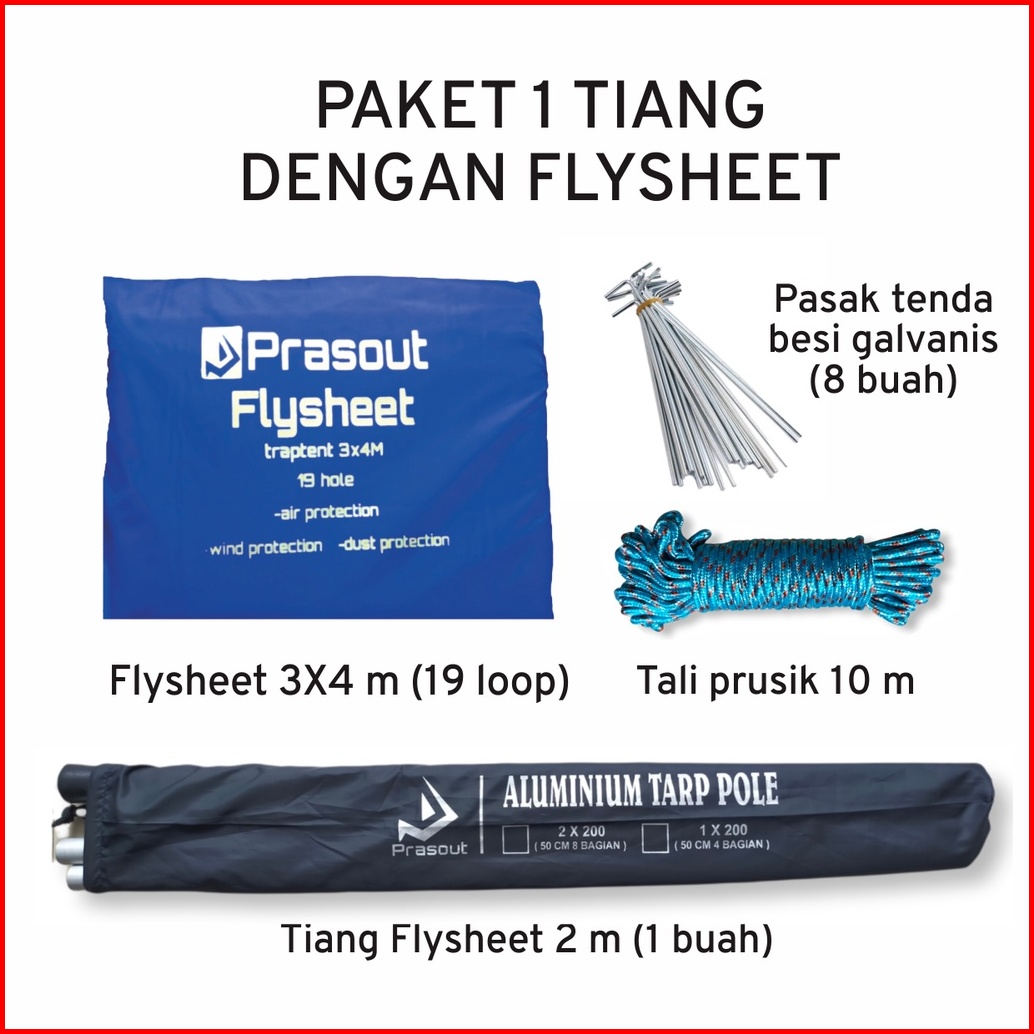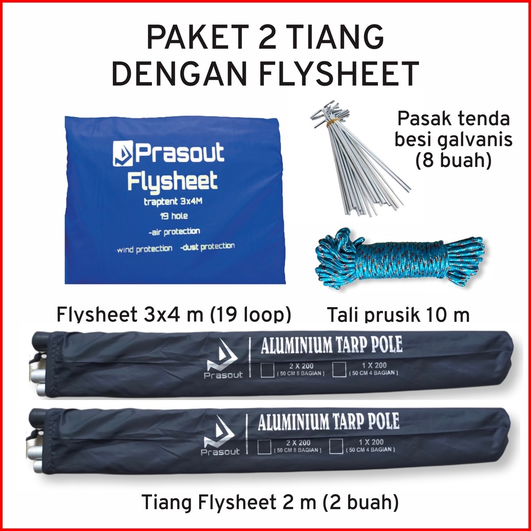 Paket Flysheet 3x4 M Prasout - Tarp Pole 2 M - Tali Prusik 10 M - Pasak Tenda