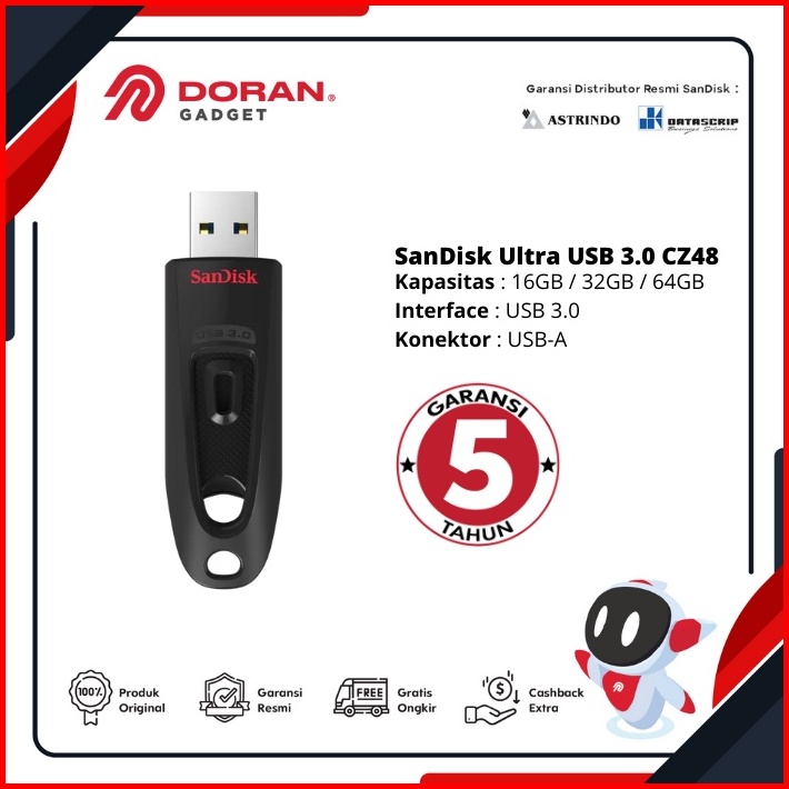 Flashdisk Flash Disk 16gb 32gb 64gb 128gb 16 32 64 128 Gb Sandisk Ultra Usb 3.0 Cz48 - Garansi 5 Tahun