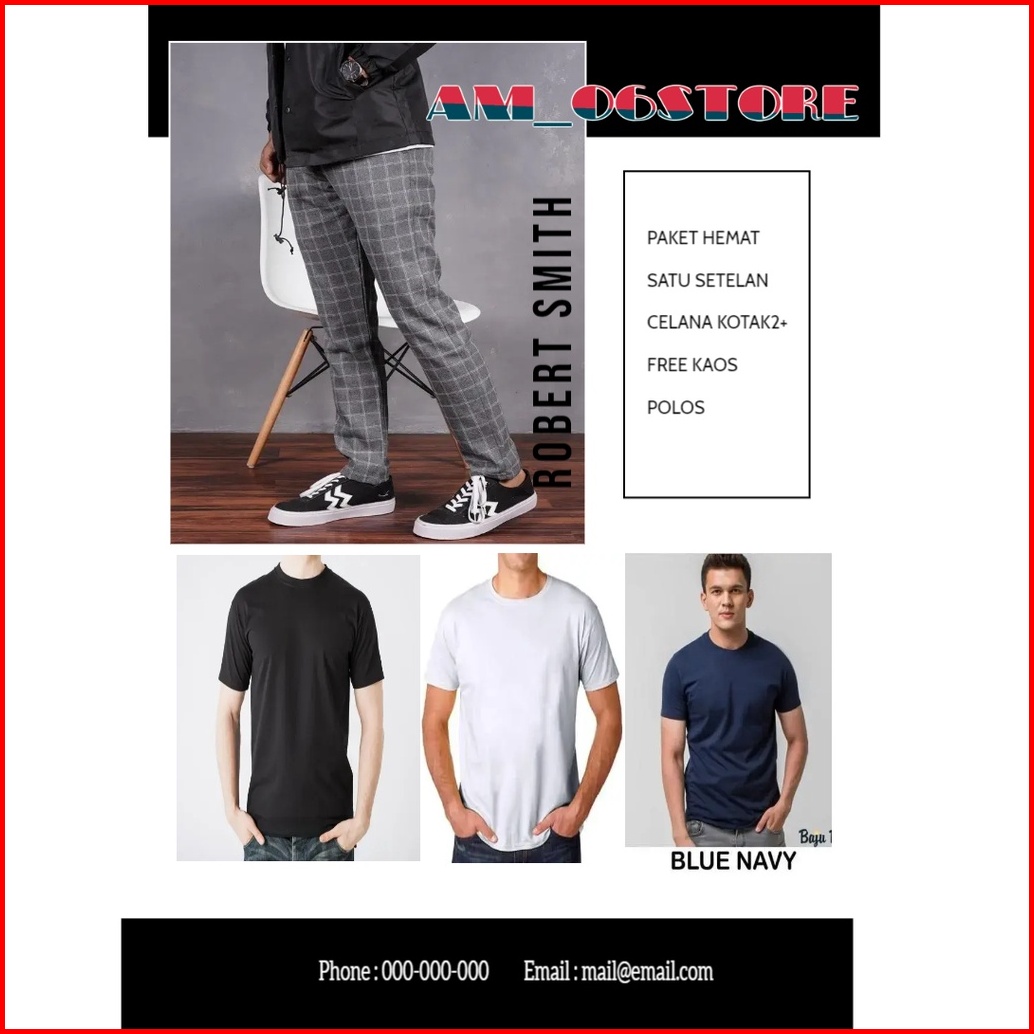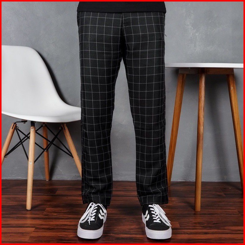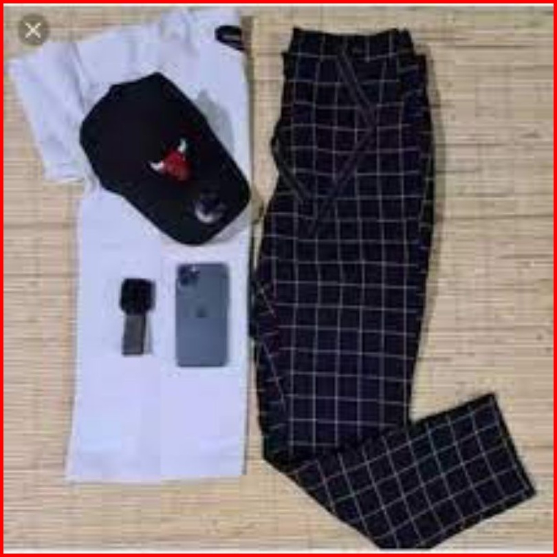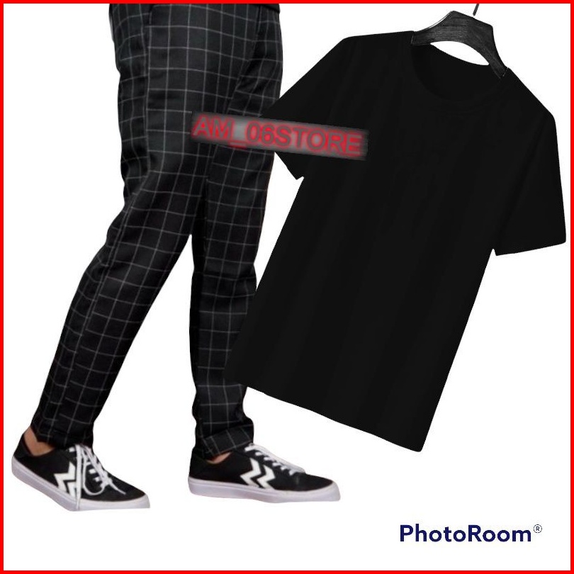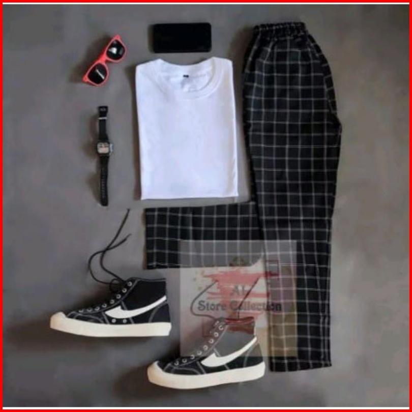 Promo Satu Setelan Pria Wanita Celana Kotak Tartan Dan Kaos Polos Putih Terbaru