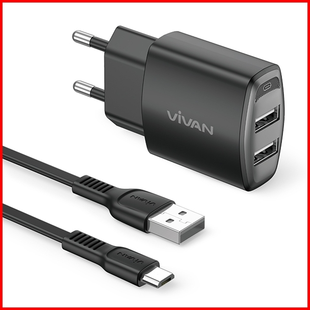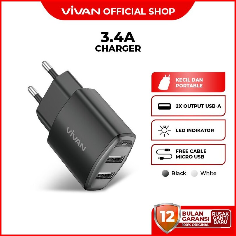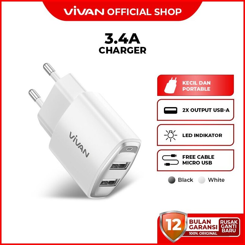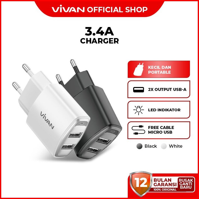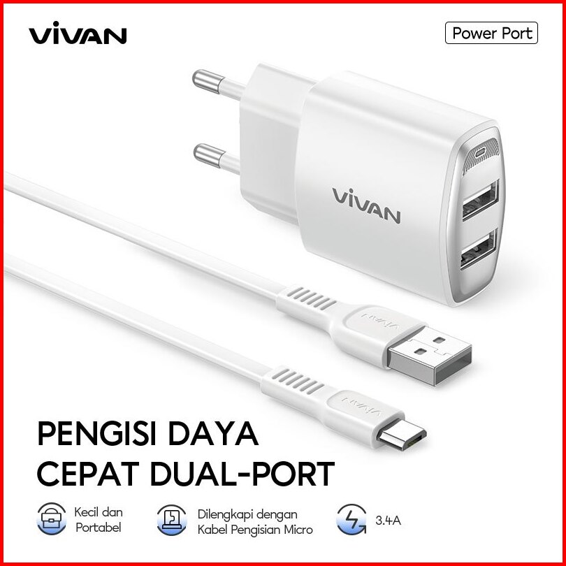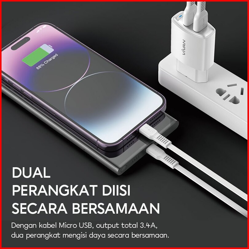 Vivan Power Port Charger Dual Output Usb Quick Charging 3.4a With Charging Cable Garansi 12 Bulan