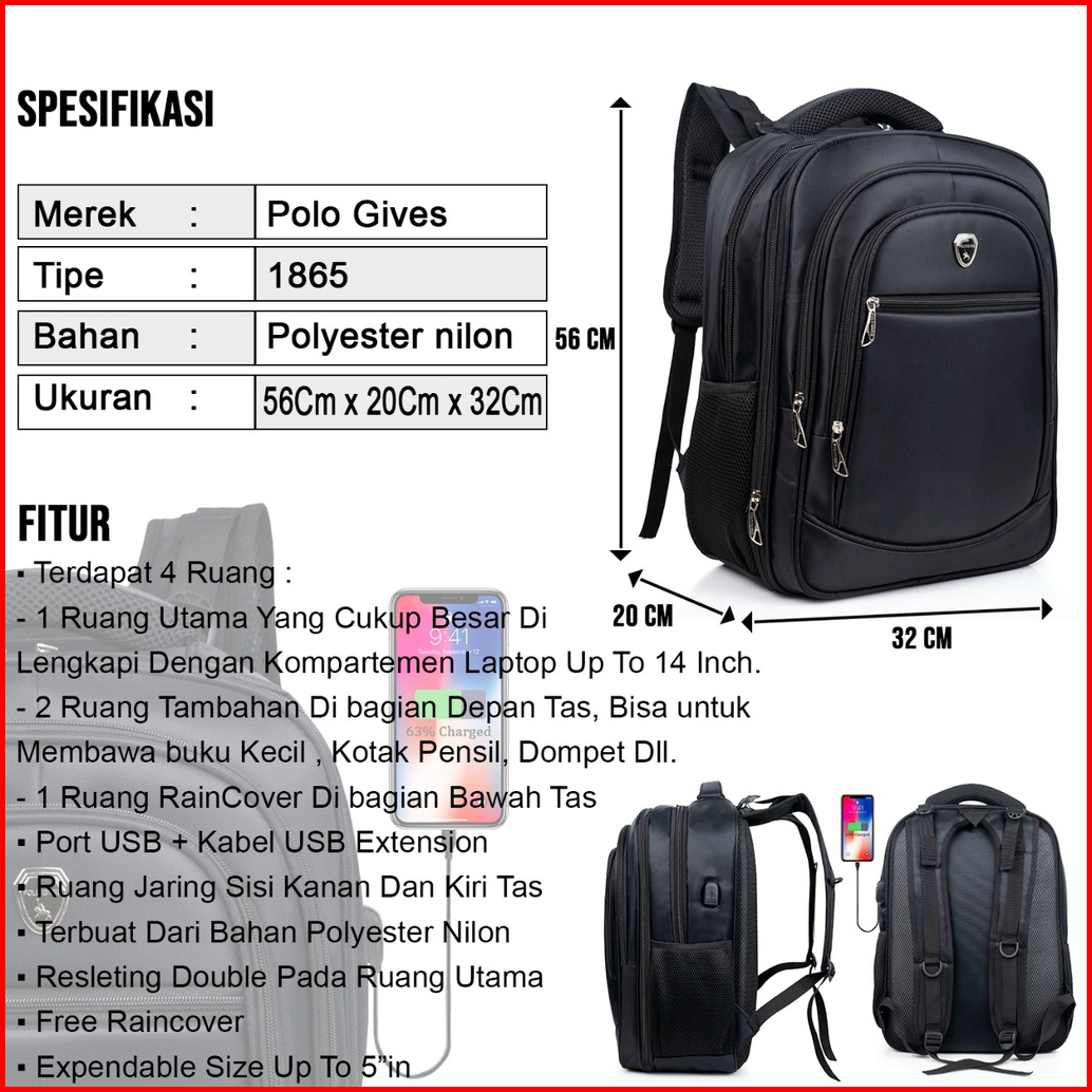 Polo Gives - Ransel Kerja Polo Original Import 18 Inch Free Kabel Usb Raincover Tas Ransel Polo Tas Sekolah Polo Tas Pol