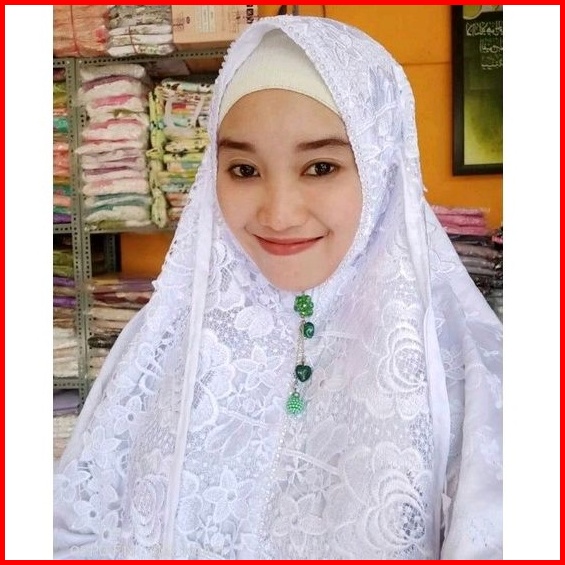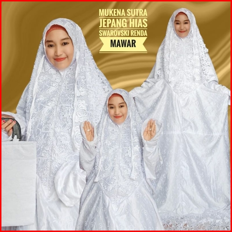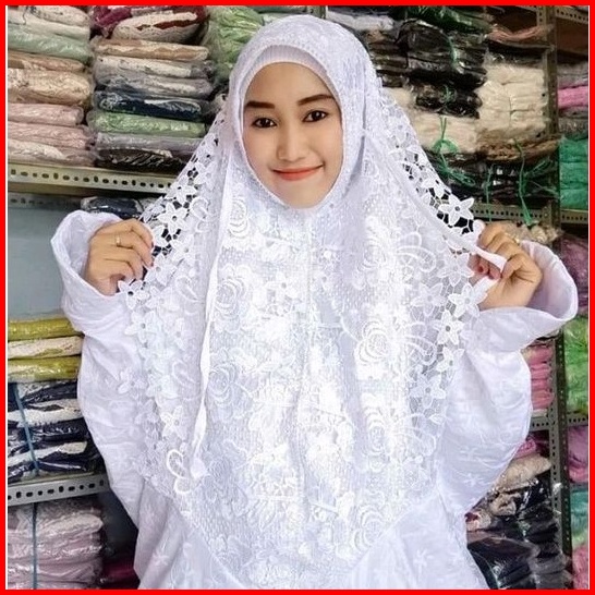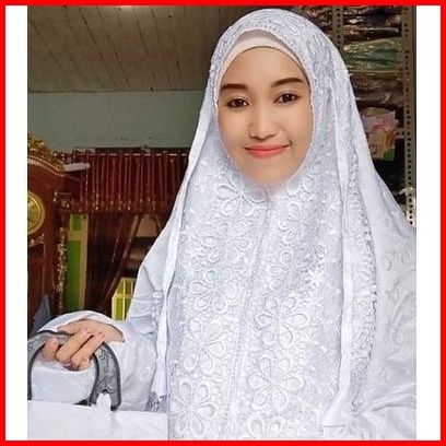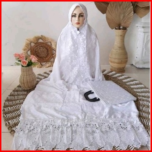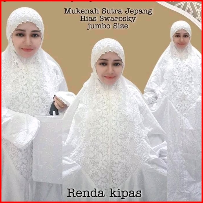 Mukena Terusan Jumbo Sutra Jepang Bordir Renda Lebar Full Swaroski Putih Termurah Terbaru Lebaran