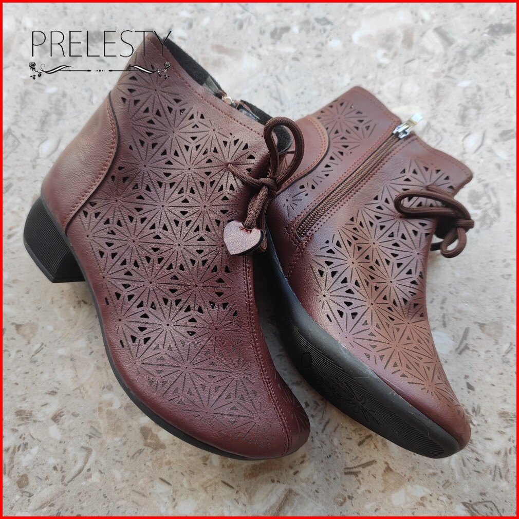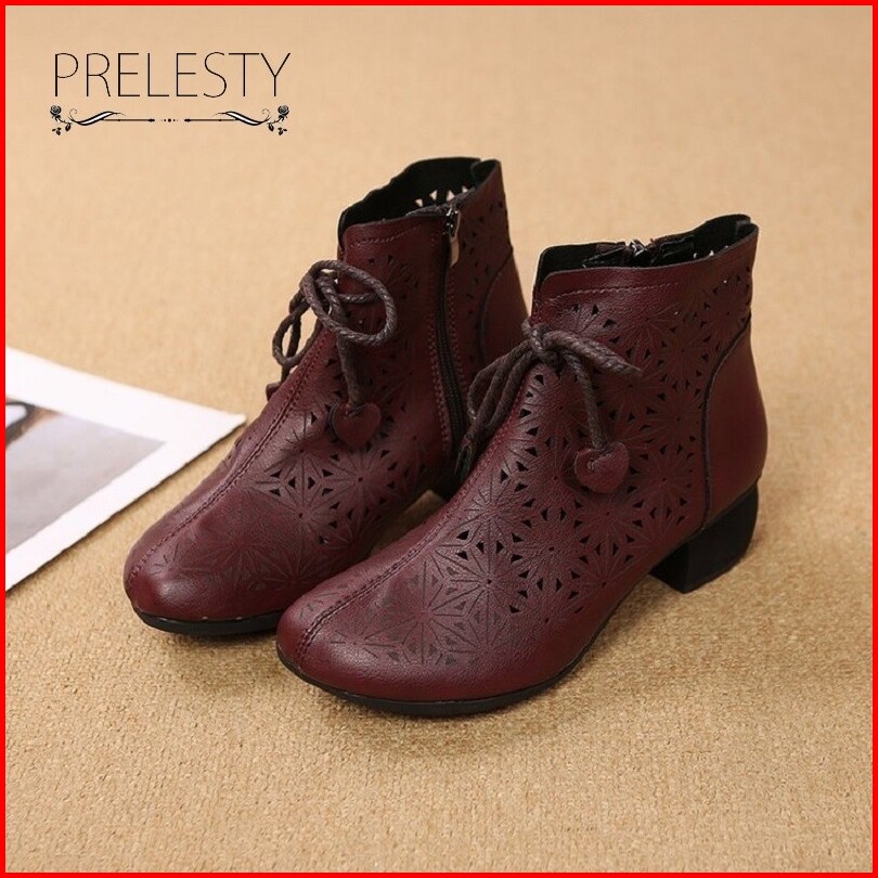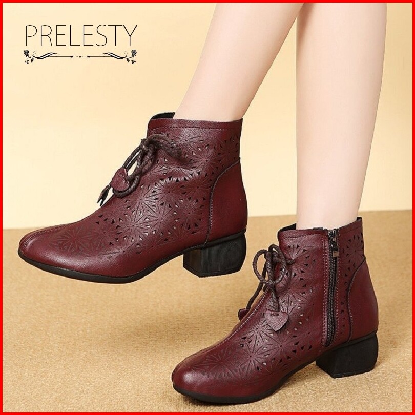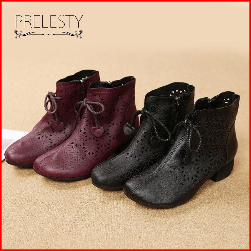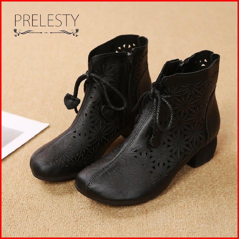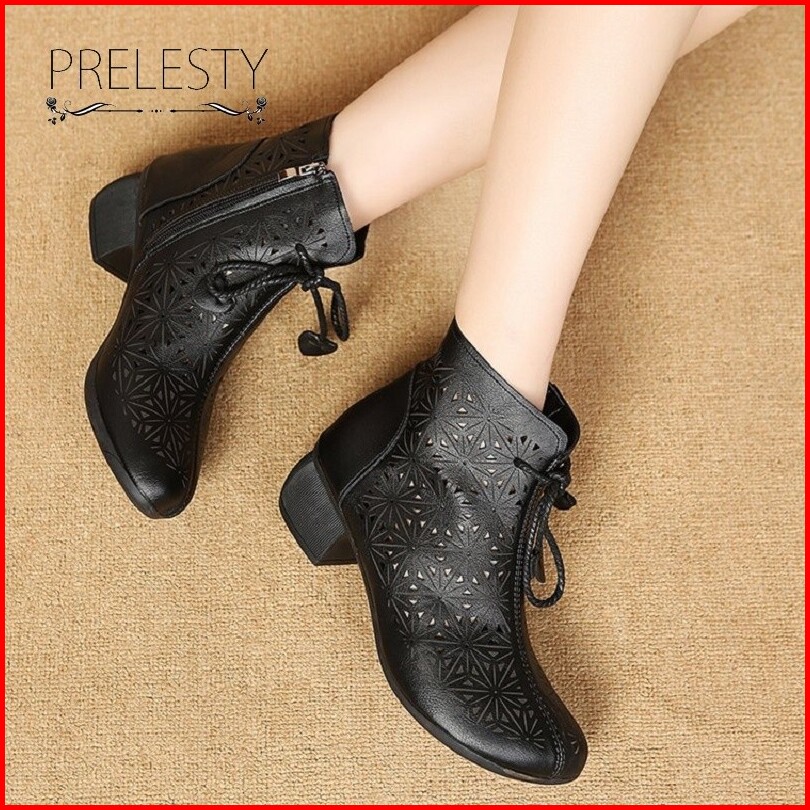 Musim Panas Bernapas Korea Cantik Kulit Asli Sepatu Boots Wanita Cewek Resleting Tali Tinggi Hak Casual Formal Kerja Kul