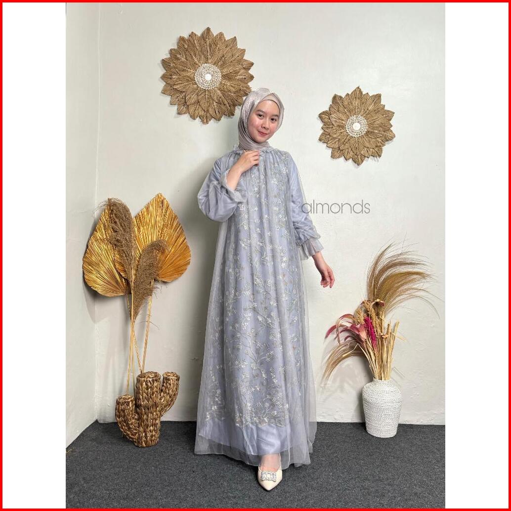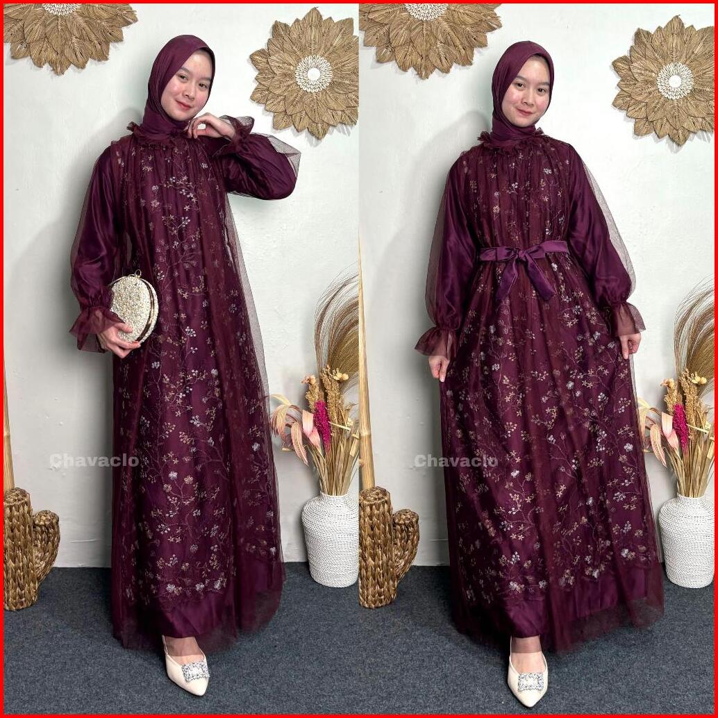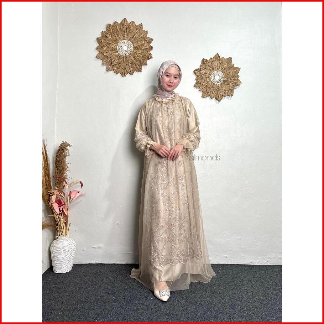 Rivina Long Dress Satin Mix Brukat Full Tille Polos Gamis Mewah Wanita Muslim Dress Kondangan Lamaran Bridesmaid