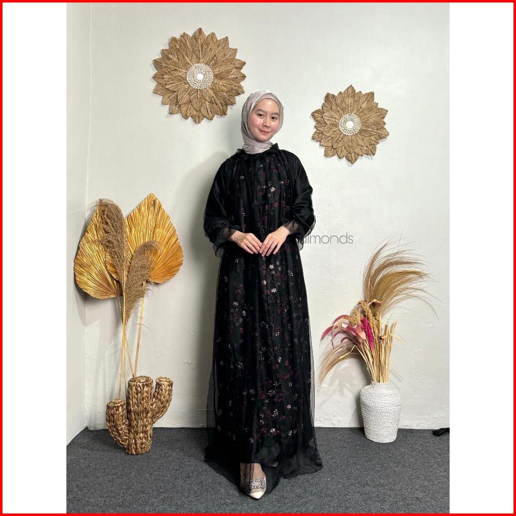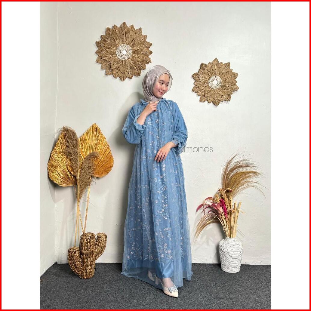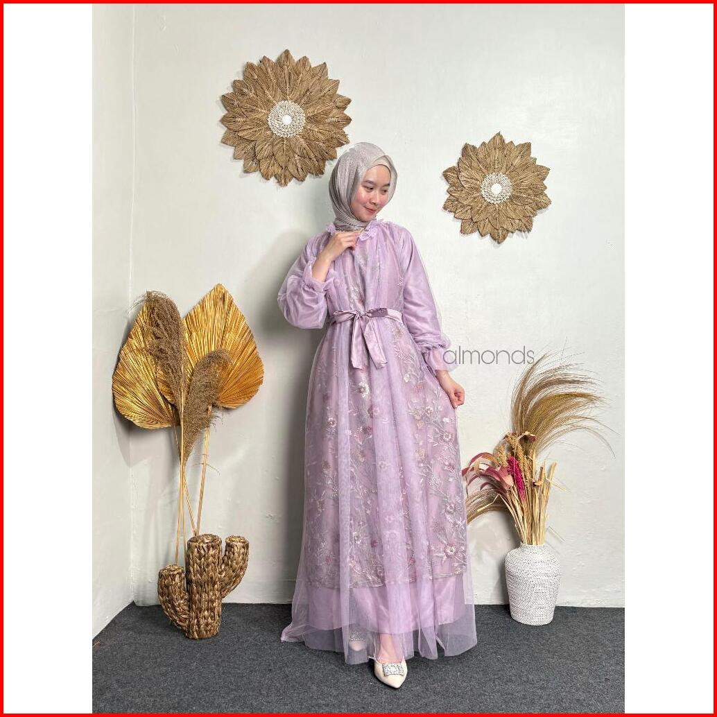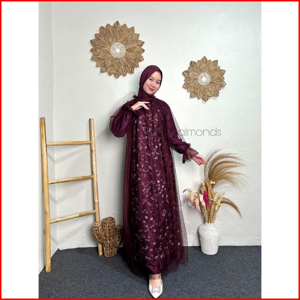 Rivina Long Dress Satin Mix Brukat Full Tille Polos Gamis Mewah Wanita Muslim Dress Kondangan Lamaran Bridesmaid