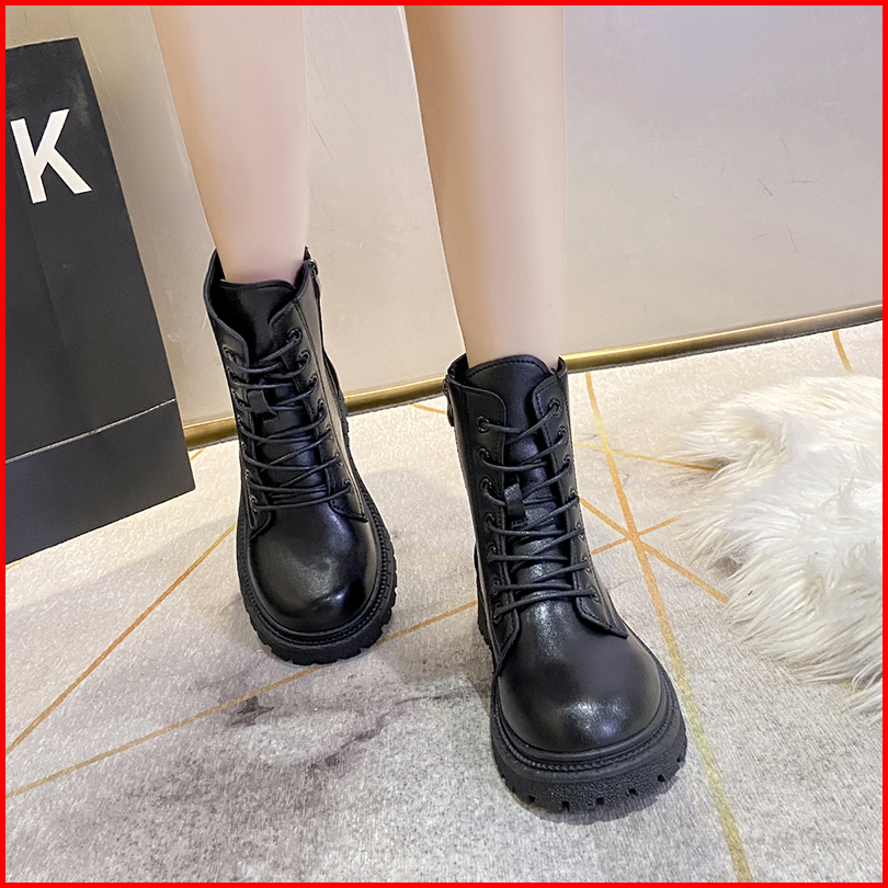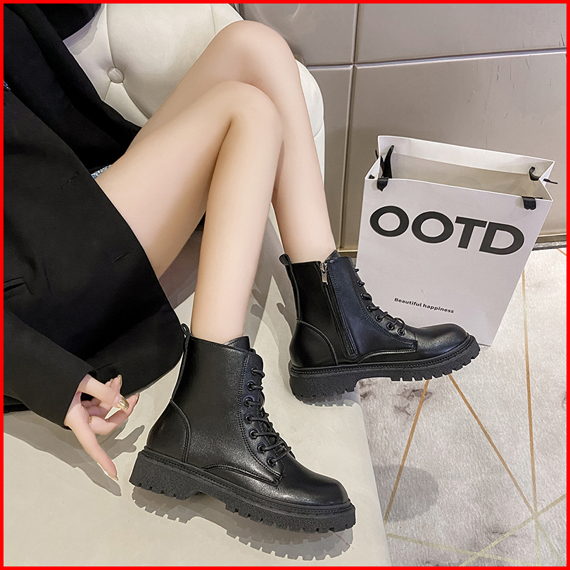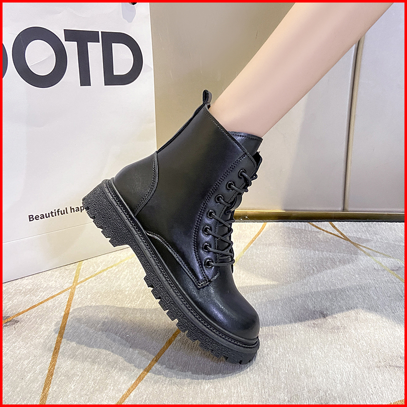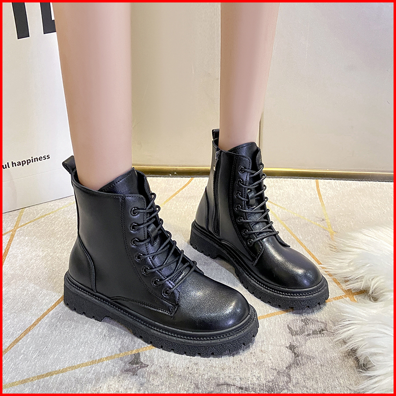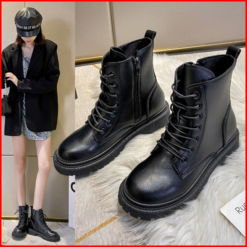 Sepatu Leather Ankle Boots Docmart Wanita Bot Kasual Gaya Korea Kulit Tali Hitam Sol Karet Import Korean Style Cantik Ke