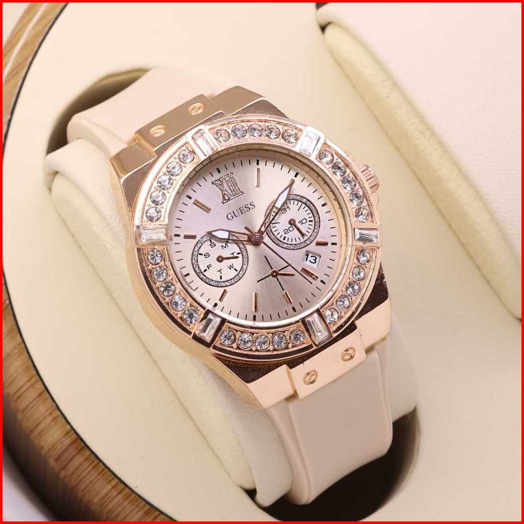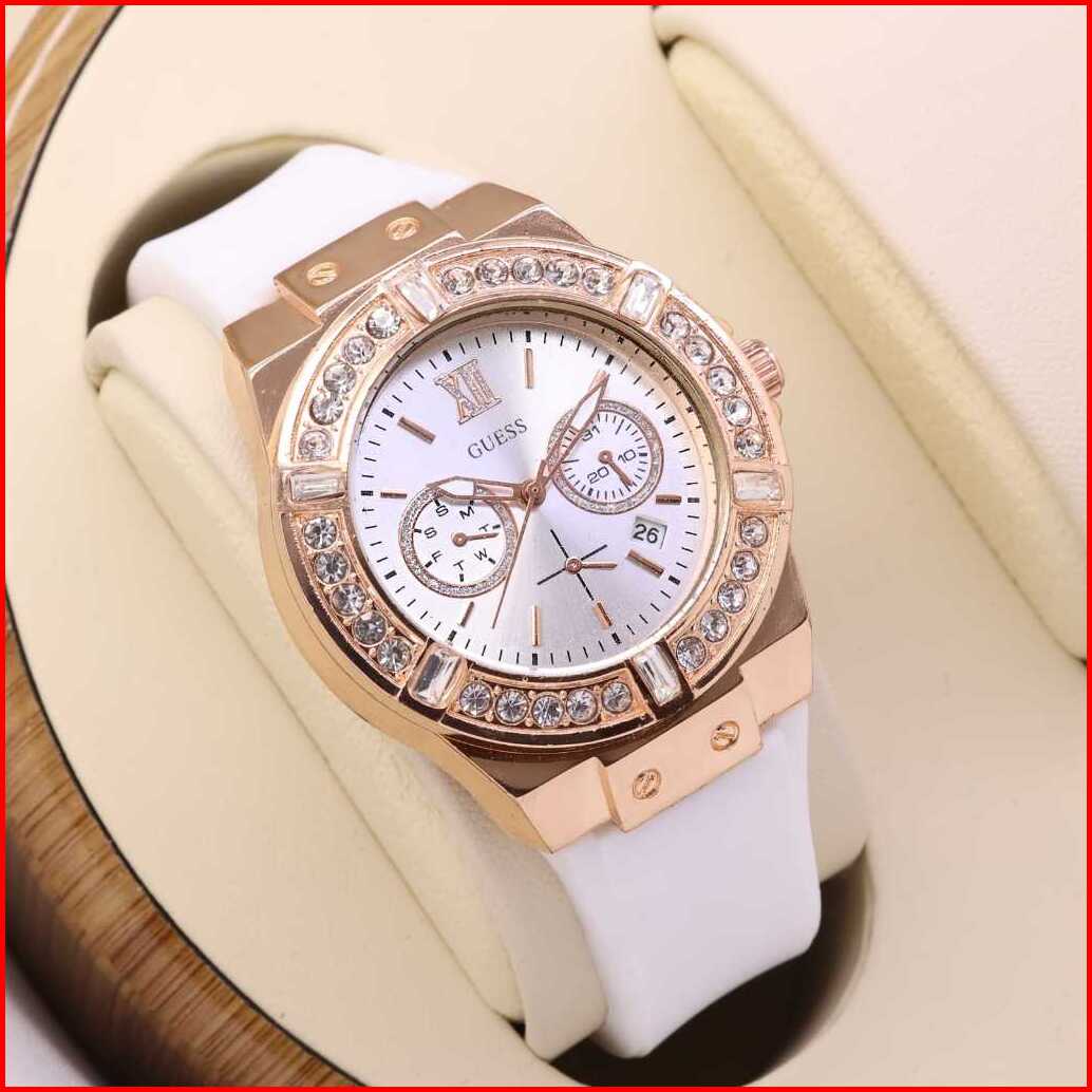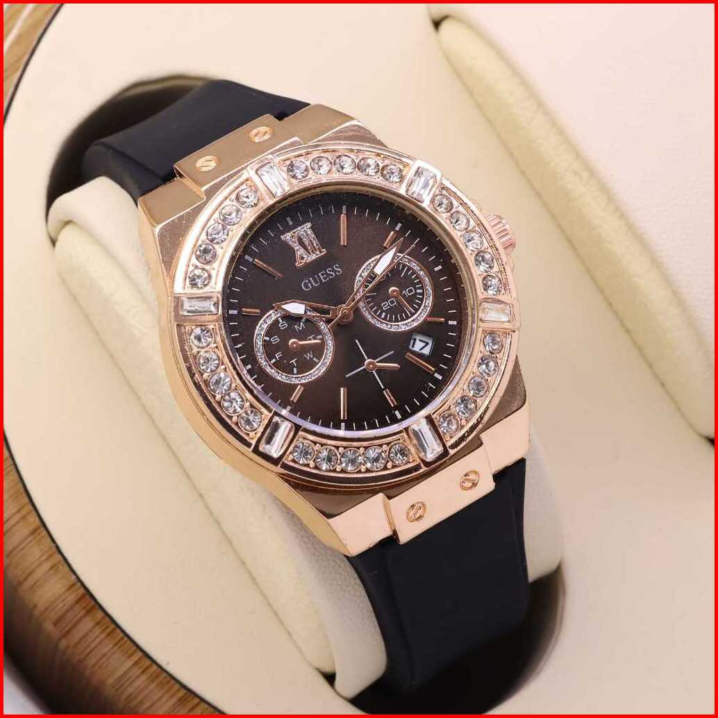 Jam Tangan Wanita Guess New Tali Rubber Body Bulat Permata Chrono Variasi Tanggal Aktif