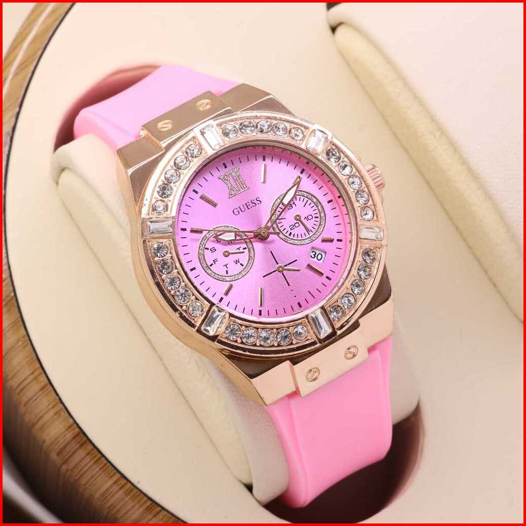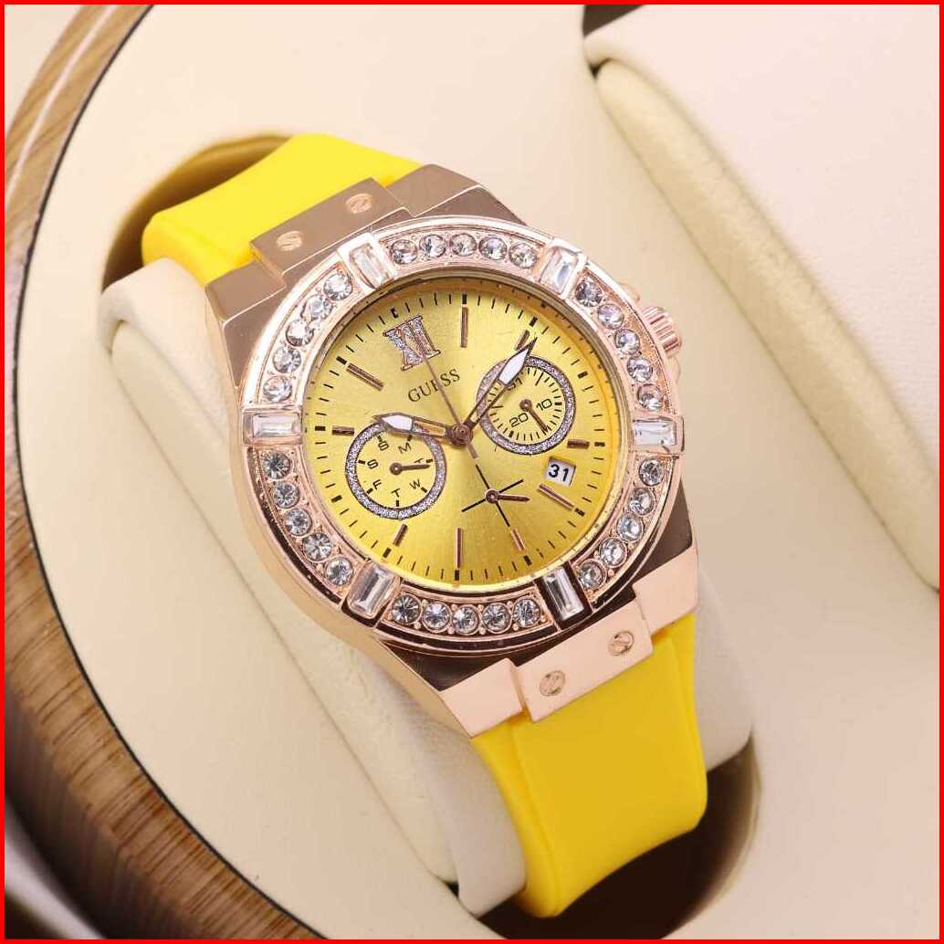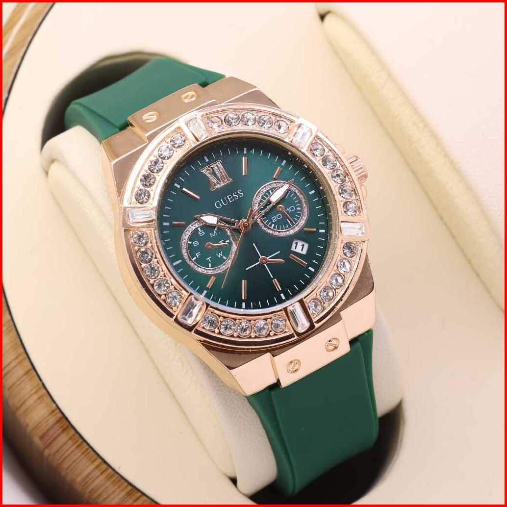 Jam Tangan Wanita Guess New Tali Rubber Body Bulat Permata Chrono Variasi Tanggal Aktif
