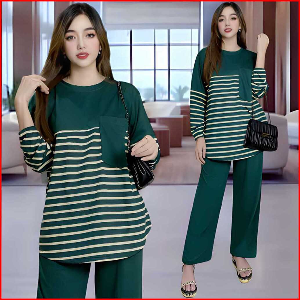 Davina Oneset Atasan Oval Kantong Dada Ld 120 Vistaterry Motif Salur Celana Karet Wanita Setelan Baju Basic Panjang Over