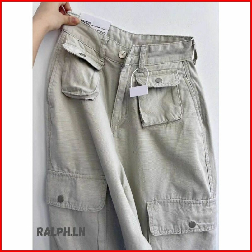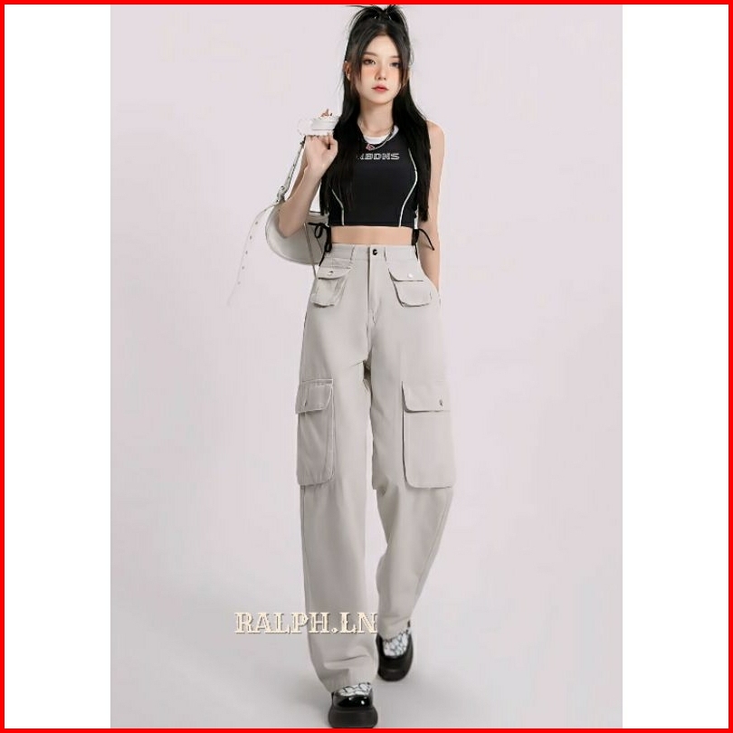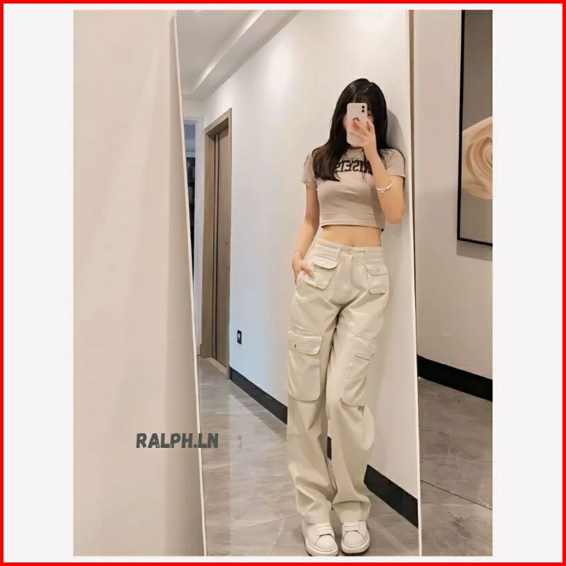 Celana Wanita Jeans Cargo Highwaist Warna Krem Putih Tulang Model Terbaru