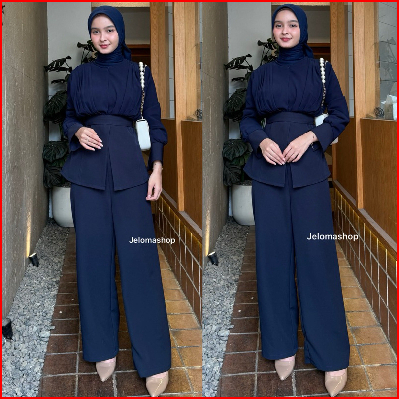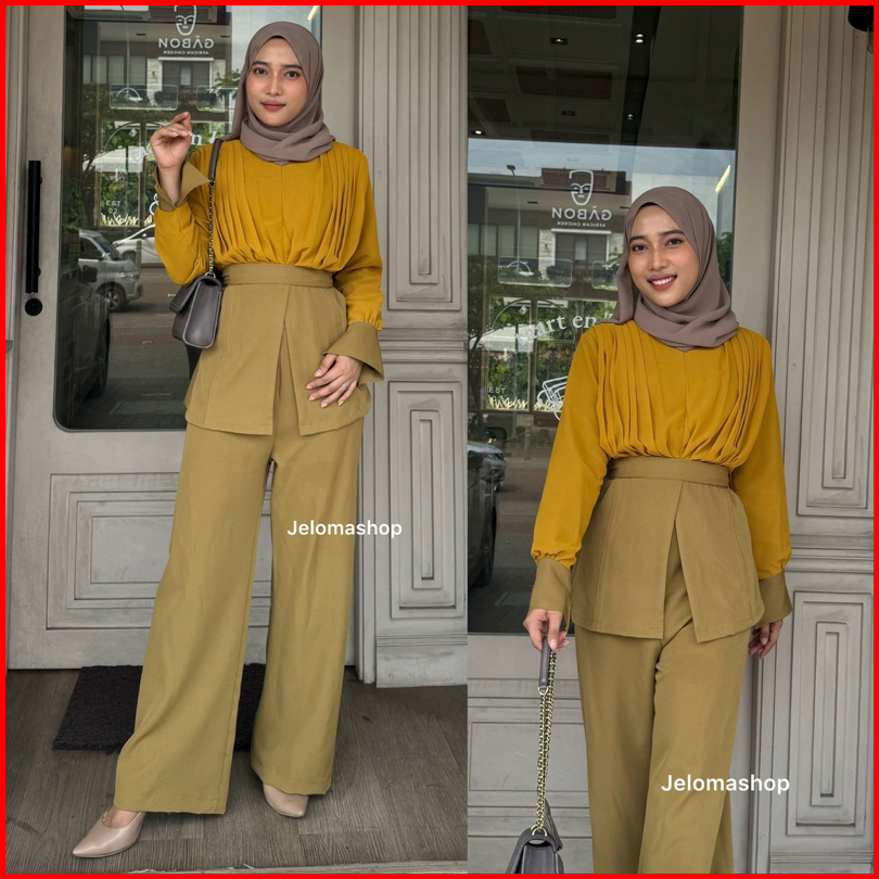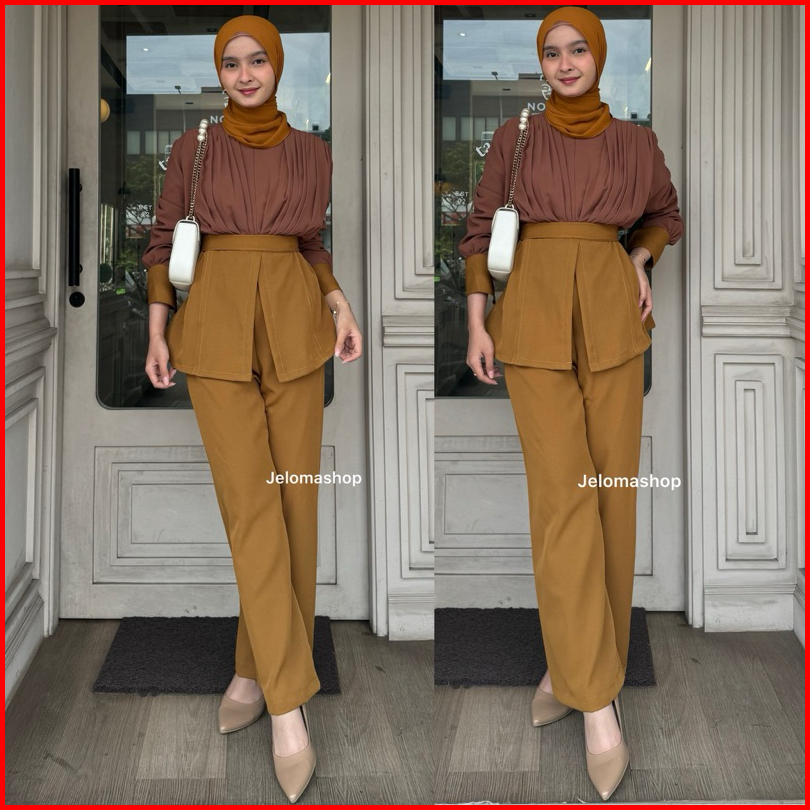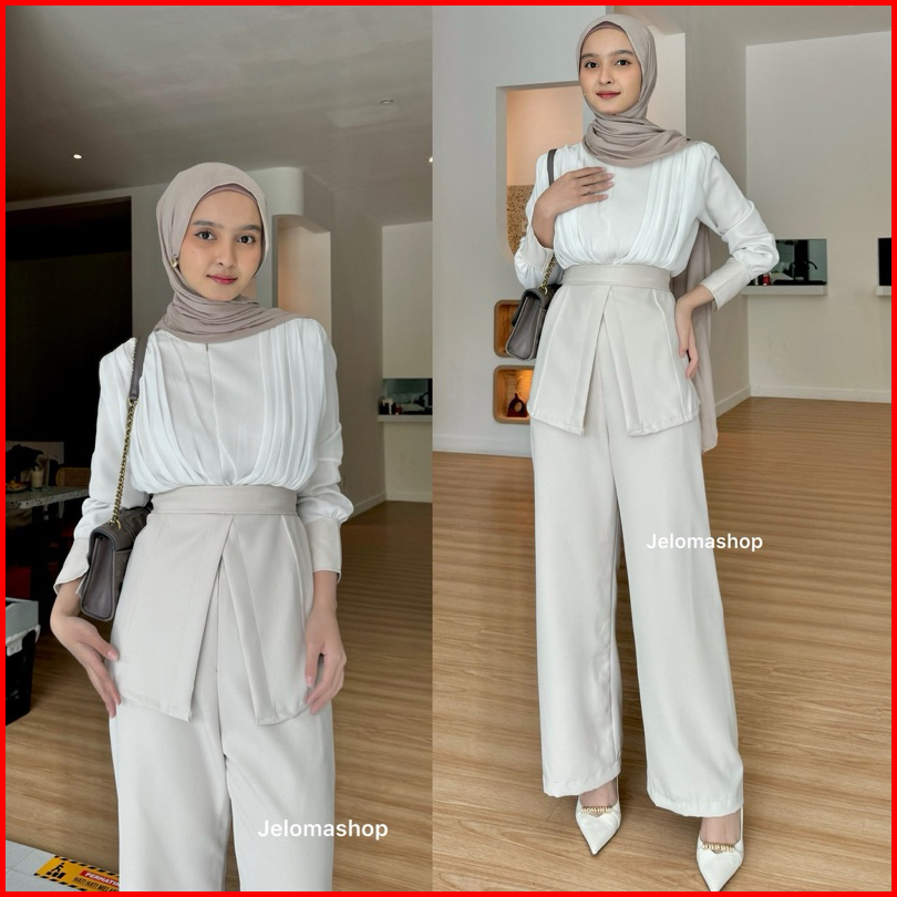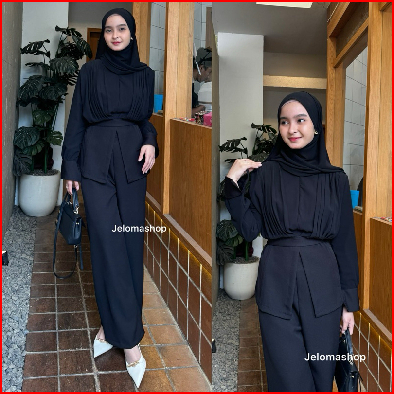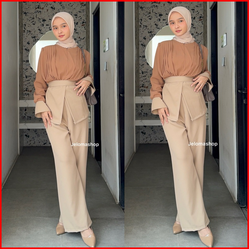 Jeloma - Amora Oneset Classy Celana Highwaist Blouse Sleting Depan One Set Busui Friendly