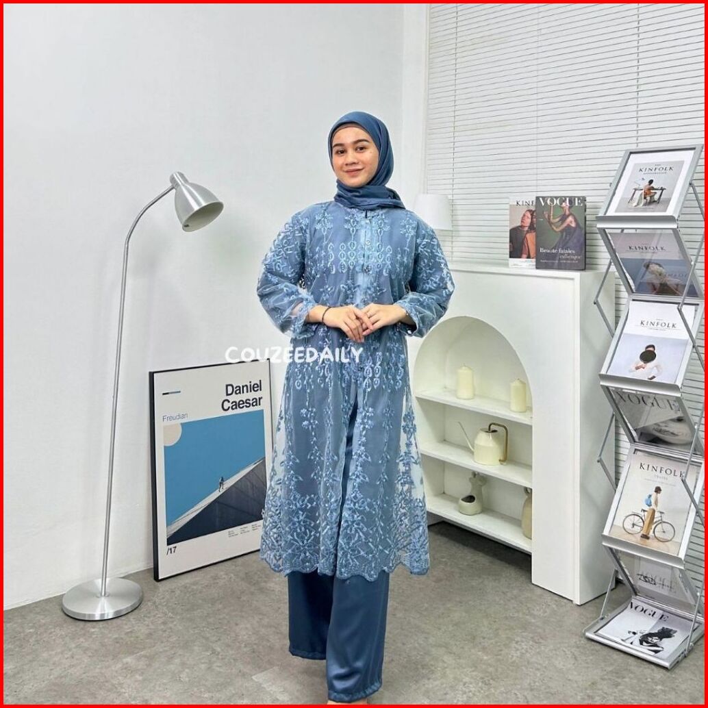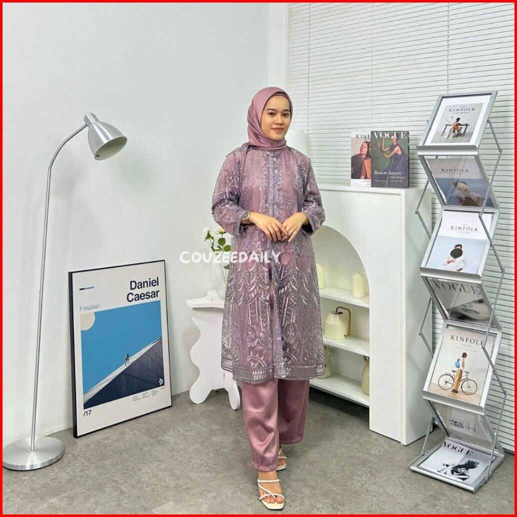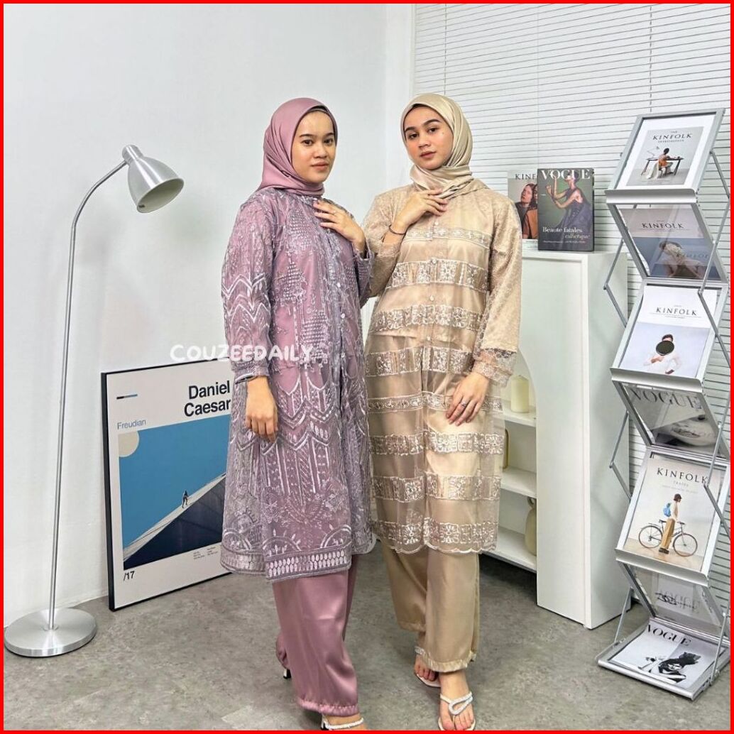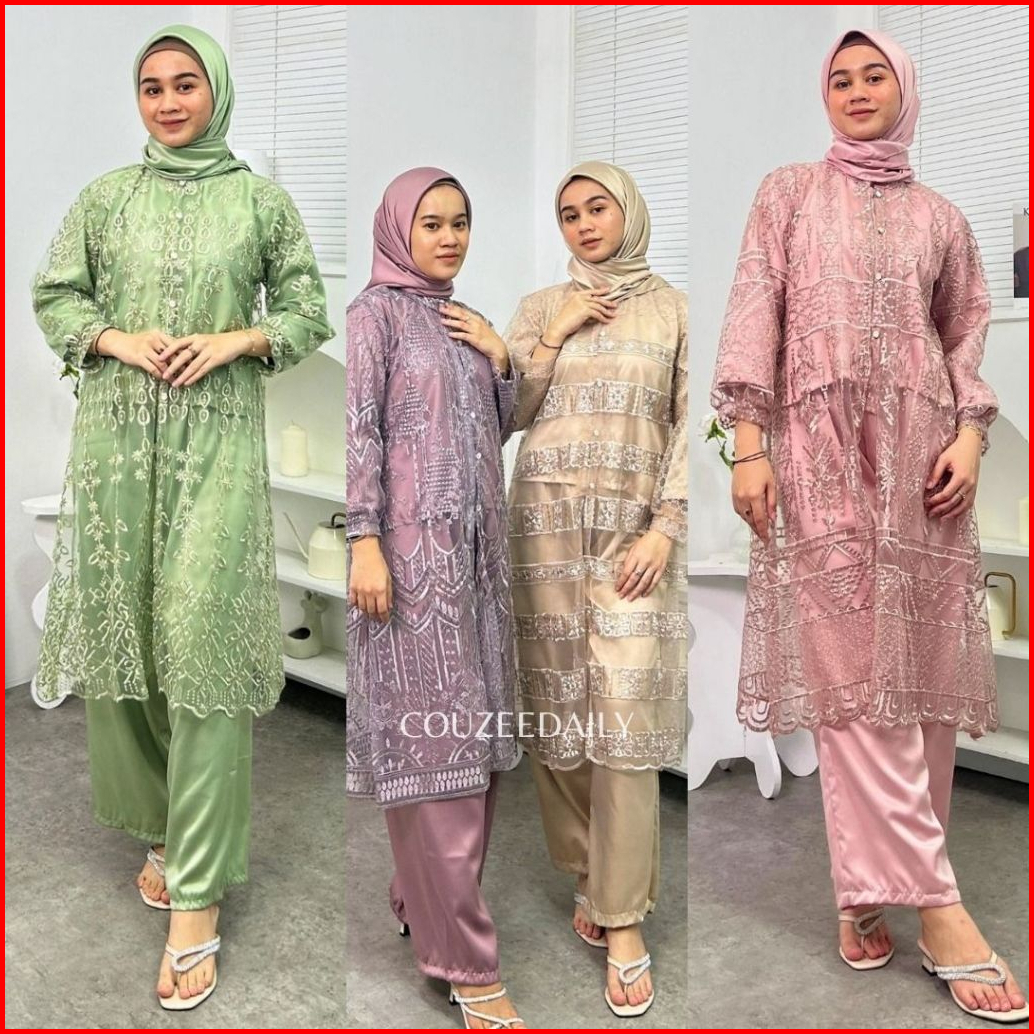 Naira Set 3in1 - Setelan Bahan Satin One Set Hijab Atasan Celana Outer New Motif Brukat Setelan Busana Kondangan Muslima