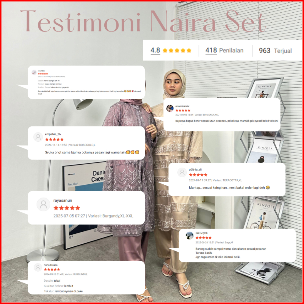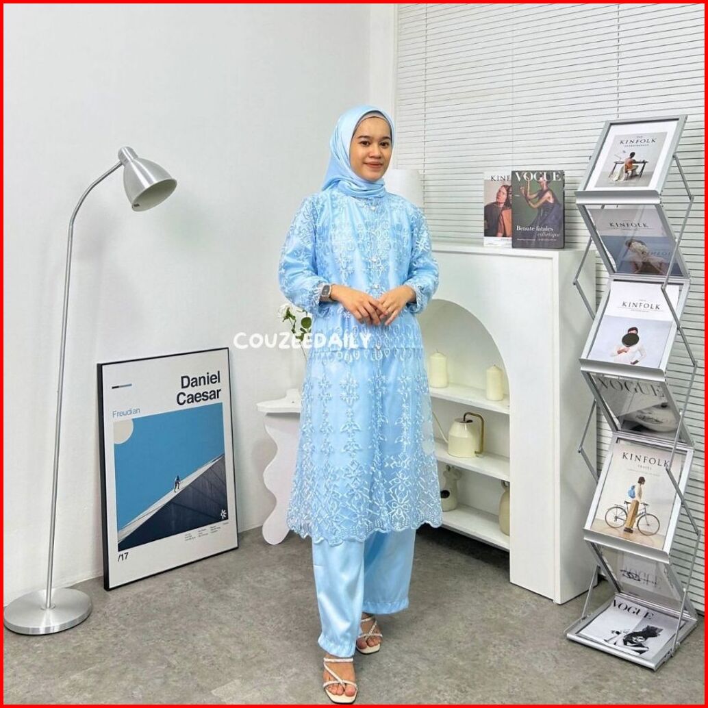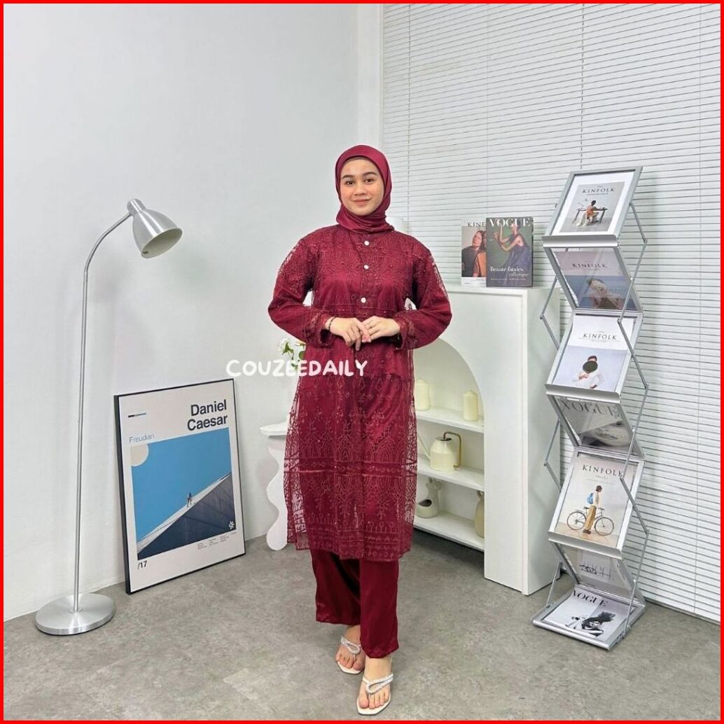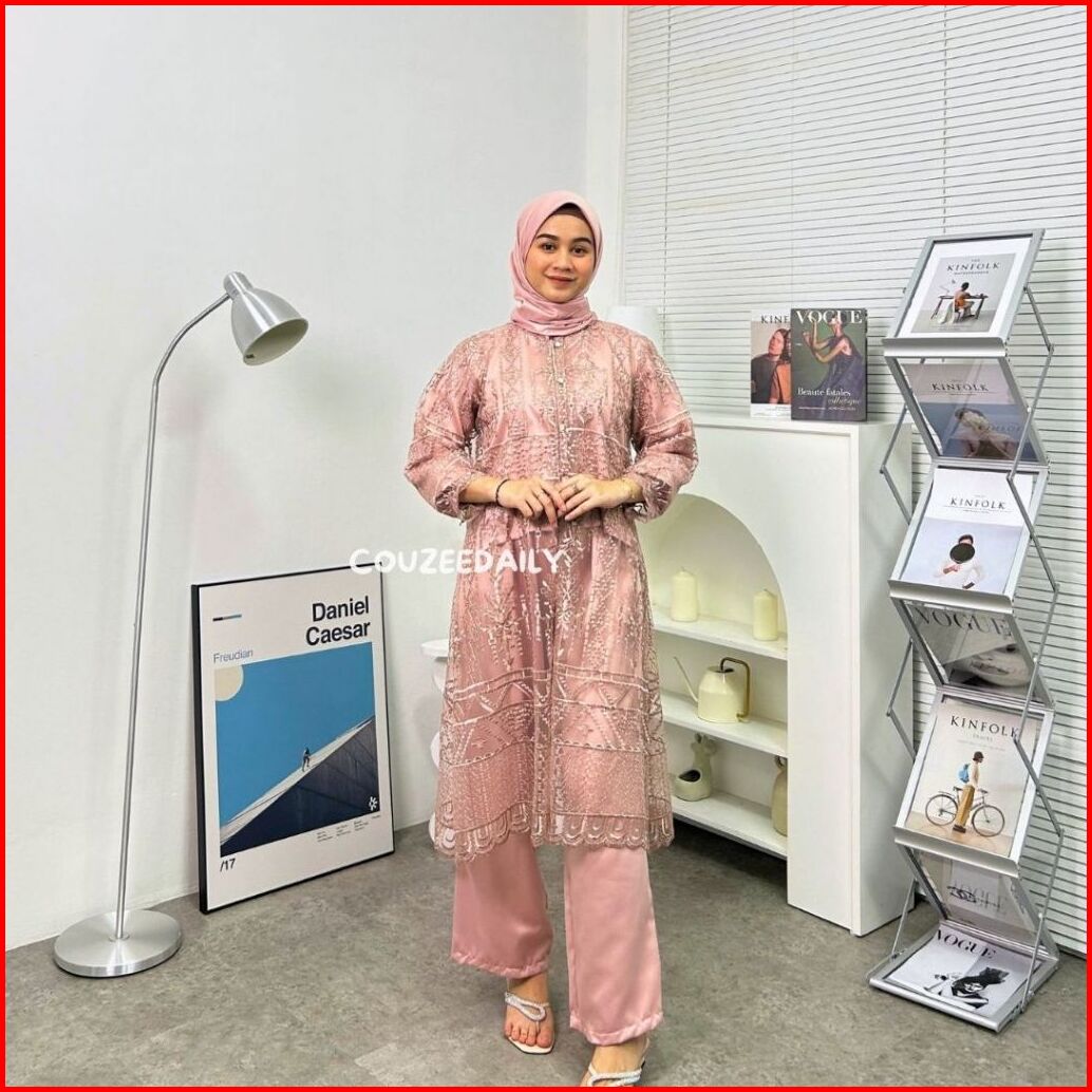 Naira Set 3in1 - Setelan Bahan Satin One Set Hijab Atasan Celana Outer New Motif Brukat Setelan Busana Kondangan Muslima