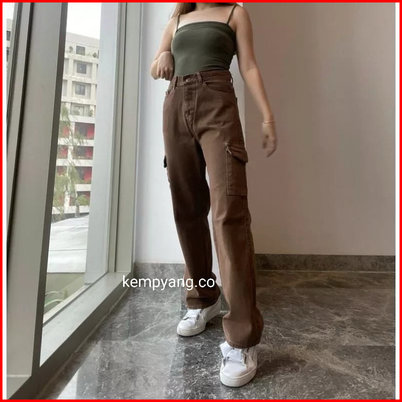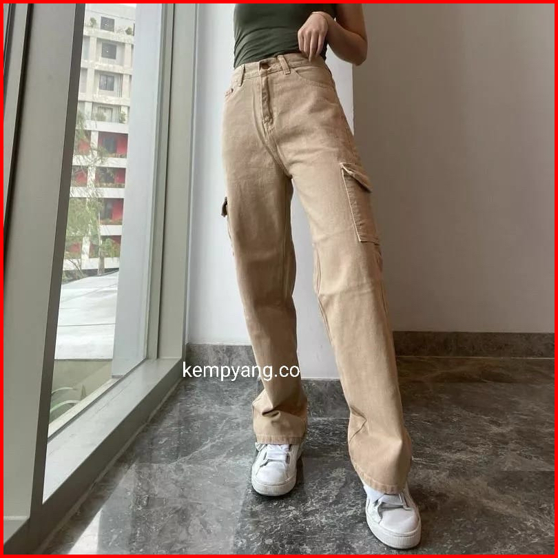 Kempyang - Hightwaist Loose Cargo Jeans Baggy Warna Hands Up Wanita