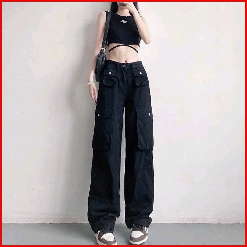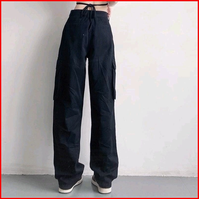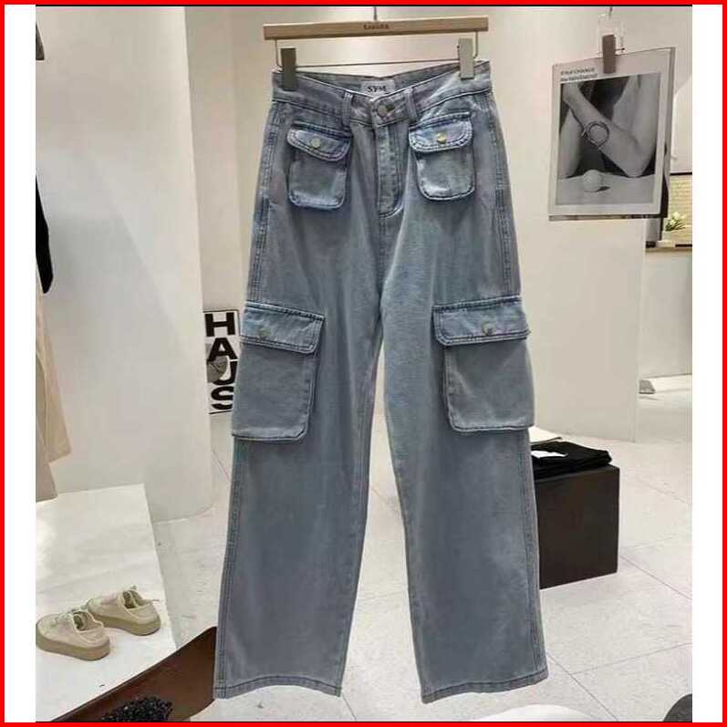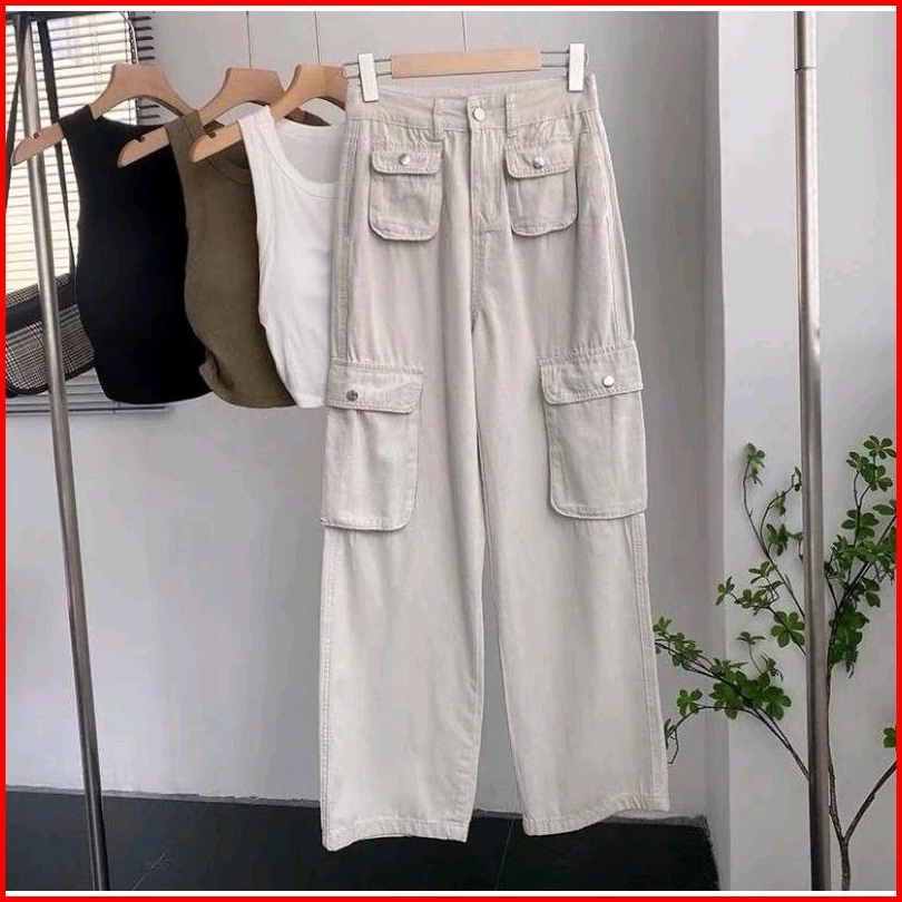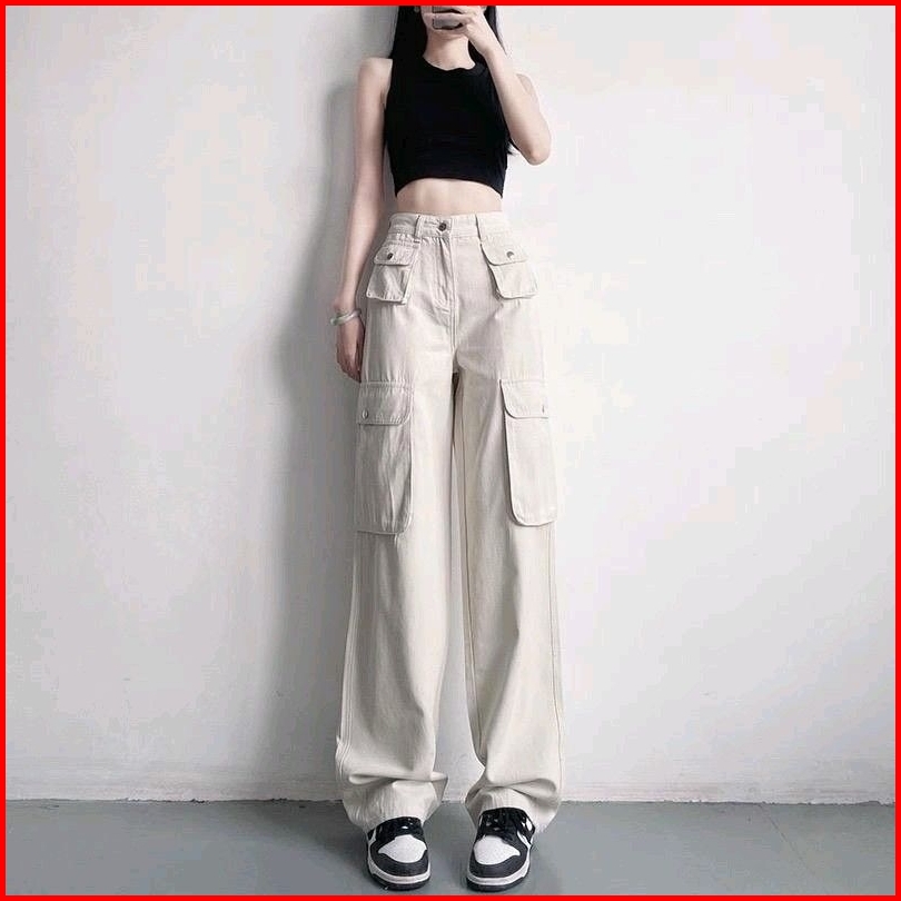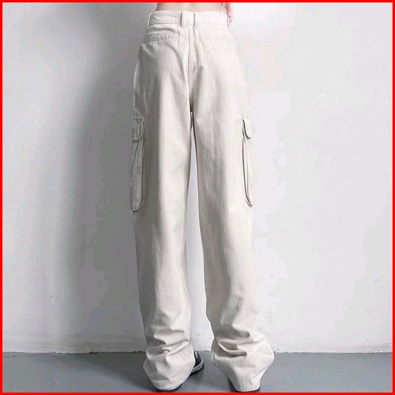 Arfashion Cargo Denim Pasir Putih Krem New Highwaist Loose Celana Panjang Wanita Korean Realpict