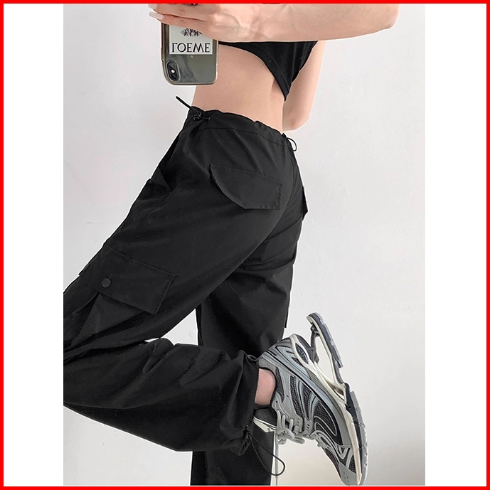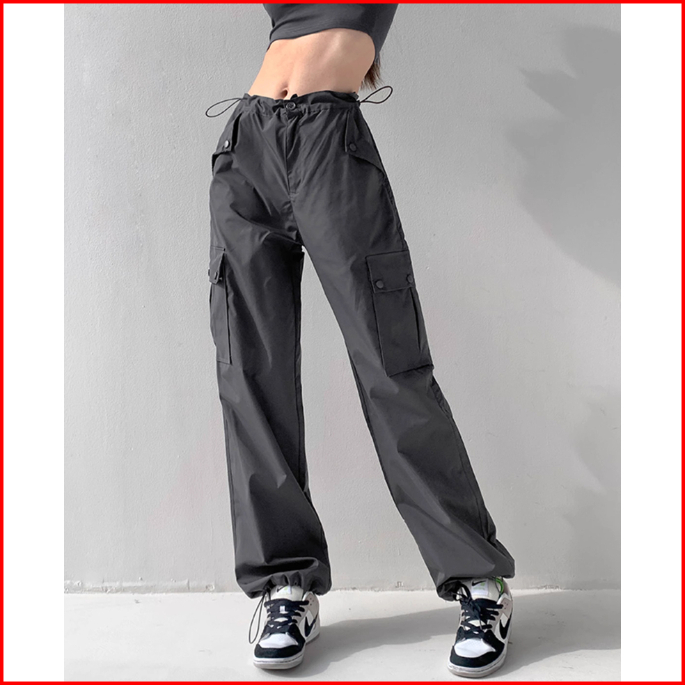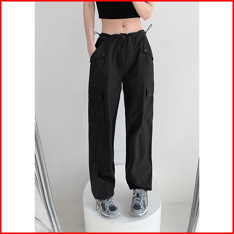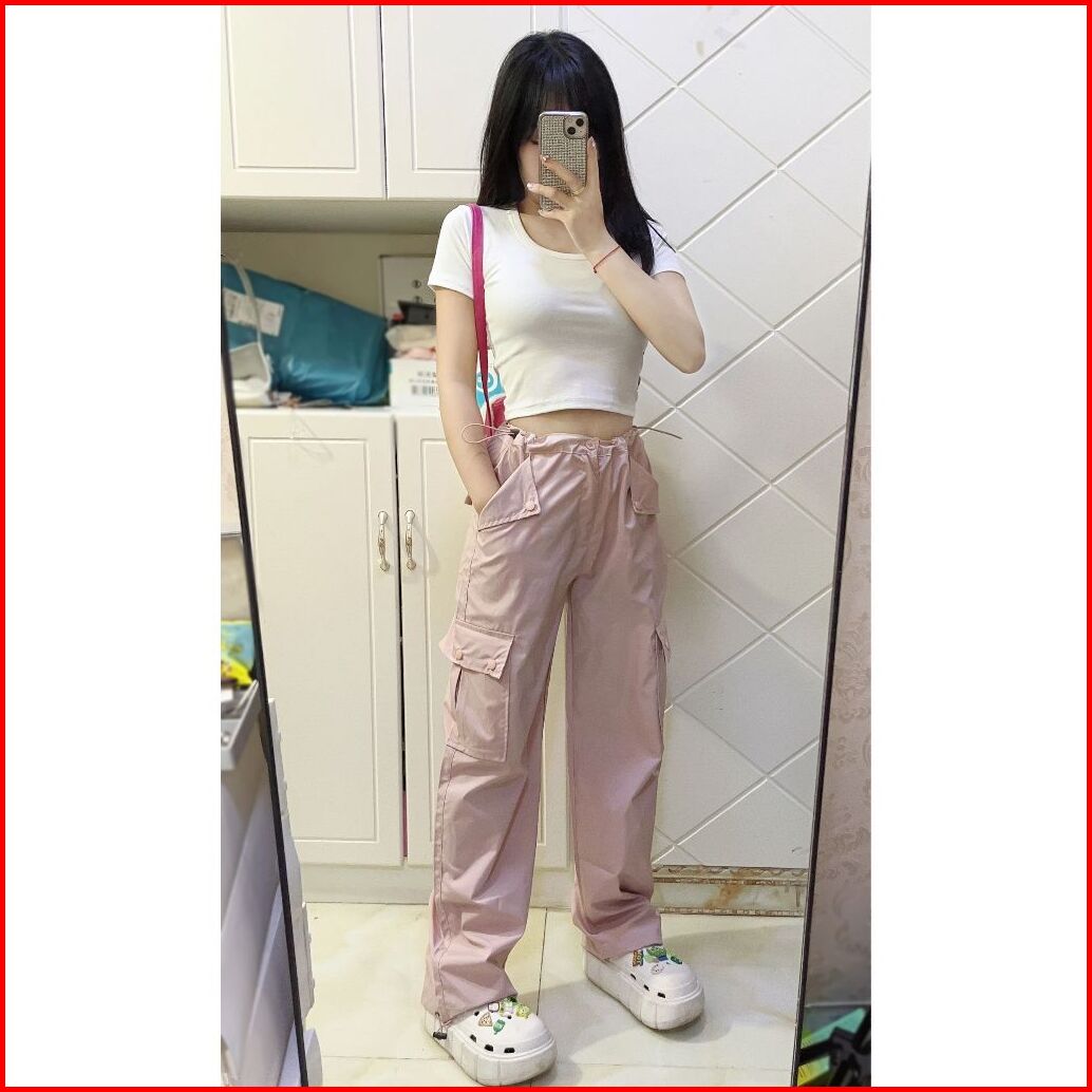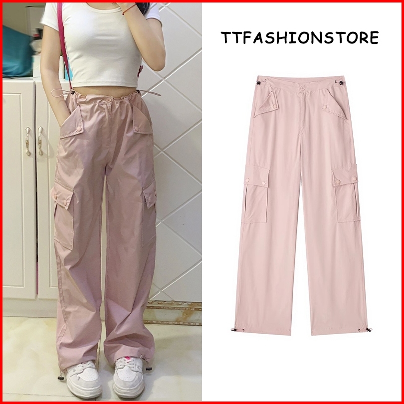 Pink Celana Cargo Kasual Highwaist Wanita Gaya Korea Celana Kulot Straight Loose Serut Premium