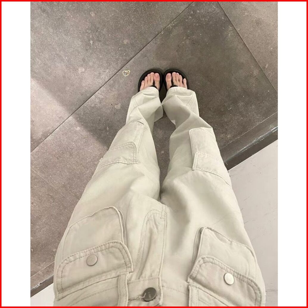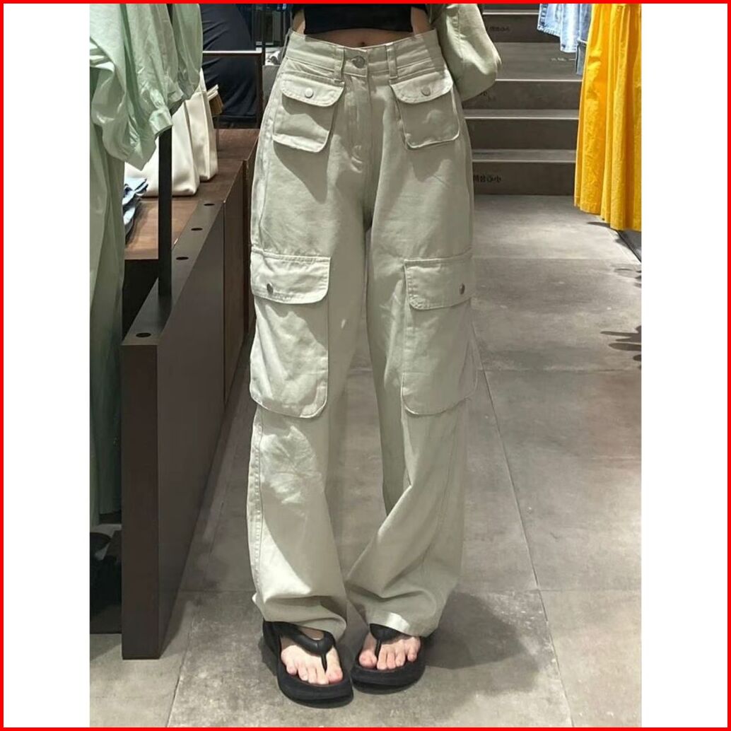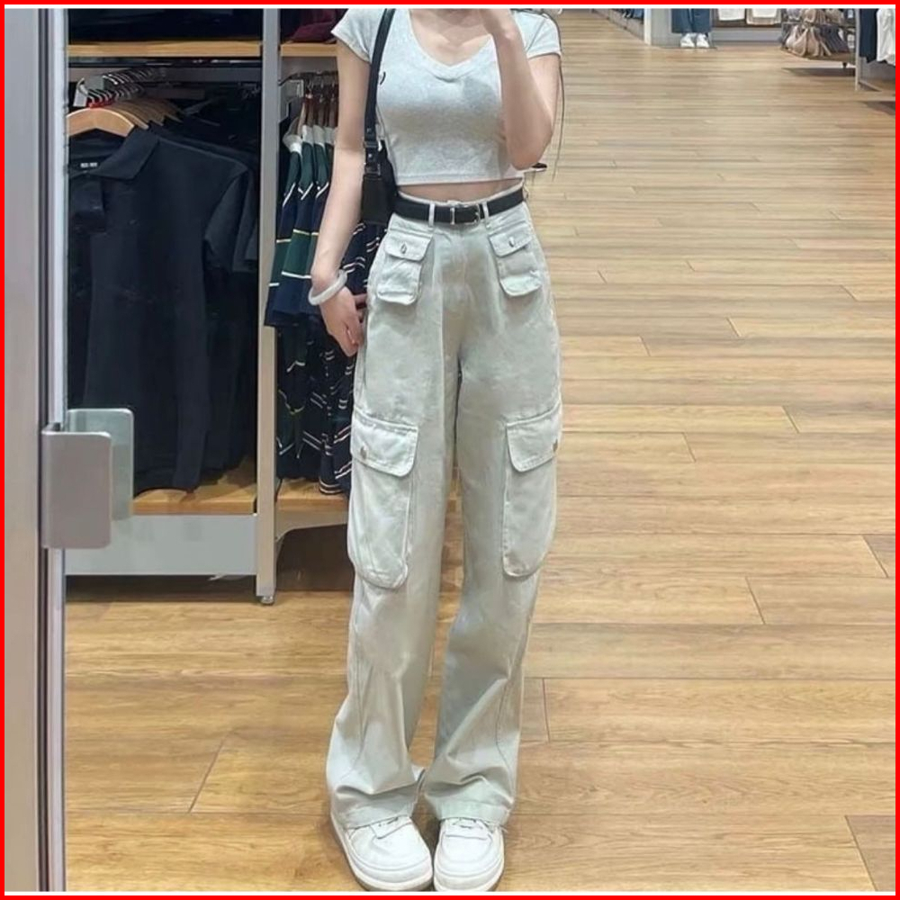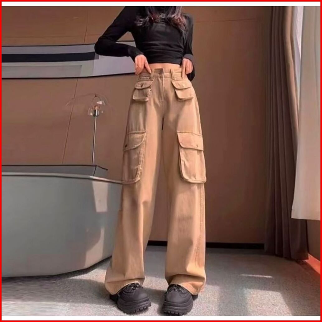 Kargo Denim Pasir Putih Celana Highwaist Loose Jeans Wanita Celana Panjang Wanita
