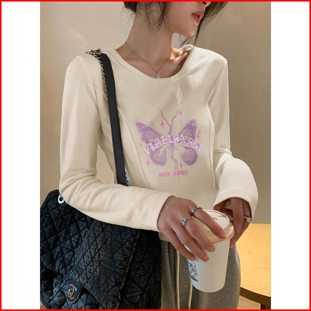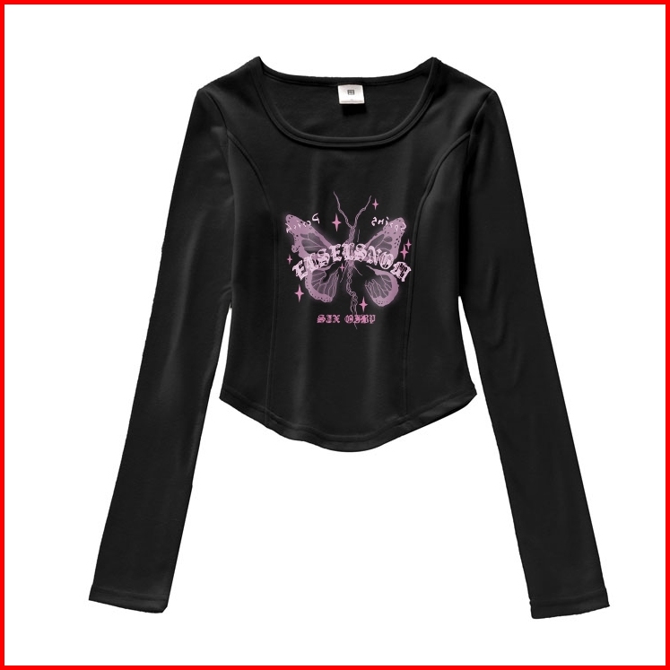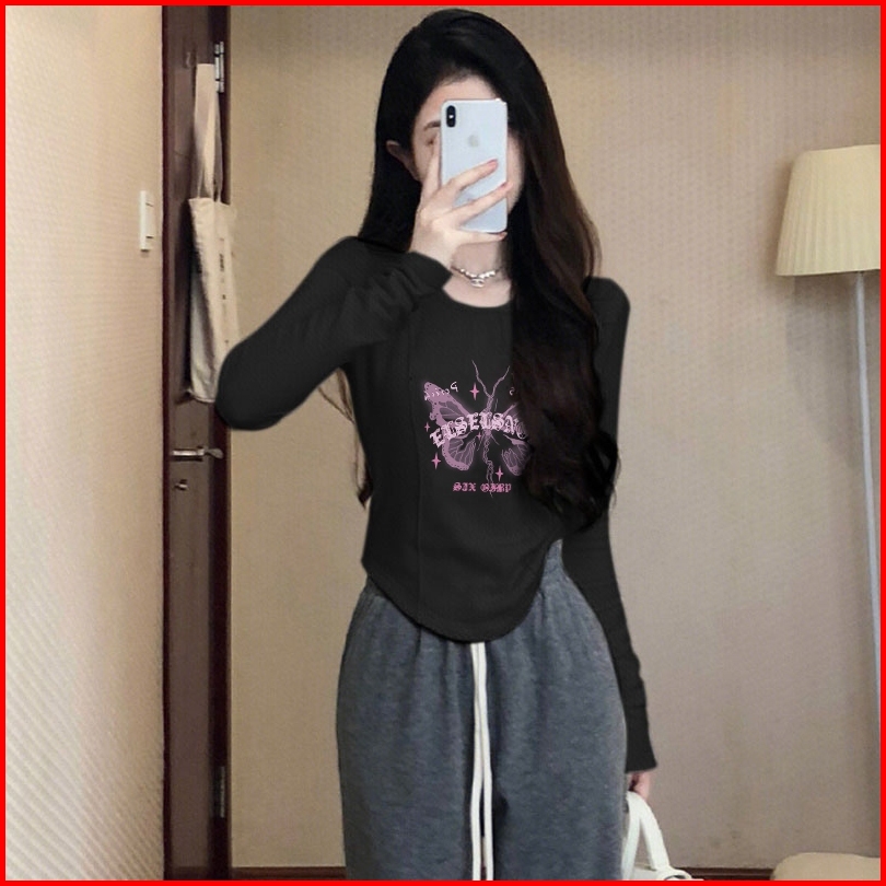 Demero Baju Atasan Wanita Terbaru Korean Style Peri Kupu-kupu Merah Muda Crop Top Lengan Panjang Baju Kaos Wanita Ketat