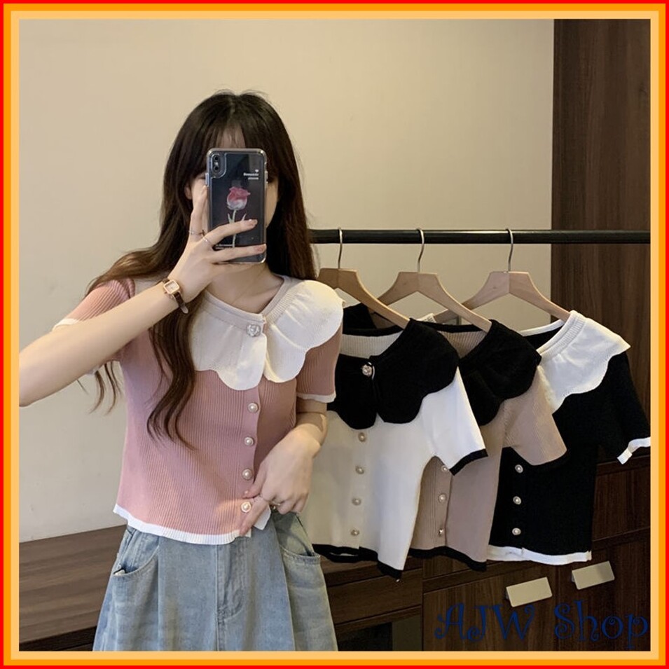 Ajw Atasan Kemeja Knit Kerah Renda Korean Style Hba Baju Wanita Lengan Pendek Crop Top Kerah Renda Kekinian Atasan Wanit