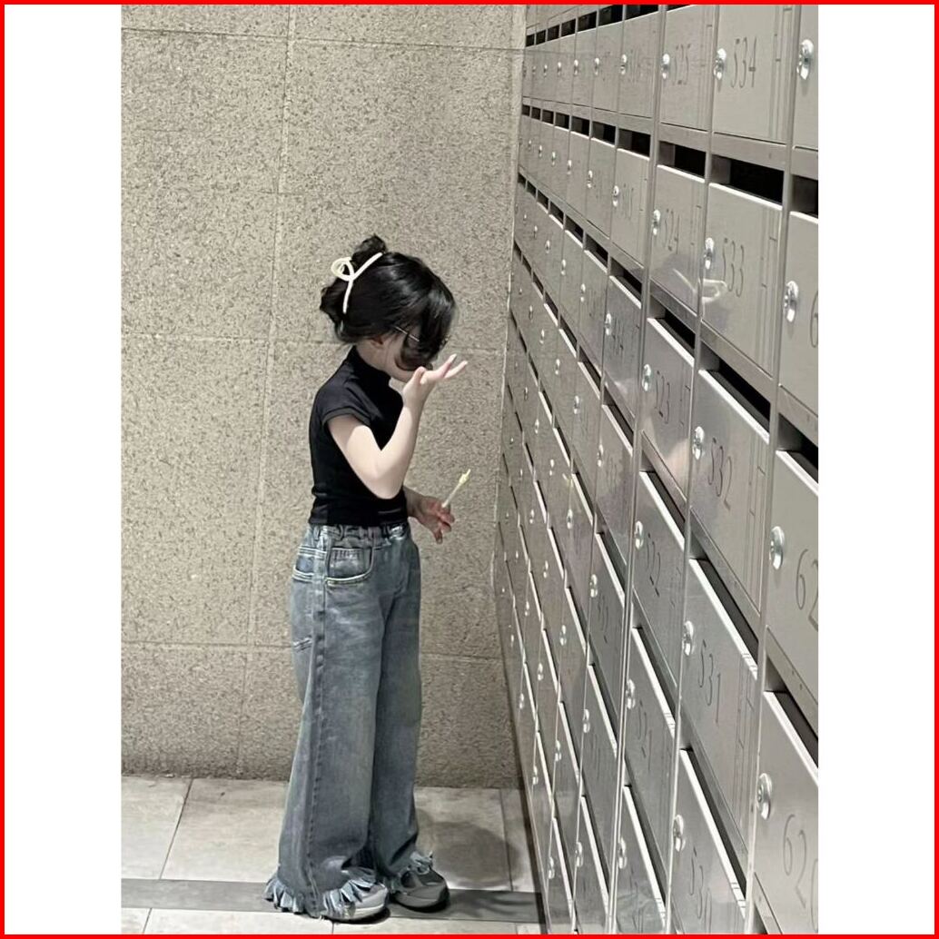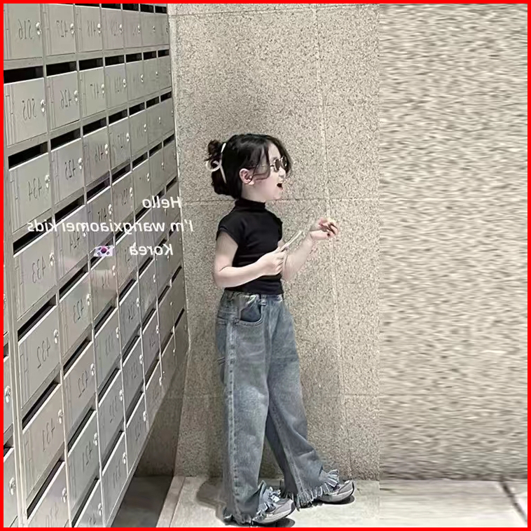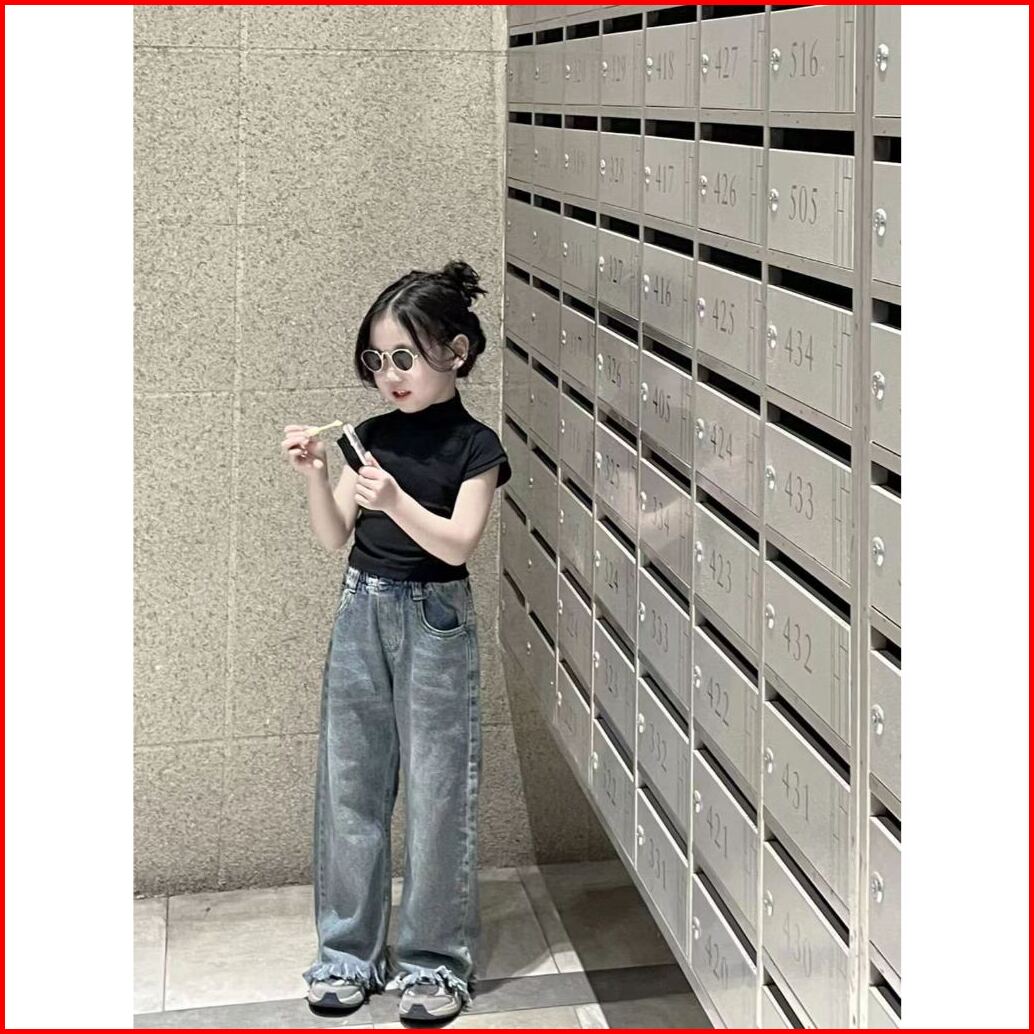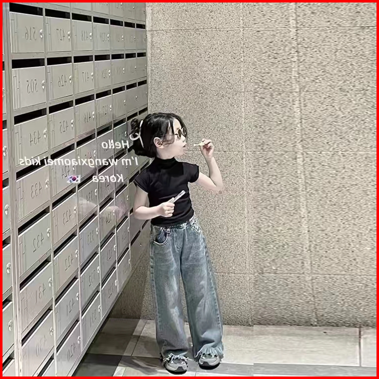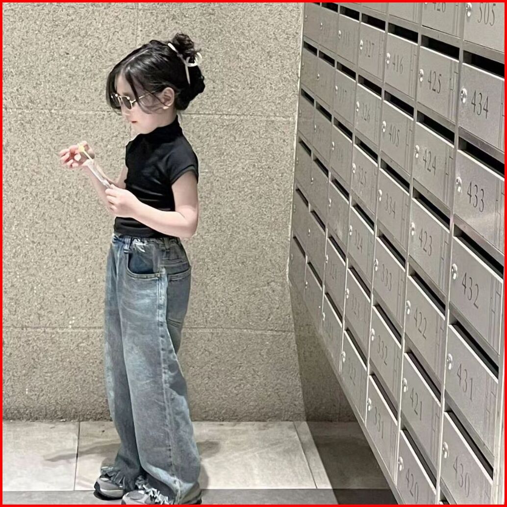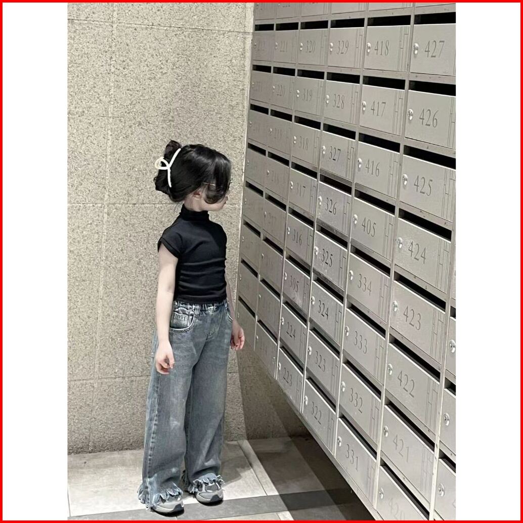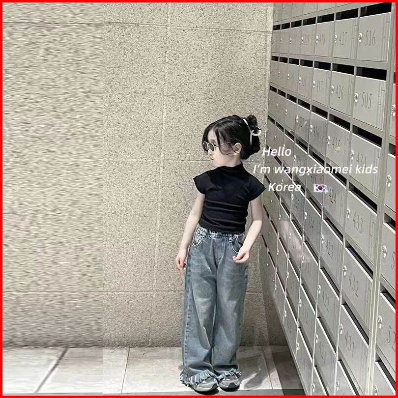 Setelan Turtleneck Hitam Lengan Pendek Jeans Loose Baju Anak Perempuan One Set Bahan Katun Korean Style