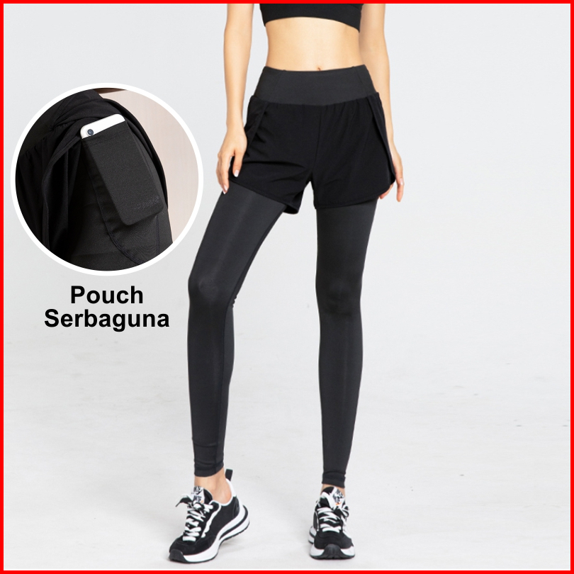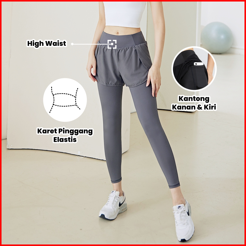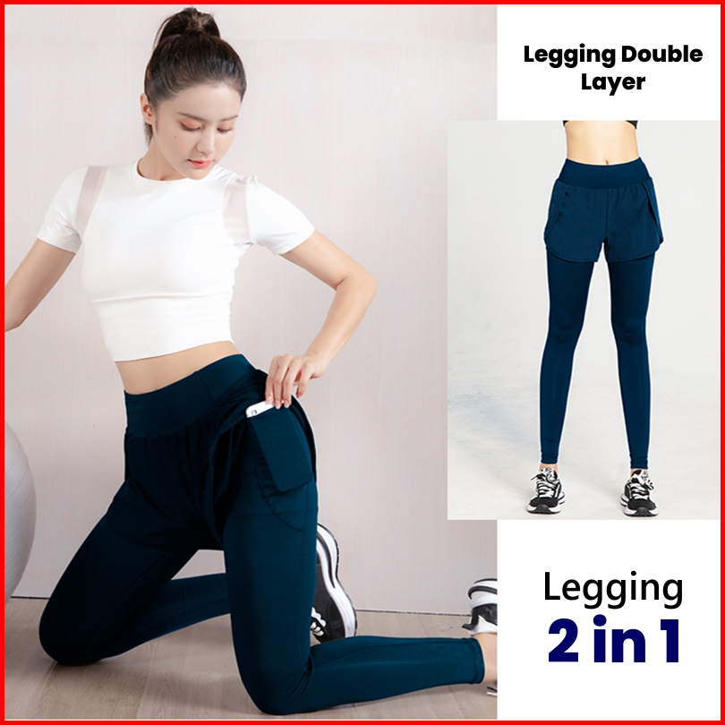 Celana Pendek Olahraga Highwaist 2 In 1 Legging Sportwear For Yoga Booty Gym Legging Double Layer Wanita Tebal Premium S