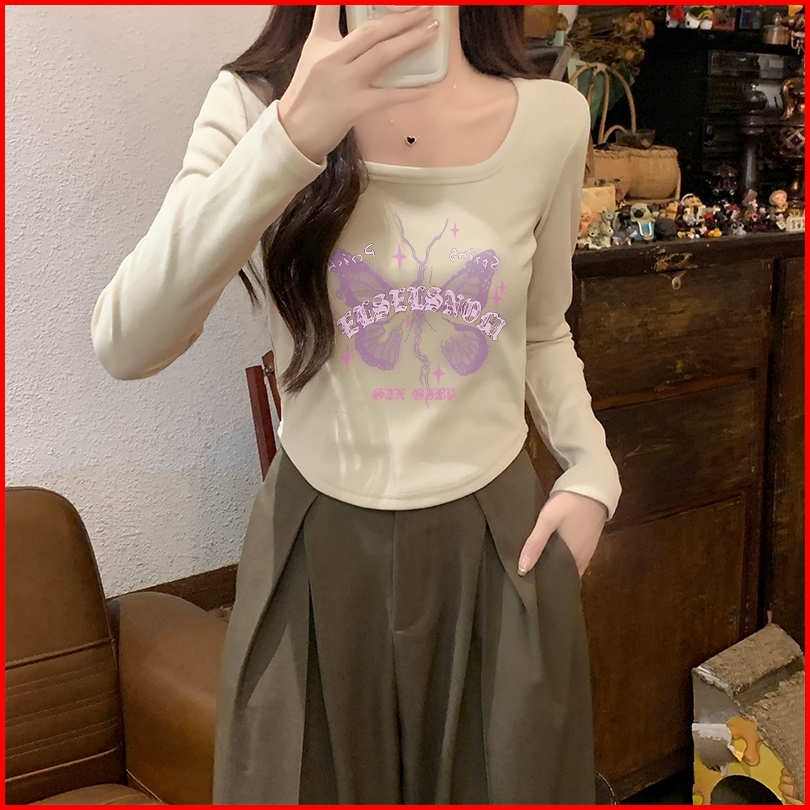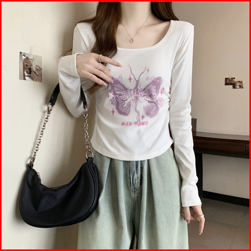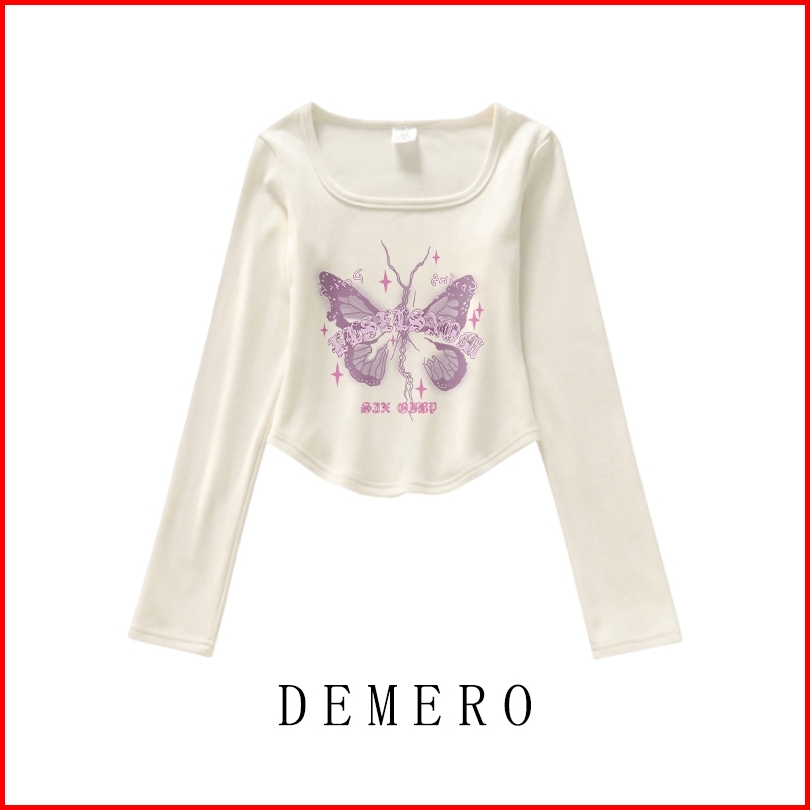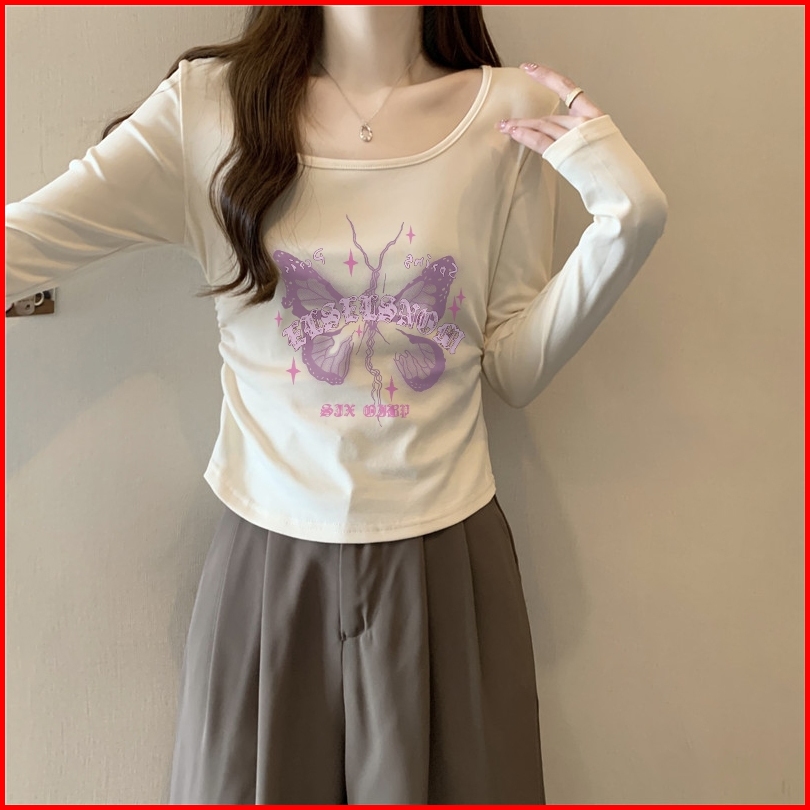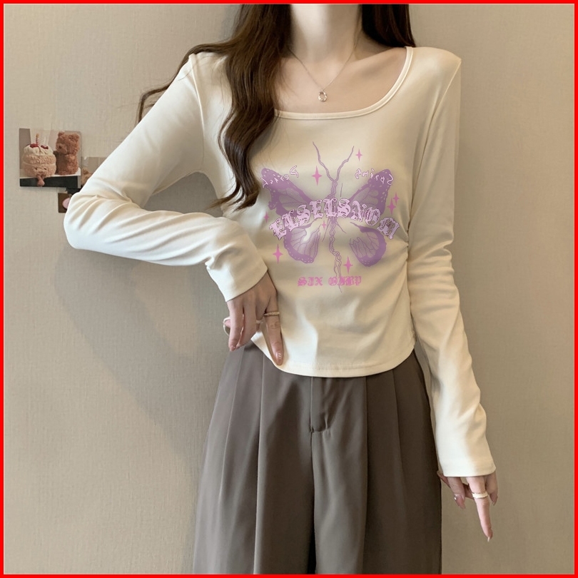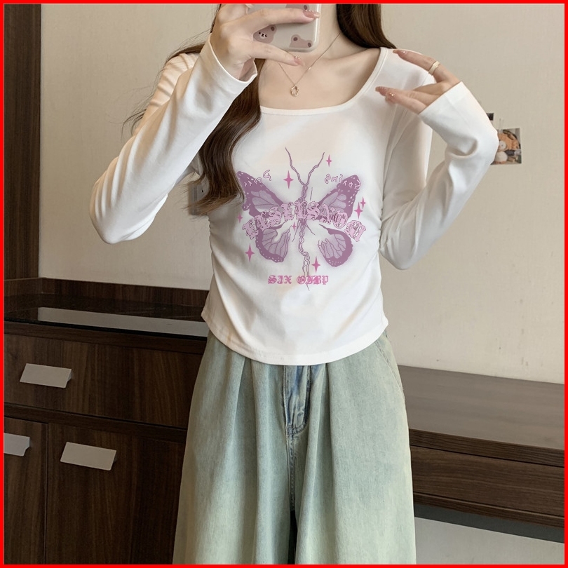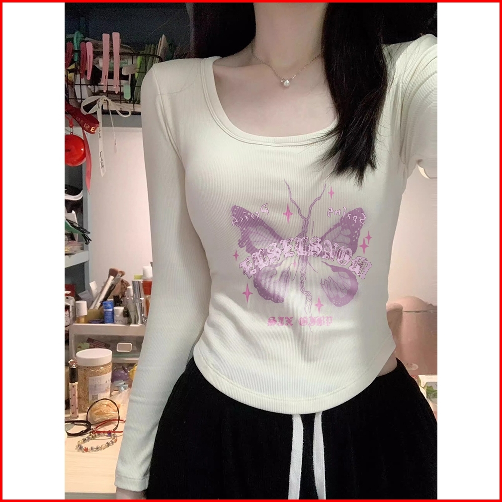 Demero Baju Atasan Wanita Terbaru Korean Style Kupu-kupu Merah Muda Yang Bergaya Crop Top Lengan Panjang Cashmere Baju K