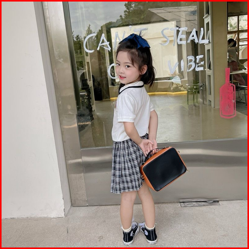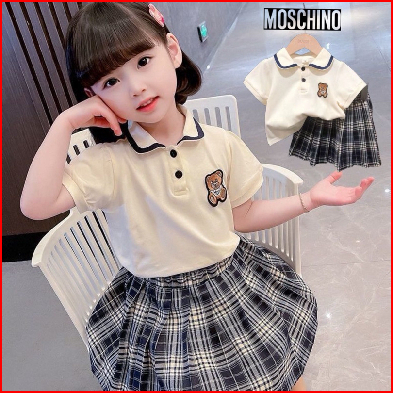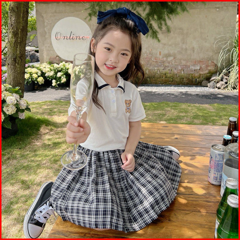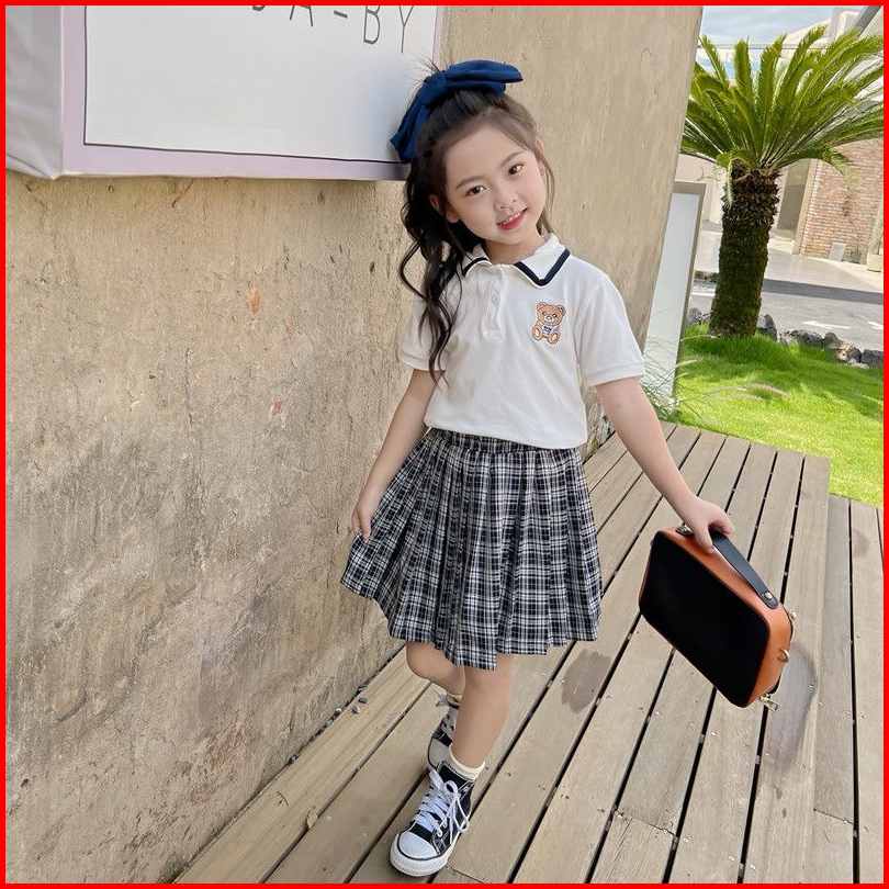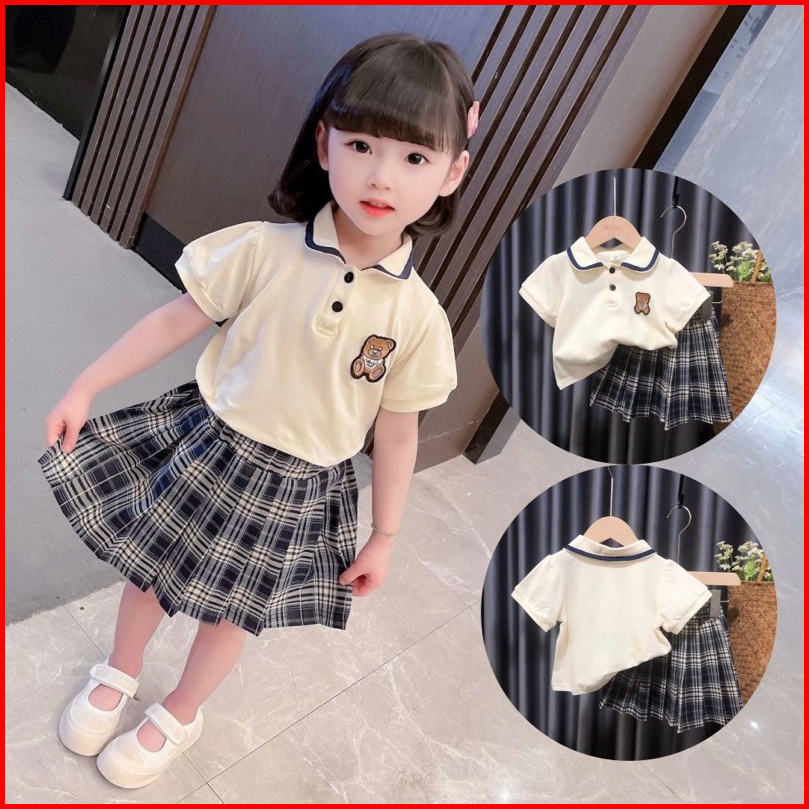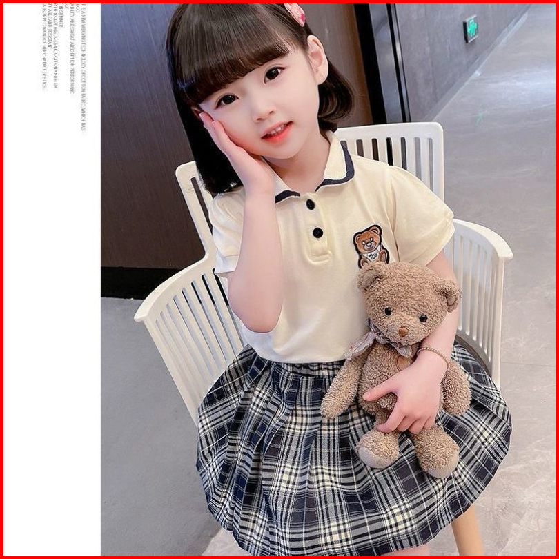 2-10tahun Setelan Rok Kotak Baju Polo Beruang Anak Perempuan Cantik