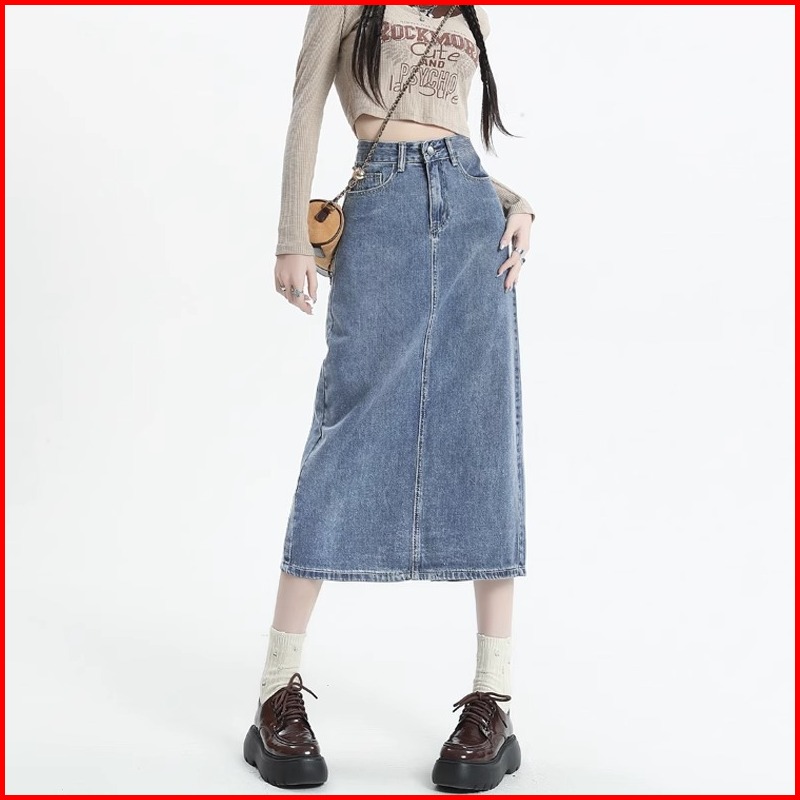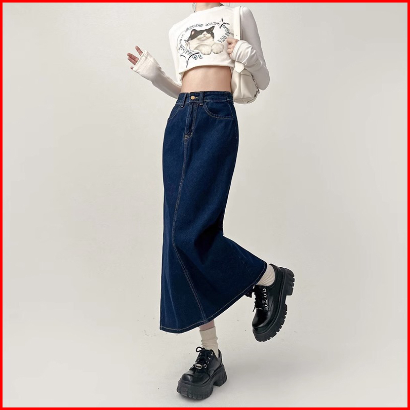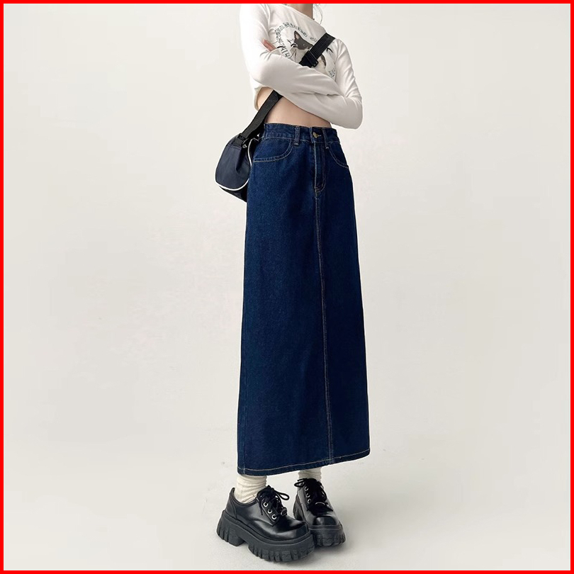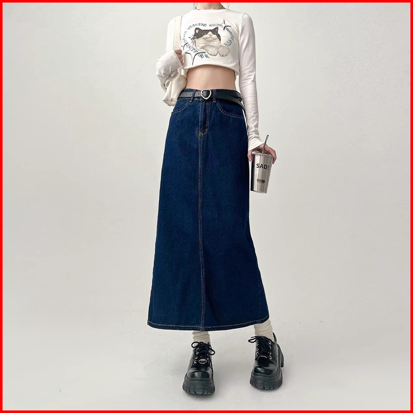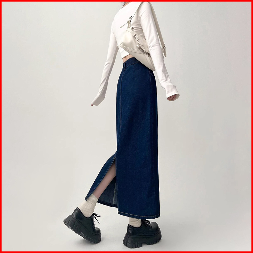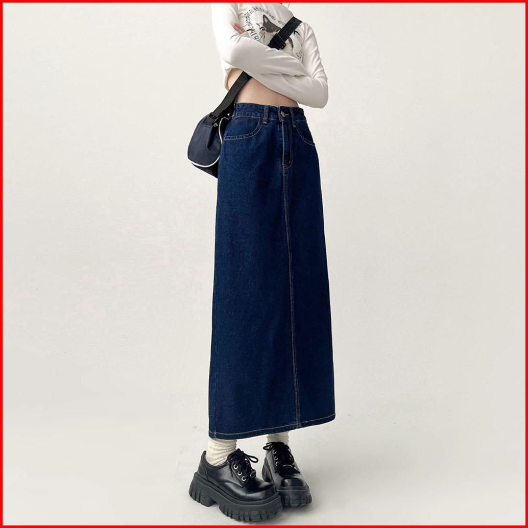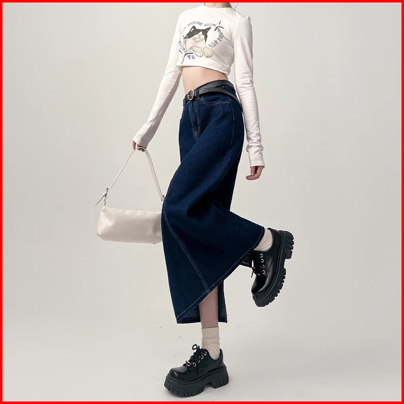 Rok Denim Split Gaya Korea Rok A-line Wanita Biru Tua
