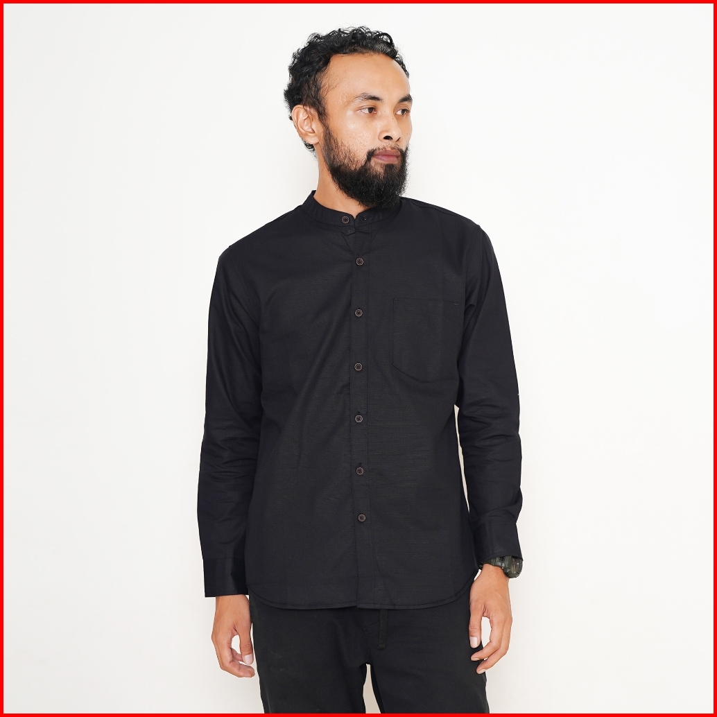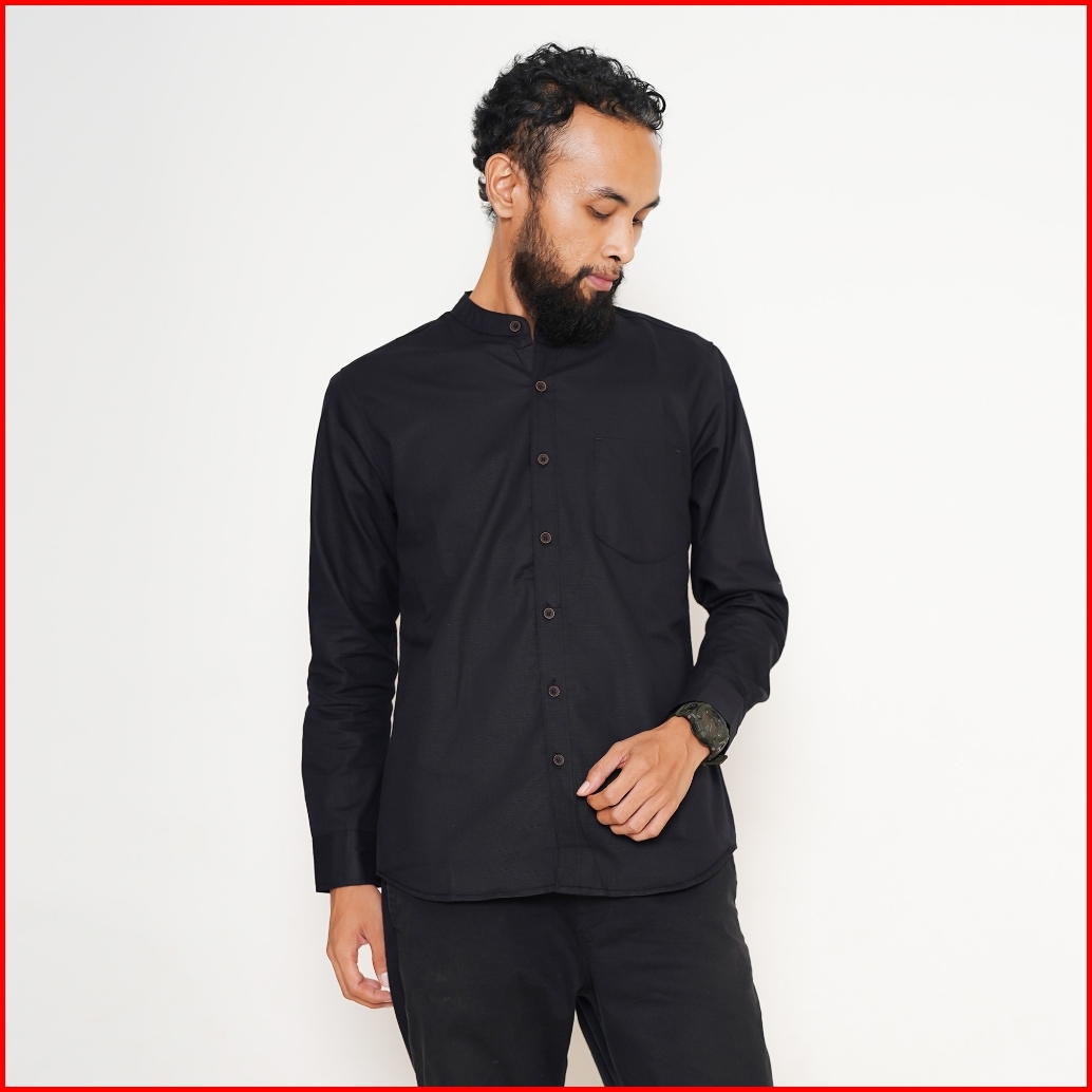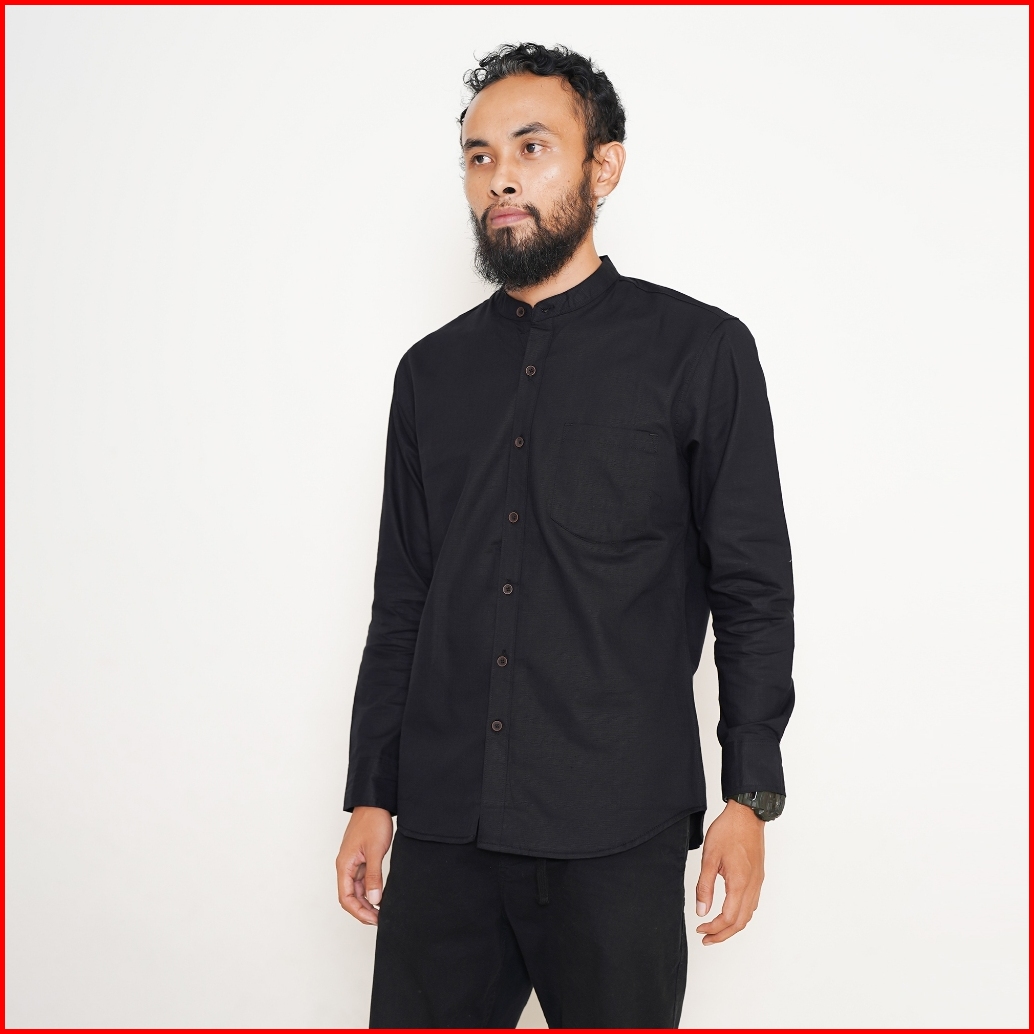 Bonang In Style - Kemeja Koko Kemko Polos Pria Lengan Panjang Bahan Katun Warna Hitam