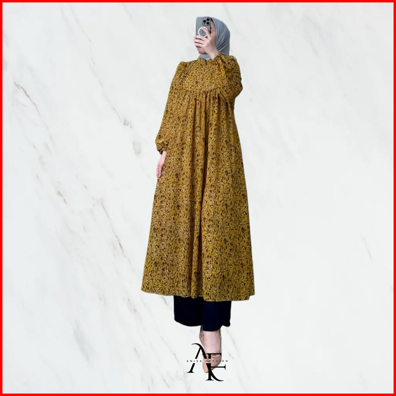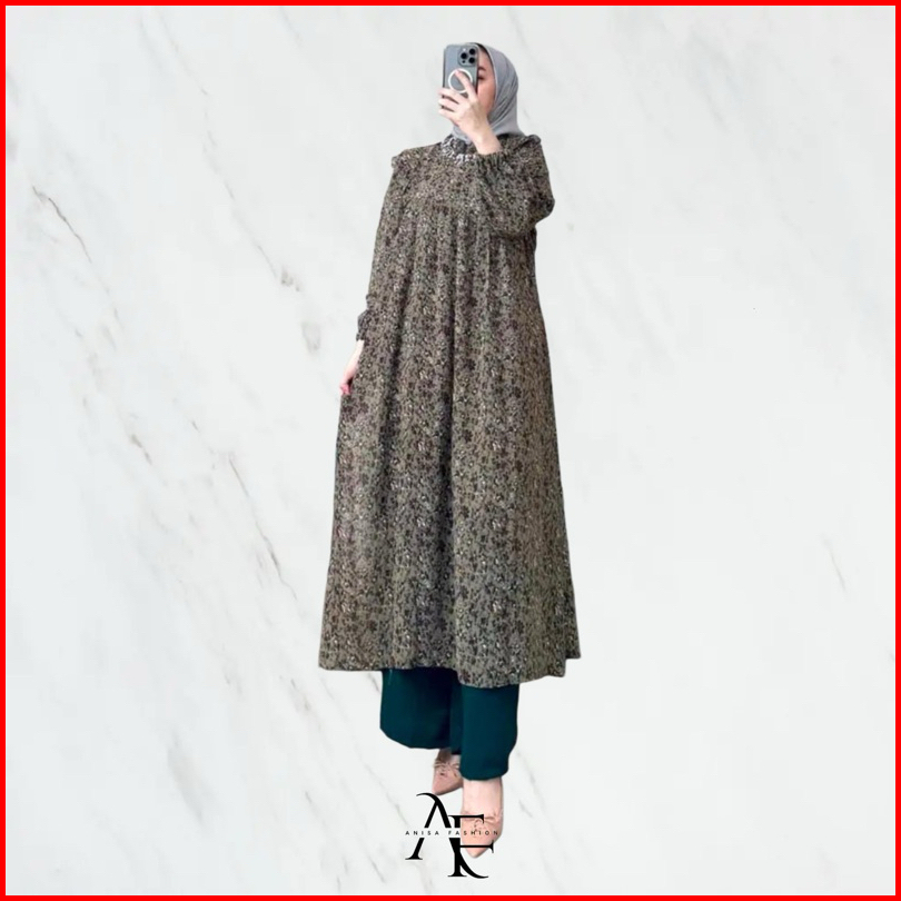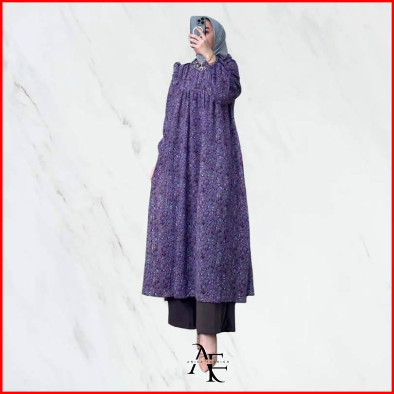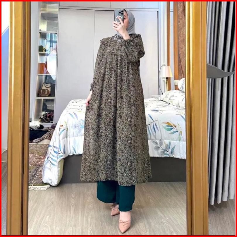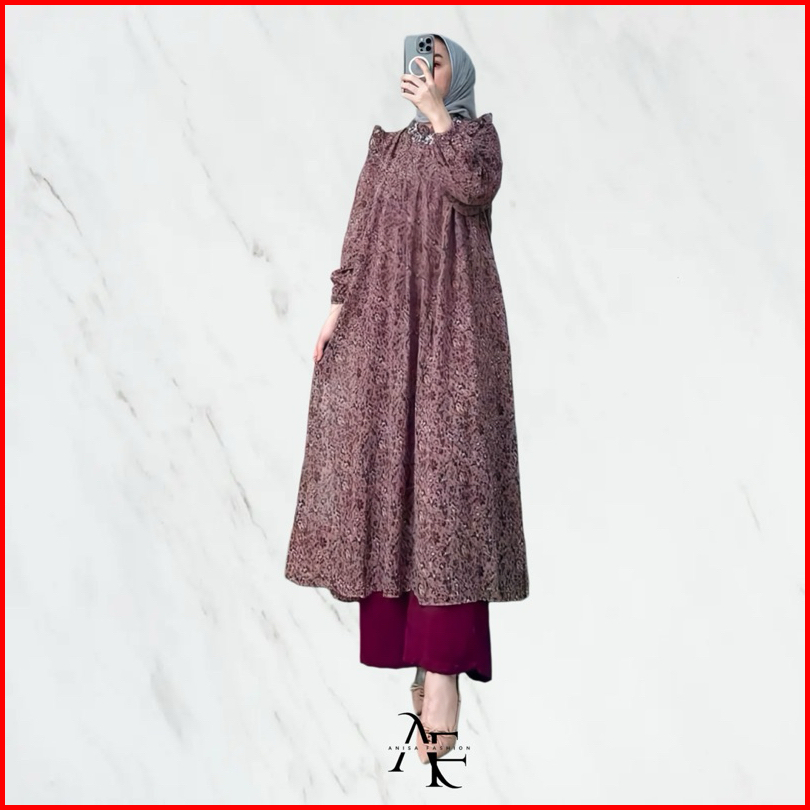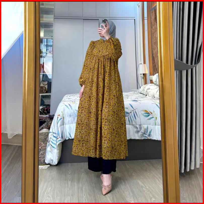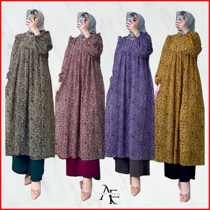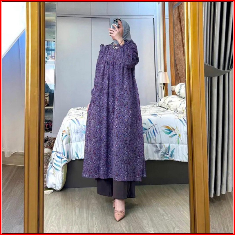 One Set Nirmala Viral Tunik Ceruty Full Furing Ld 110 Cm - Setelan Tunik Ceruty Motif Bunga New Celana Crinkle - Setelan