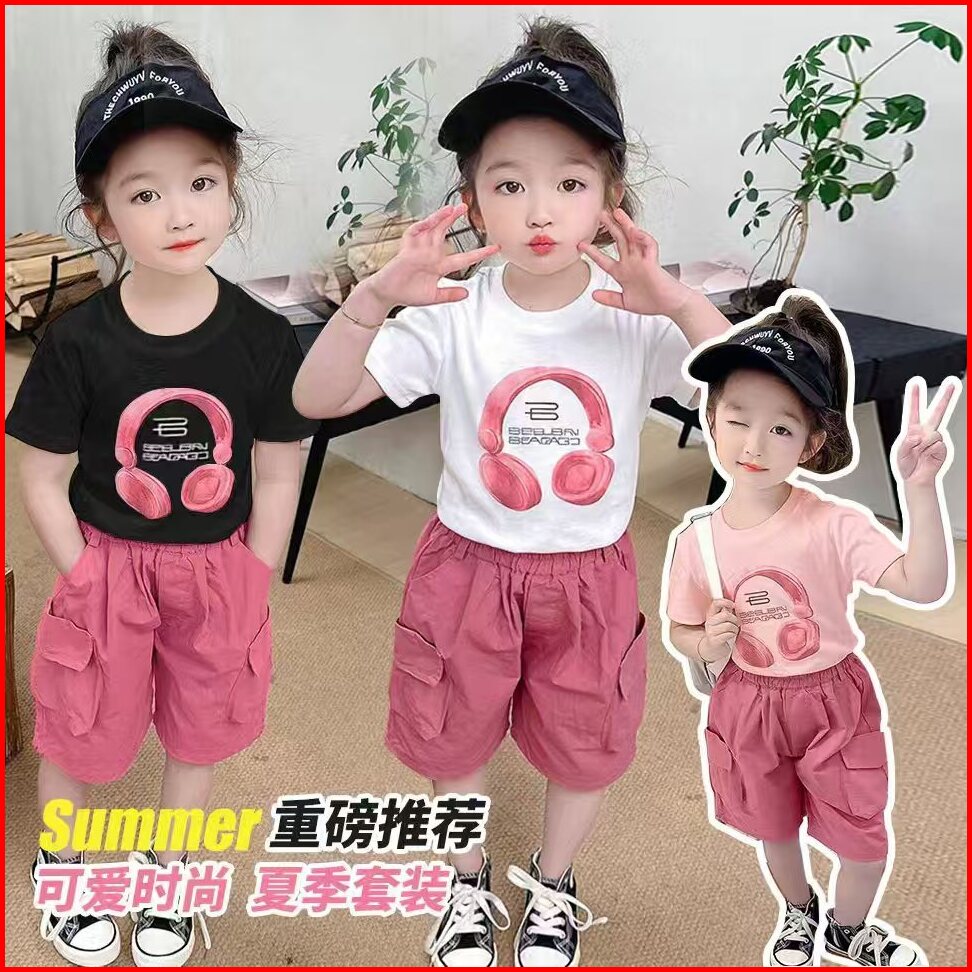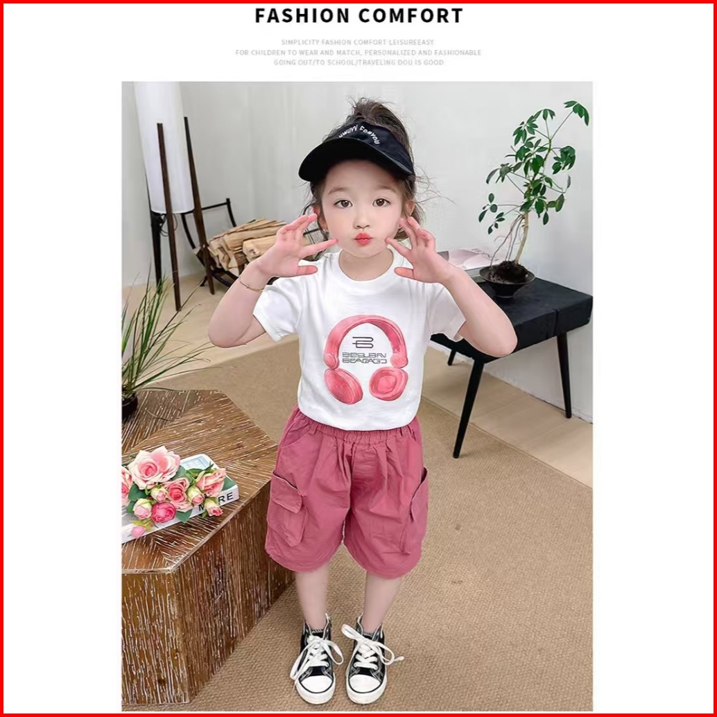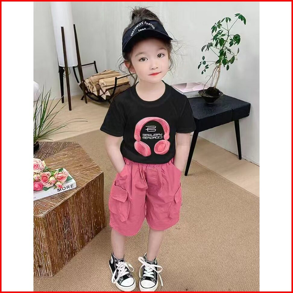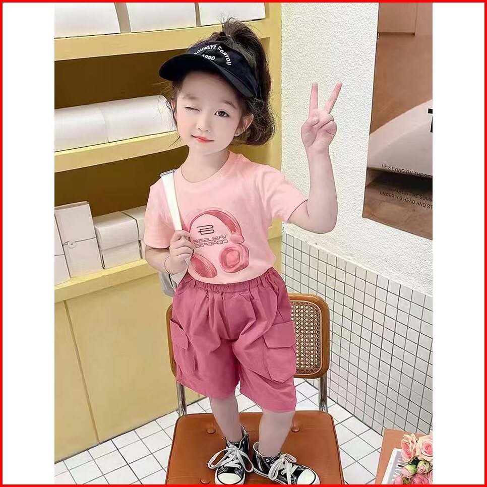 Baju Setelan Anak Perempuan Kaos Celana Pendek Pink Music Set Baju Kasual Anak Cewek Uisa1-5th