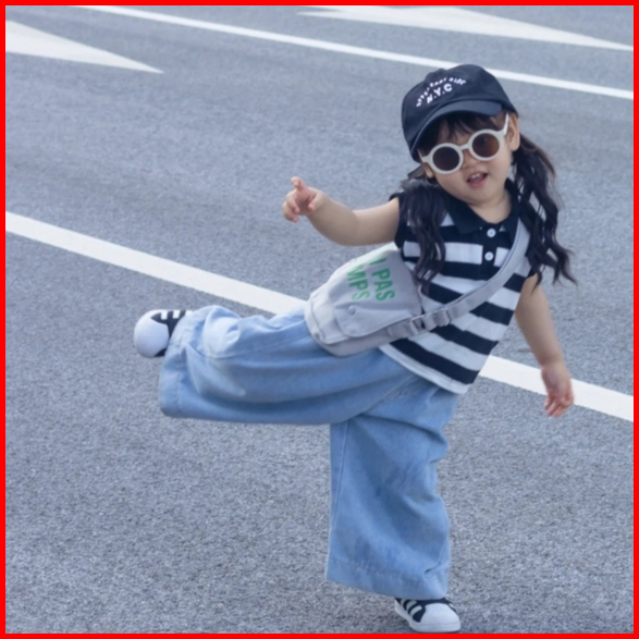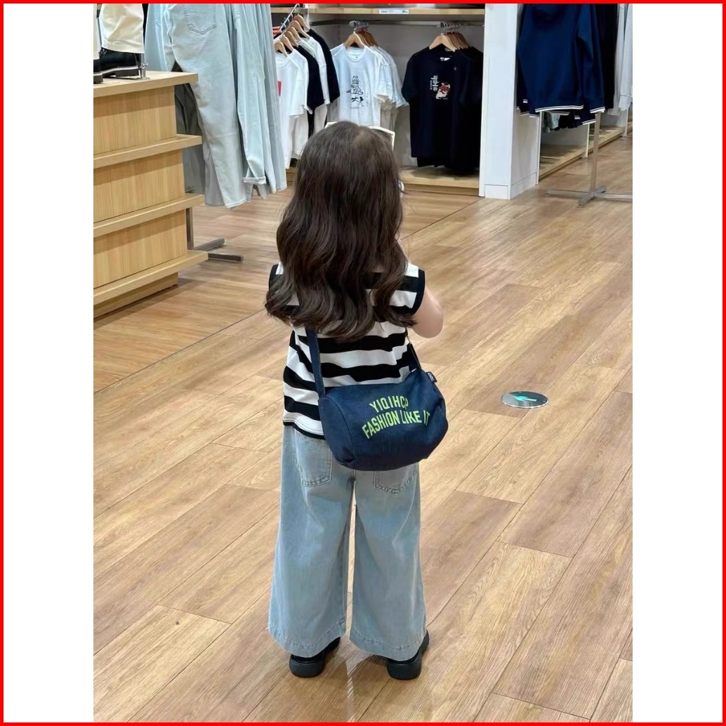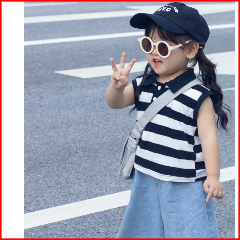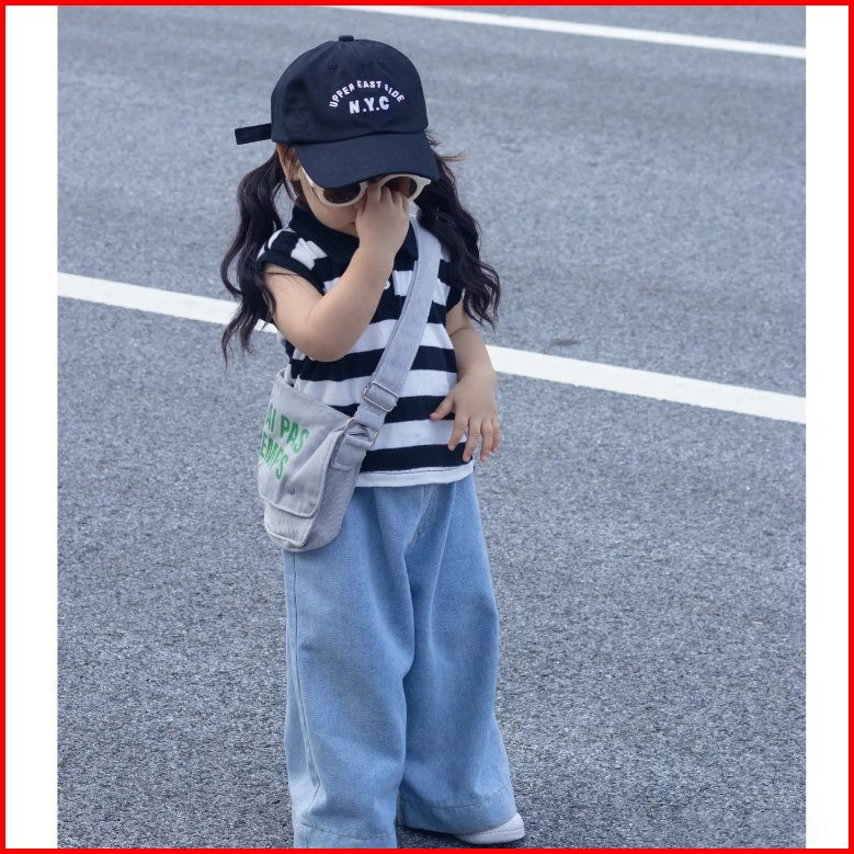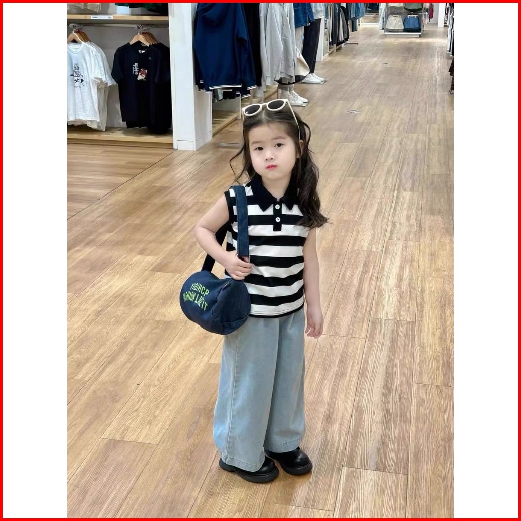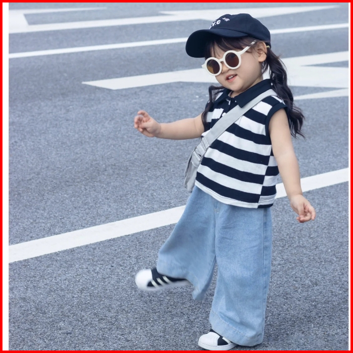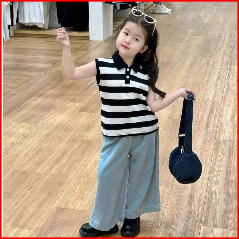 One Set Celana Jeans Anak Permpuan Setelan Anak Cewek Polo Striped T-shirt Tanpa Lengan Celana Jeans Anak Cewek Setelan