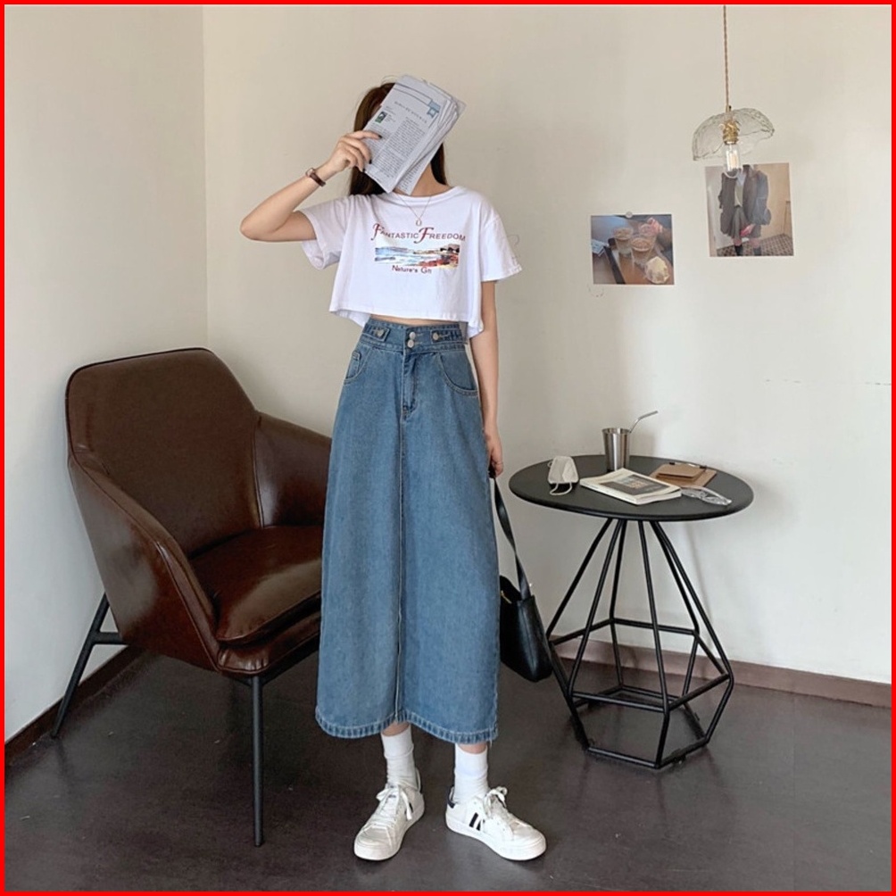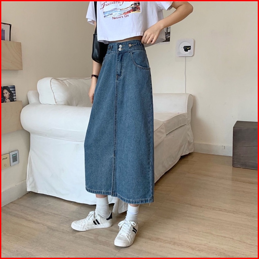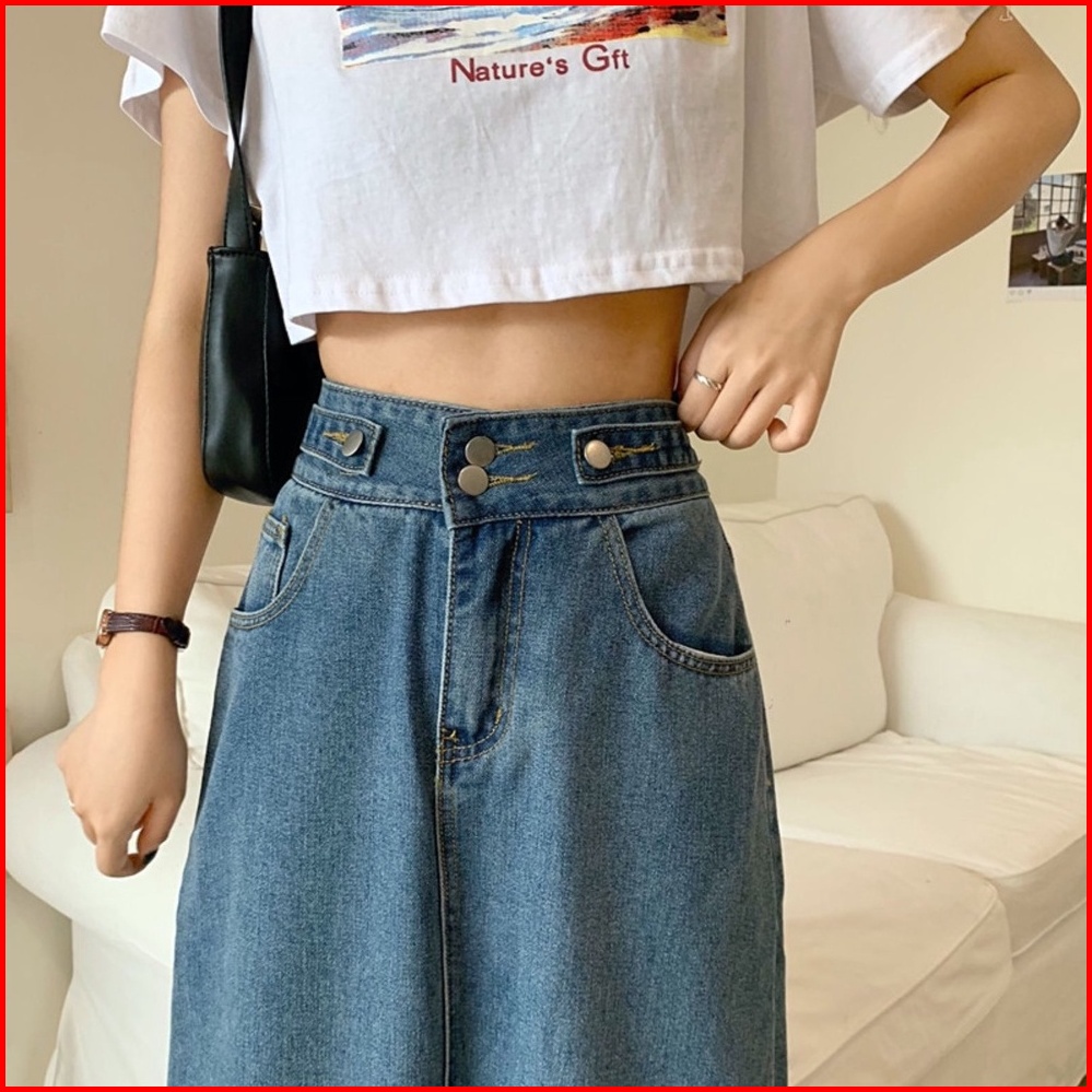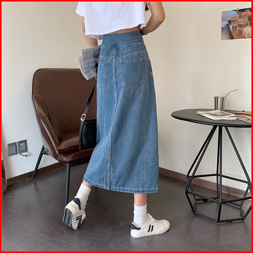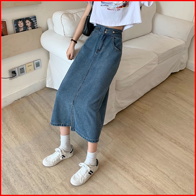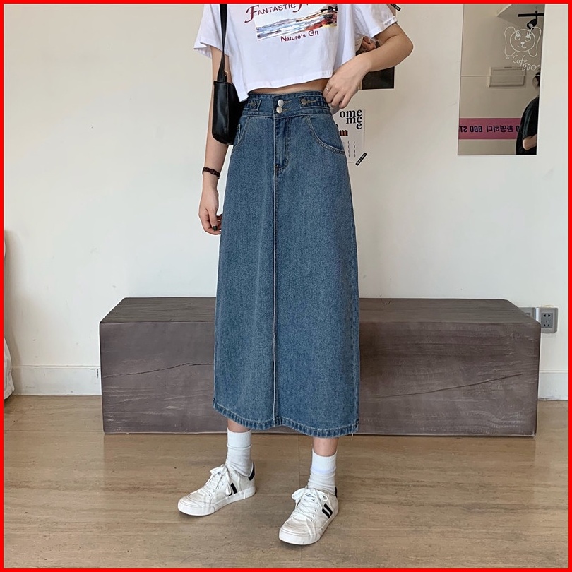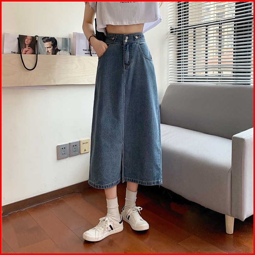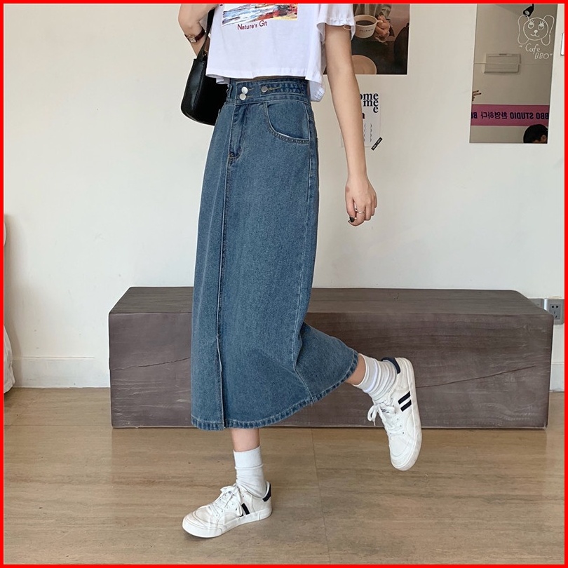 Korean Style Rok Pendek Jeans Wanita Denim Pinggang Tinggi Rok Panjang